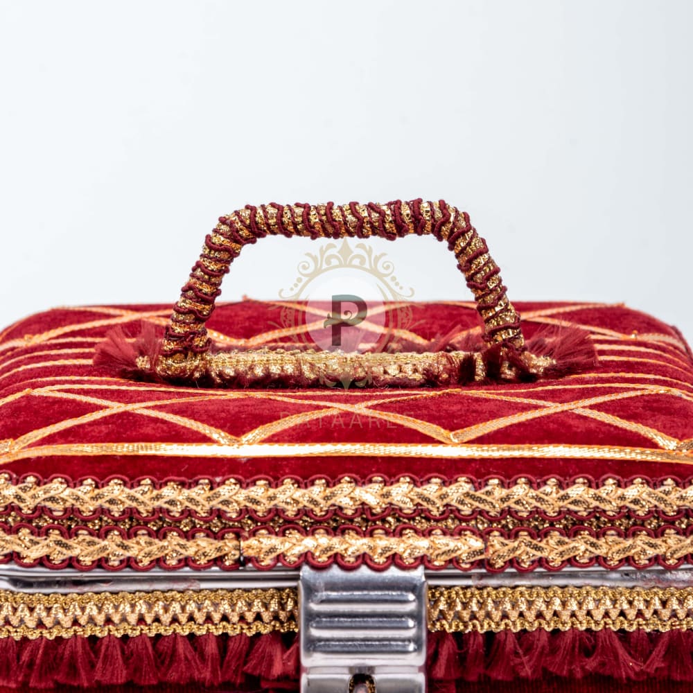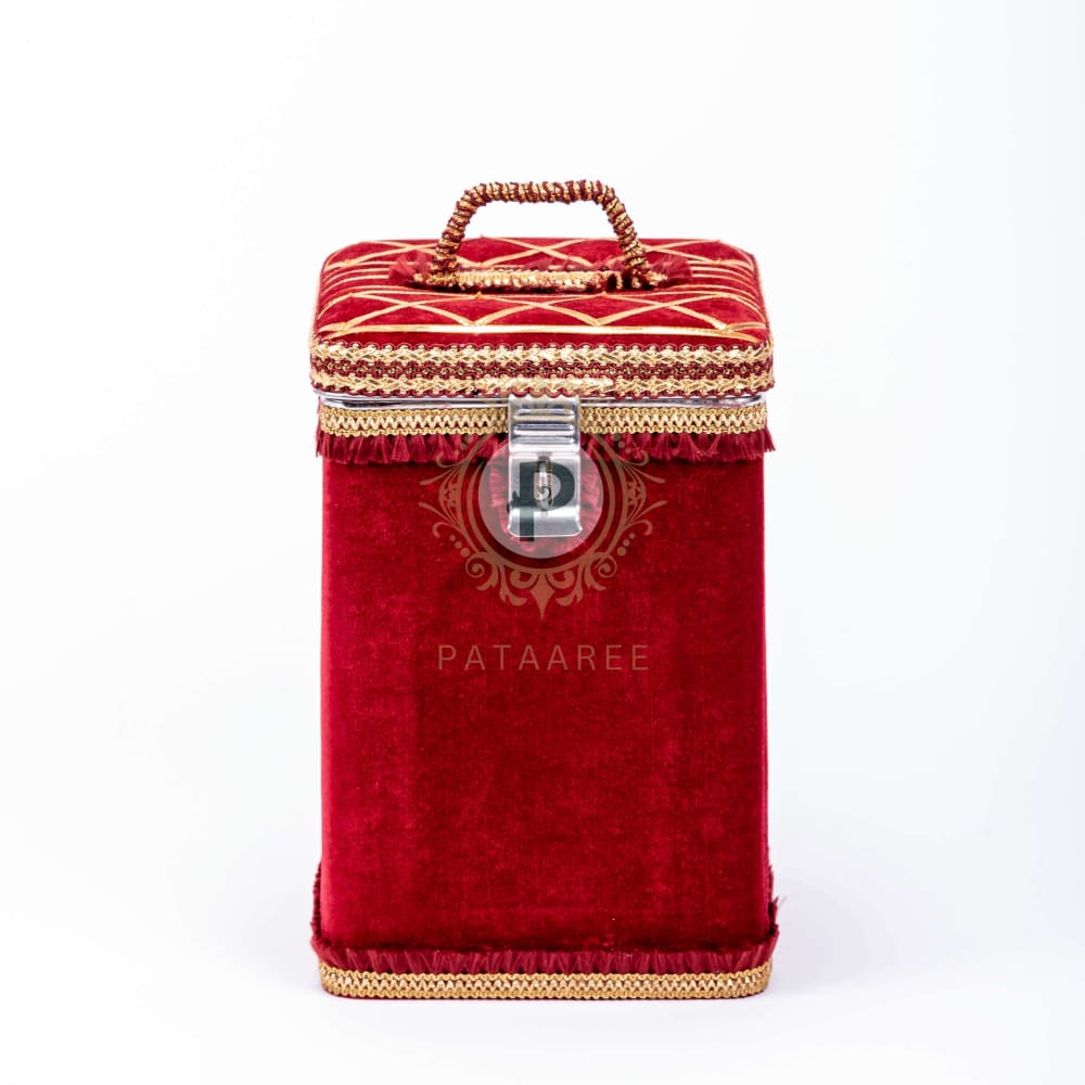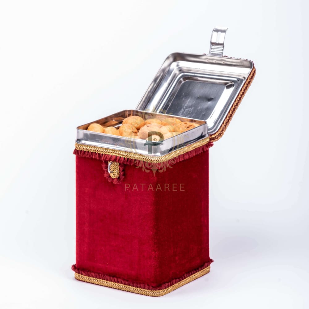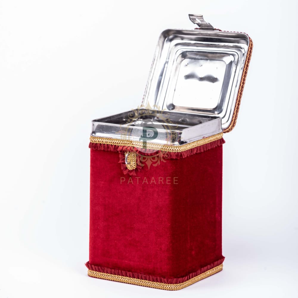 Our maroon velvet bhaji box is a stylish revamp of the mundane steel tall laddoo/bhaji box, also called ‘Pippa’ in Punjabi. Load it with mithai - 3 to 5 kilos - and present or gift it.