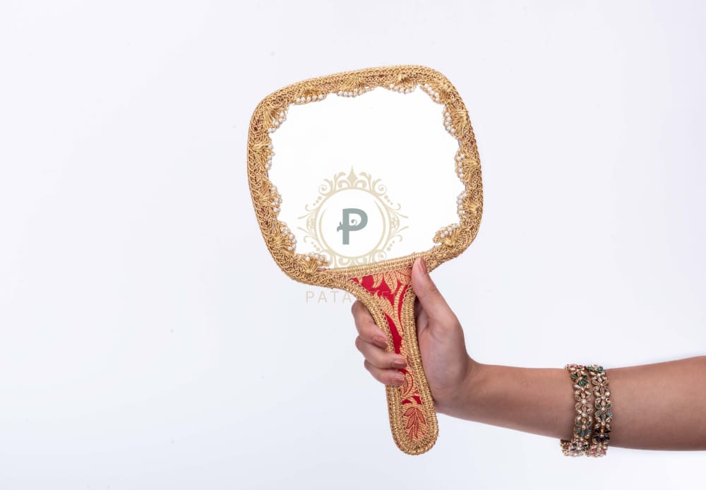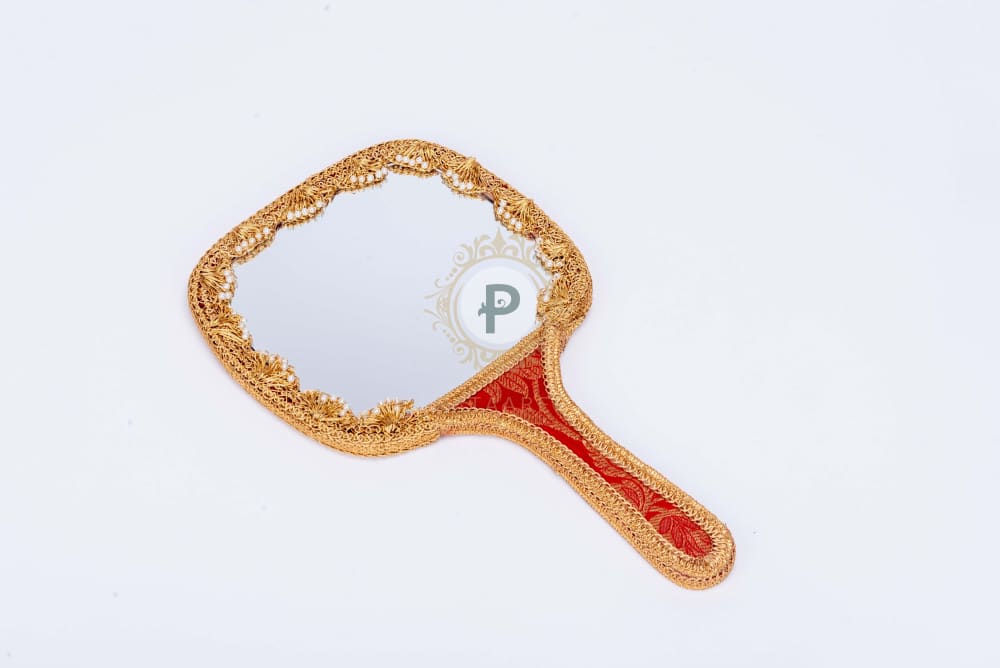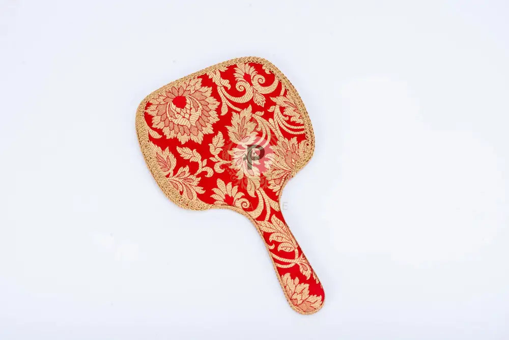 Complete the bridal make up collection with our vintage inspired big hand mirror in lovely red brocade with gold trims.