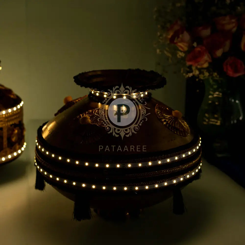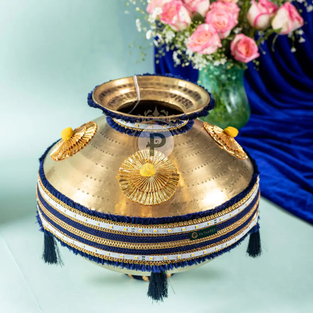 The traditional touch of gold of the brass, the royal navy blue trims wrapped around in stylish layers, and the golden phull acting as marvelous highlighters in this stunning looking blue brass jaago matka - lend that head turning look to your jaago ceremony, pick your matka today.