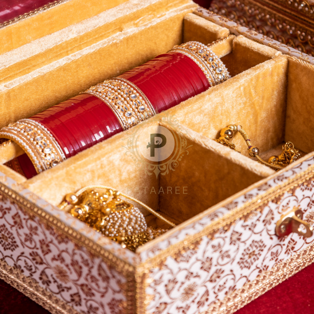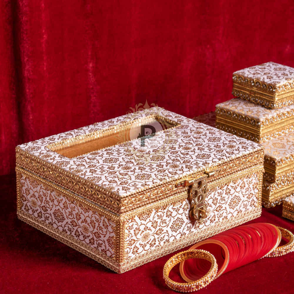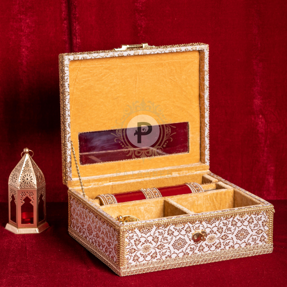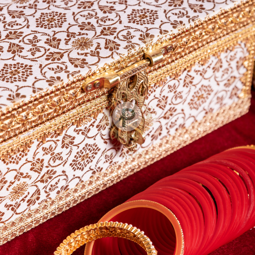 Well, if the nankas (maternal side of the family) want to make a memorable entry at the chura ceremony, then they should go for our masterfully crafted gold brocade chura kaleera box spacious enough to hold a full chura and kaleera set for the bride. Go ahead, make a fashionable presentation with this one of a kind handcrafted box. Pick yours now.