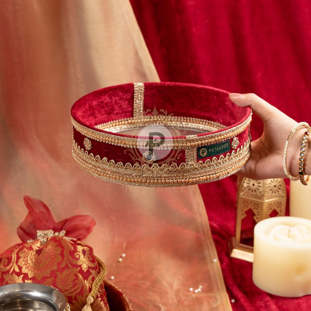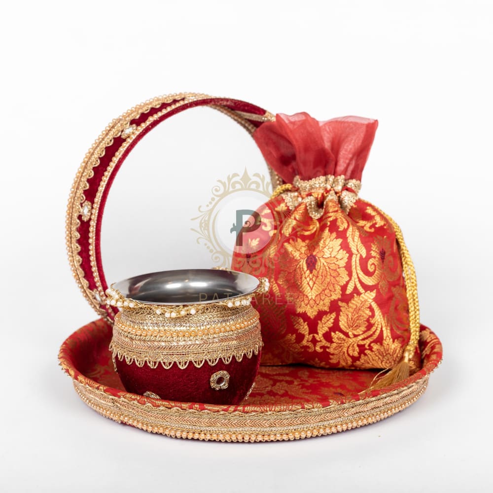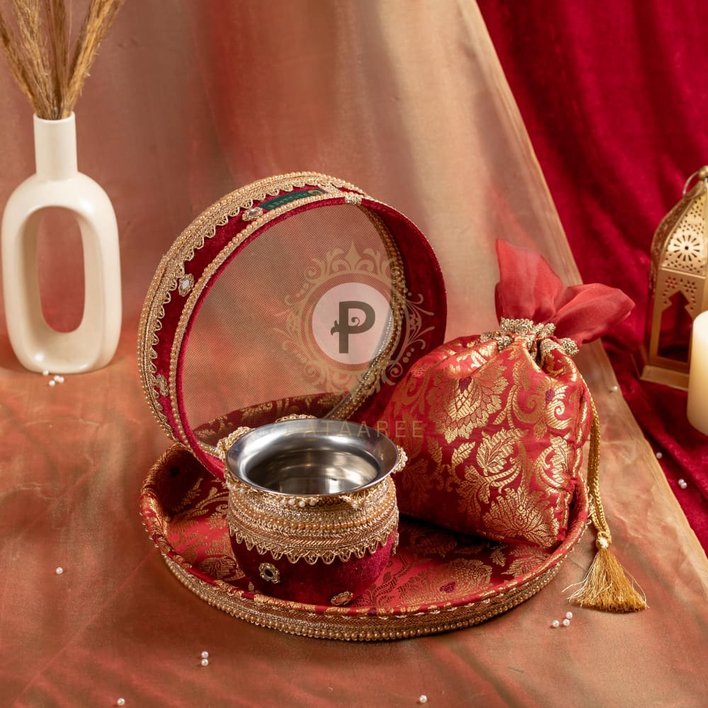 Enhance your Karwa Chauth rituals with our exquisite set, featuring a thaal, gadvi, channi, and potli. Covered in rich maroon brocade fabric with matching velvet and gota work, adding a touch of tradition and luxury. Perfect for Karwa Chauth, this set ensures your celebrations are both stylish and meaningful.