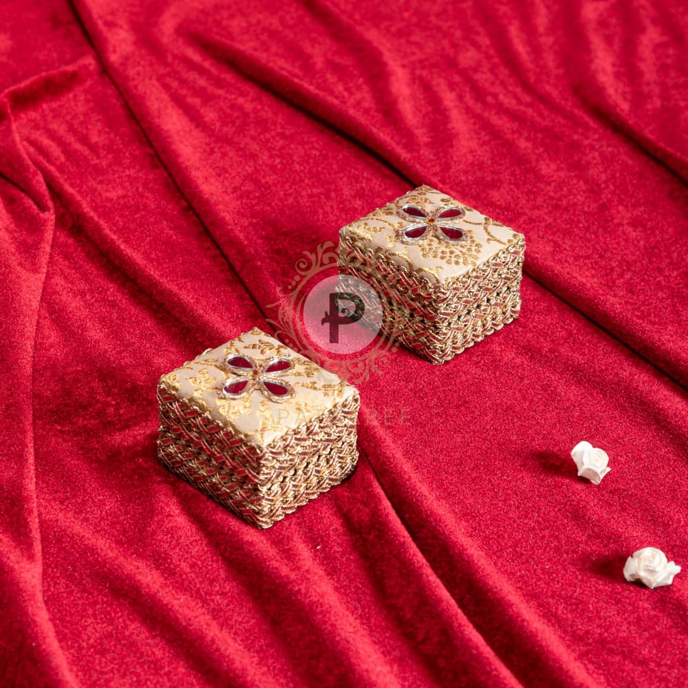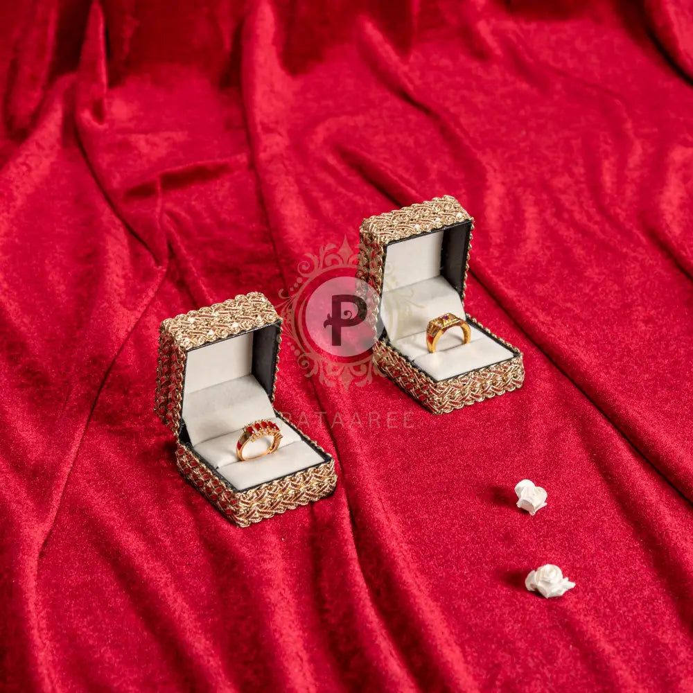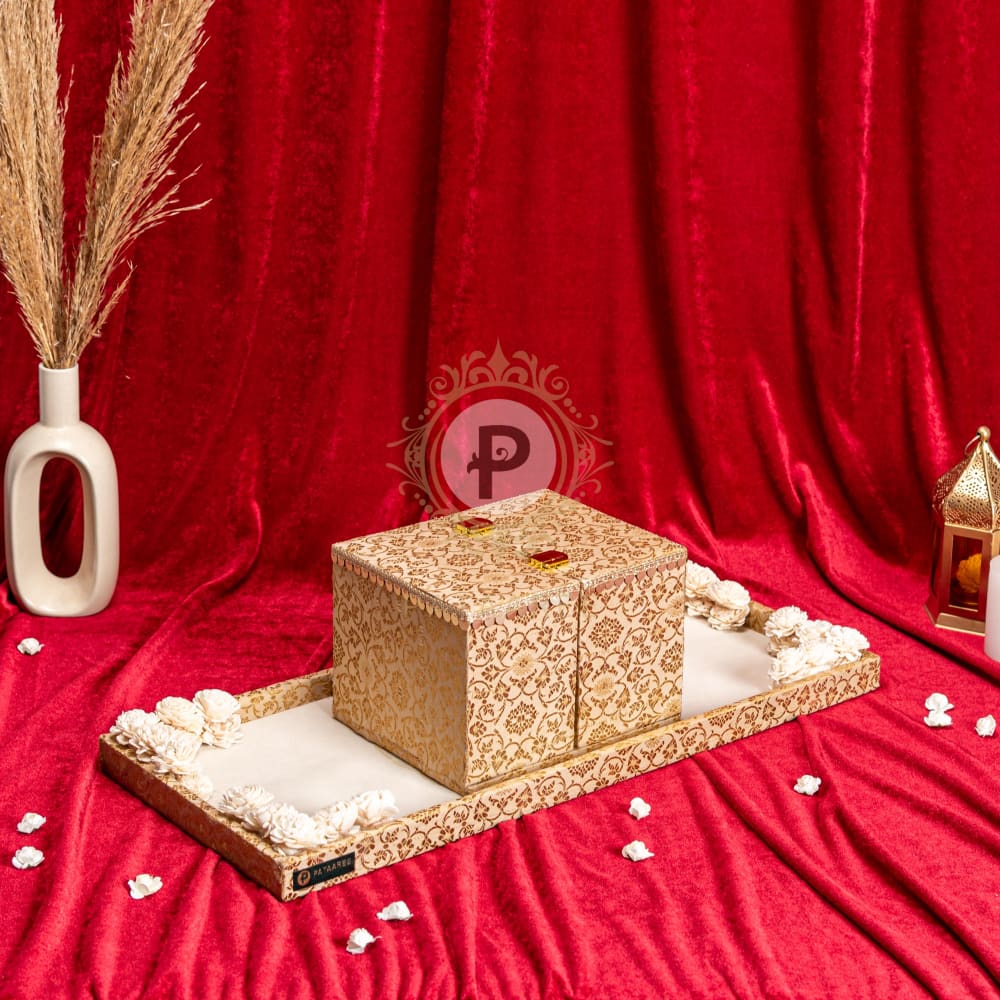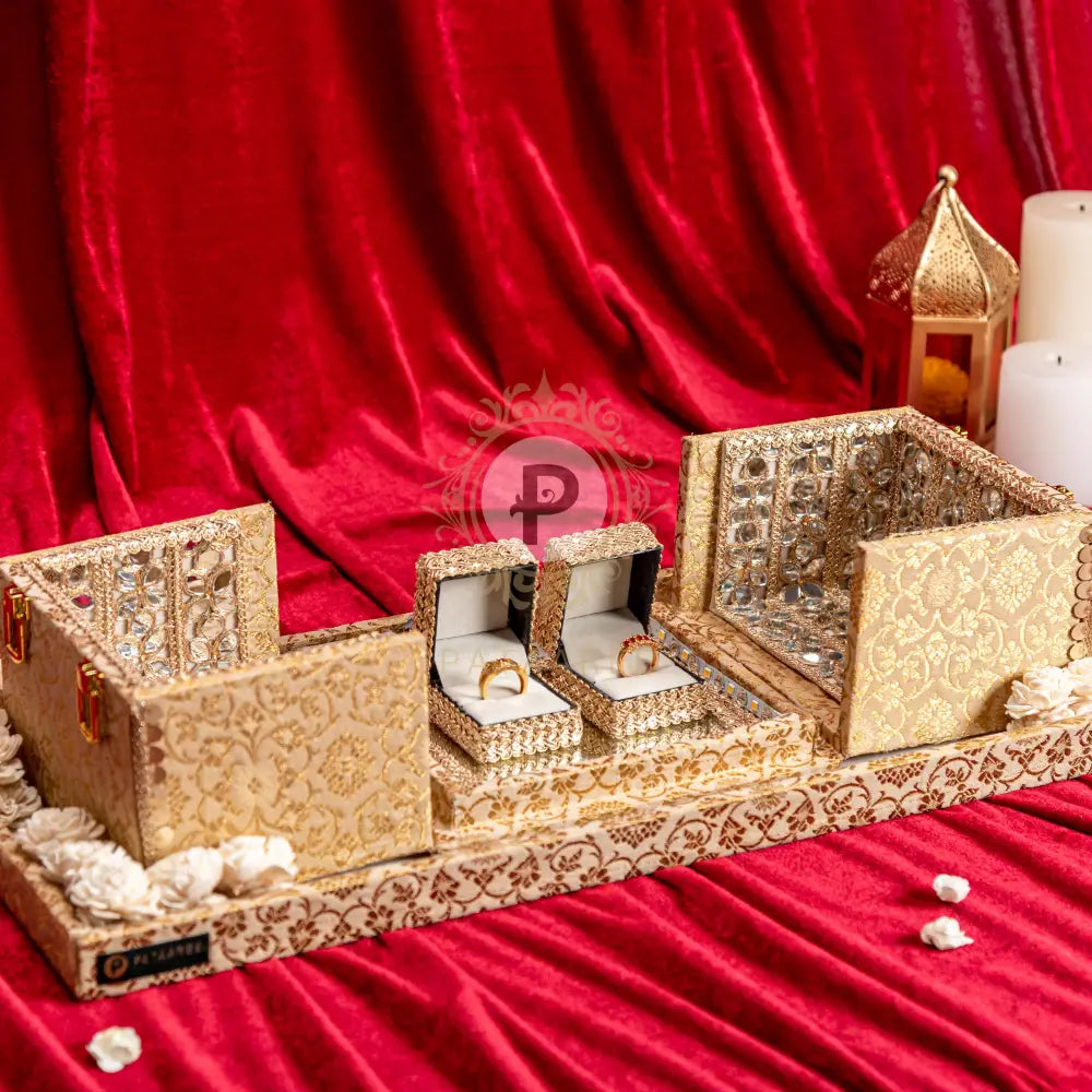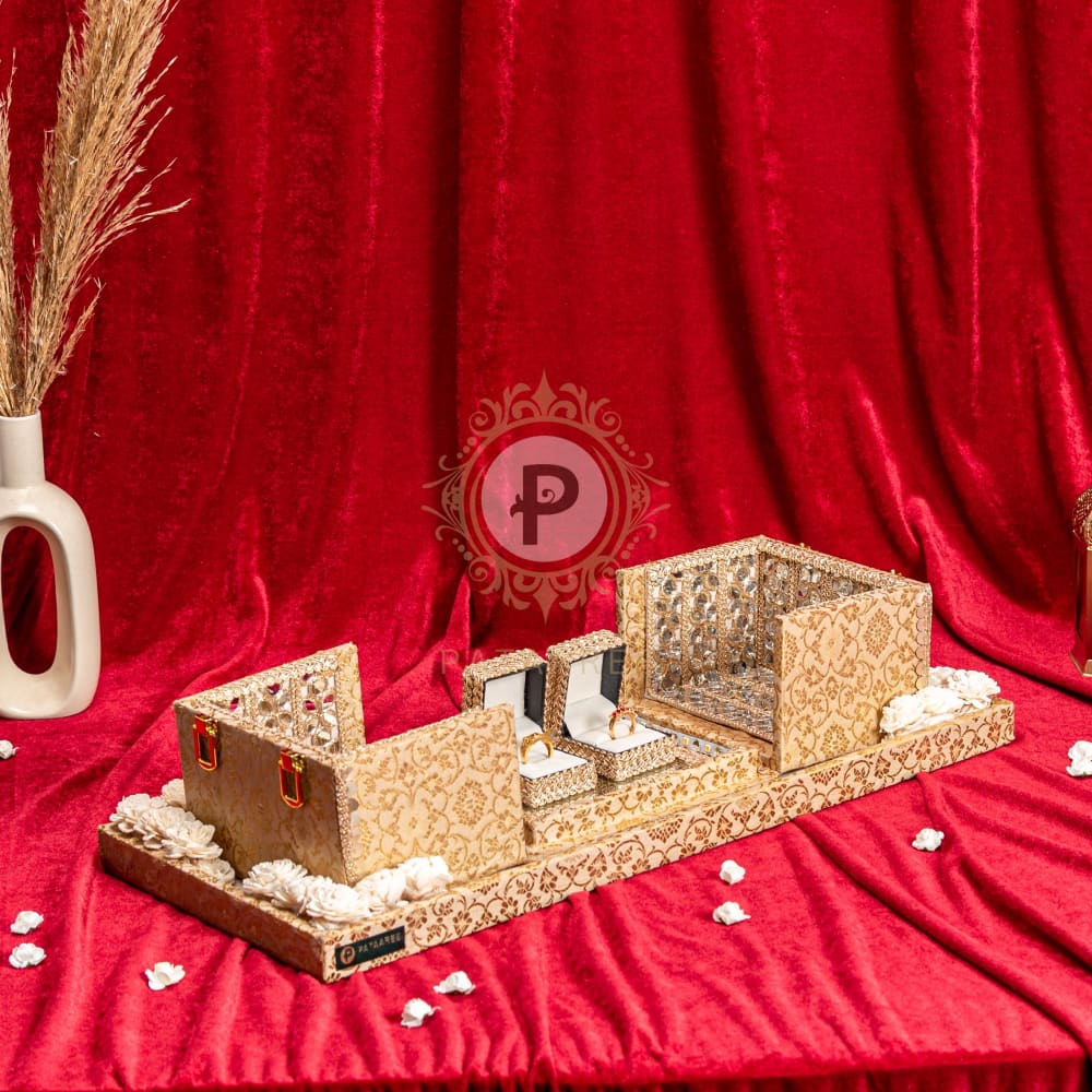 Celebrate your Engagement ceremony with grace using our Ring Ceremony Platter Set. This exquisite set includes a beautifully crafted ring platter and two elegant ring boxes, all covered in luxurious brocade fabric. Perfect for ring engagements, this platter set adds a touch of sophistication to your special occasion, ensuring a memorable and stylish presentation.