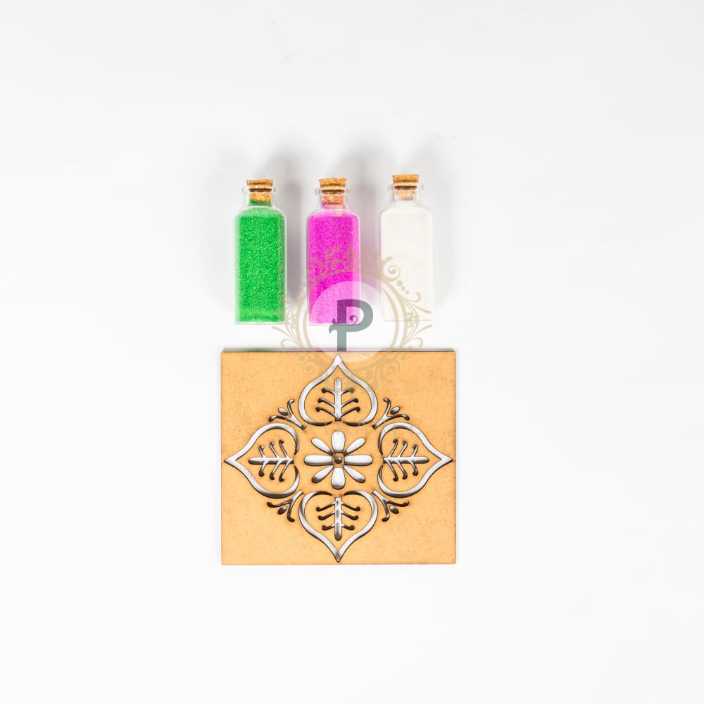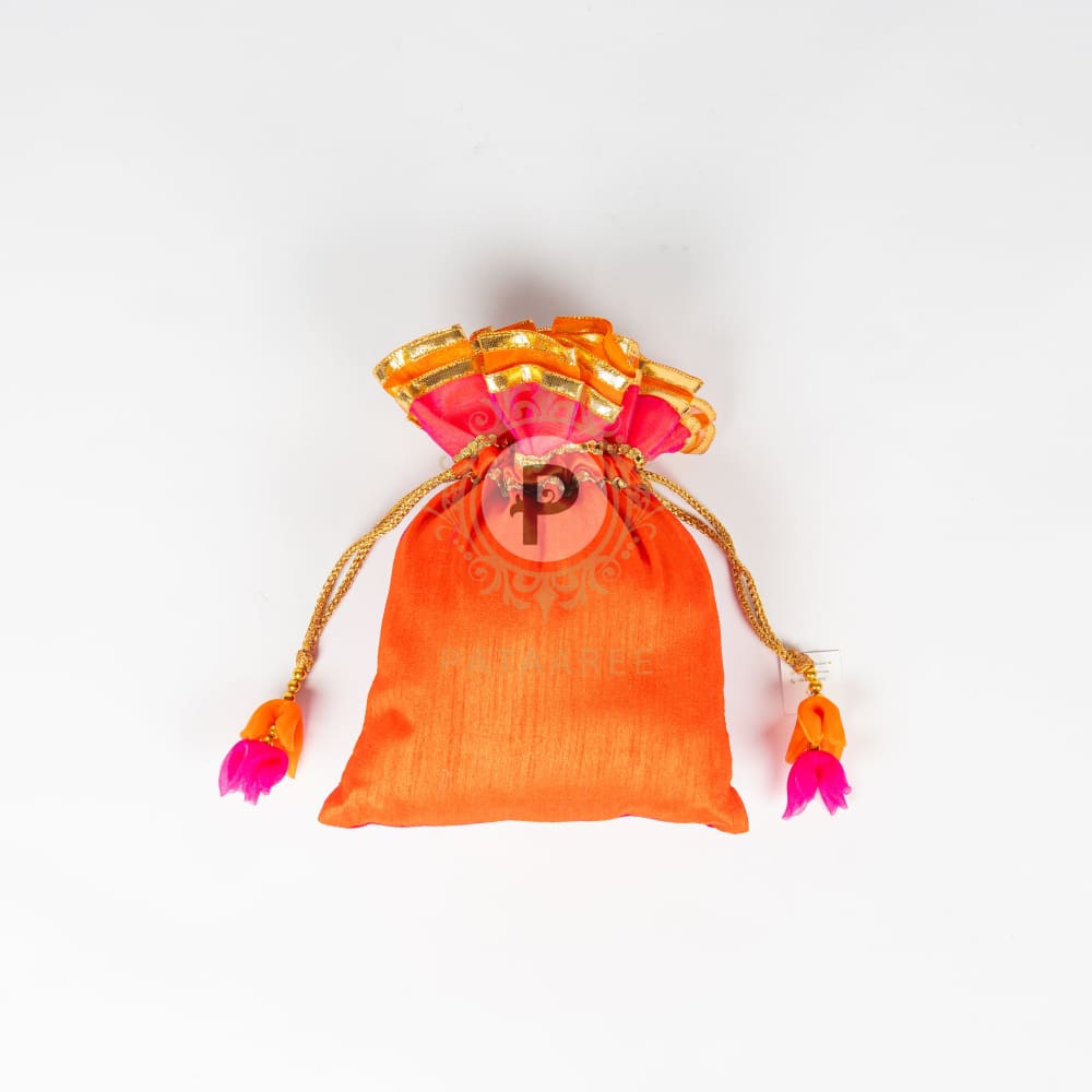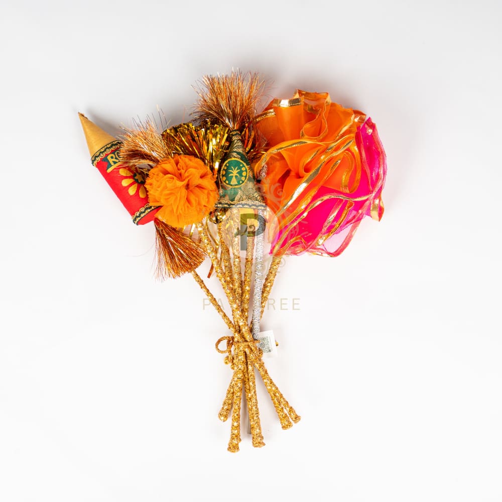 Set Includes: 1 Orange and Hot Pink Silk Potli, 1 Firecracker Bunch, 1 MDF Rangoli Stencil with 3 Rangoli Colors, 1 Laxmi Feet Toran Pair, and 2 Hand-Painted Diyas in a Tissue Potli