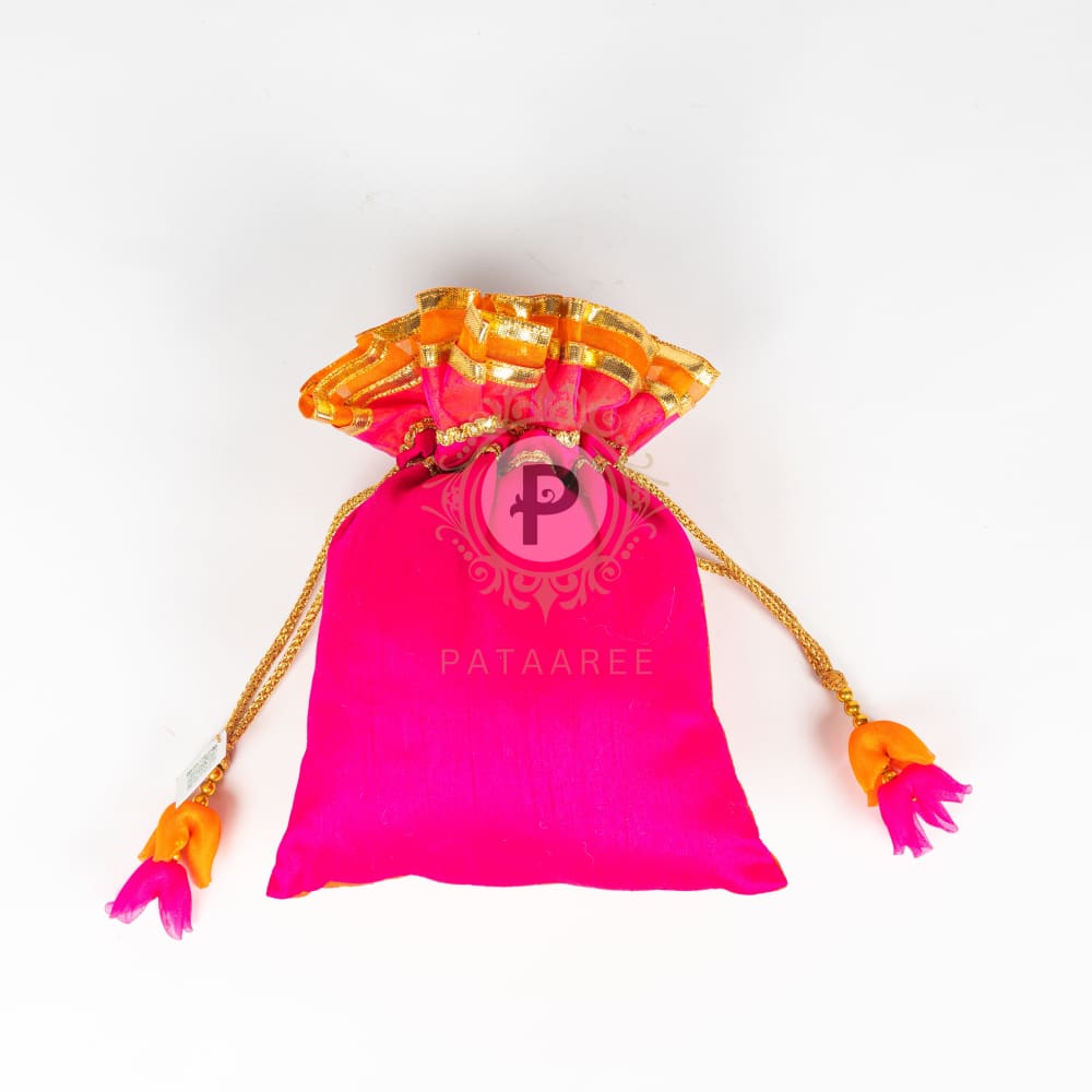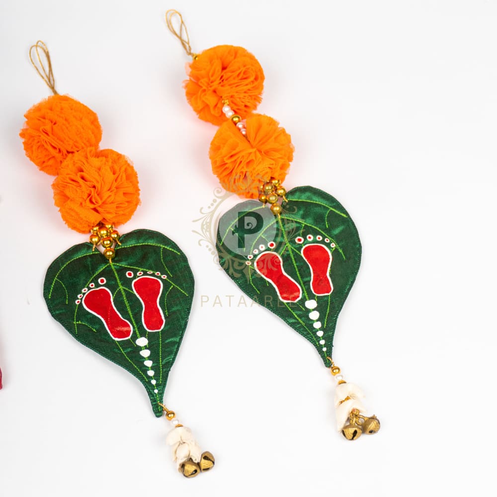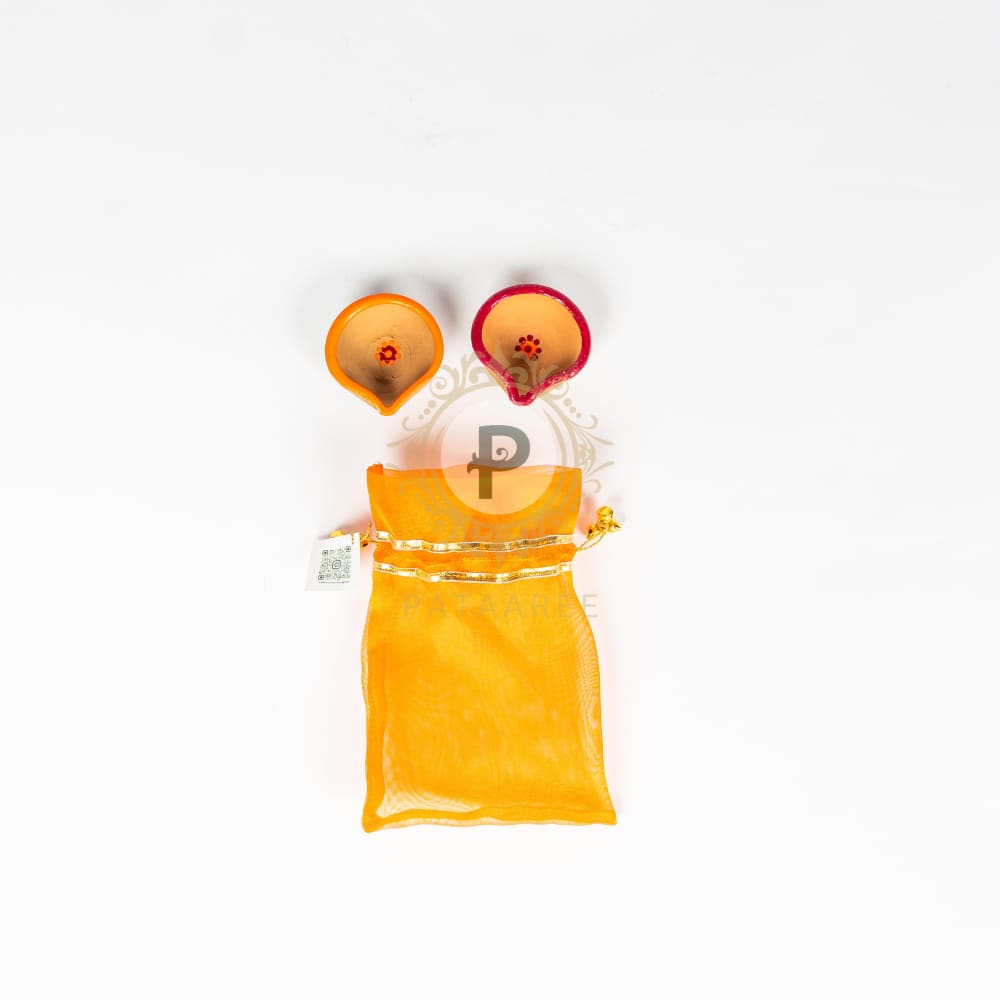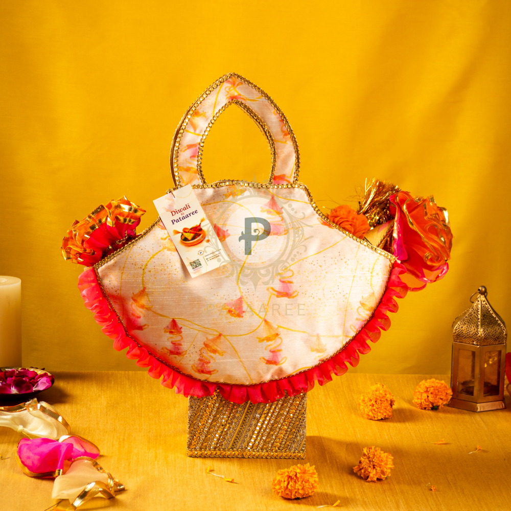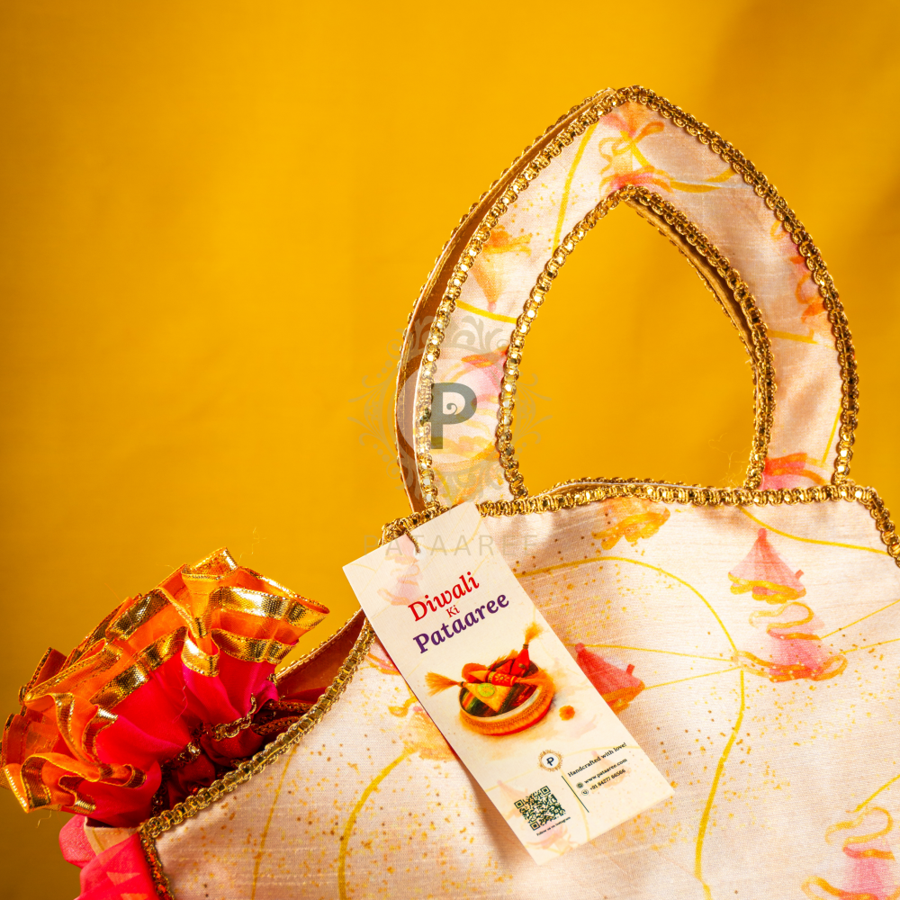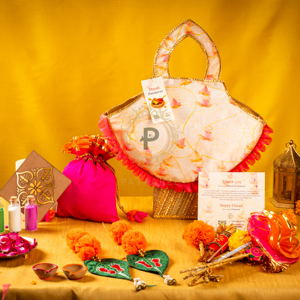 Set Includes: 1 Diya-Shaped Bag, 1 Orange and Hot Pink Silk Potli, 1 Firecracker Bunch, 1 MDF Rangoli Stencil with 3 Rangoli Colors, 1 Laxmi Feet Toran Pair, and 2 Hand-Painted Diyas in a Tissue Potli.