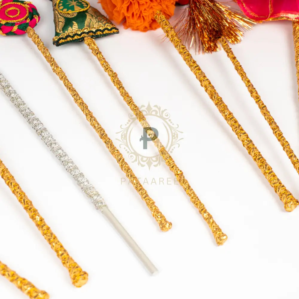 Set Includes (available in assorted colors) : 1 Gold Badla Stick, 1 Orange Marigold Stick, 1 Yellow Marigold Stick, 1 Rocket Stick, 1 Silver Phooljhaddi Stick, 1 Hot Pink and Green Chakri Stick, 1 Red Anaar Stick, and 1 Tassel Stick, all packed in a tissue potli cover.