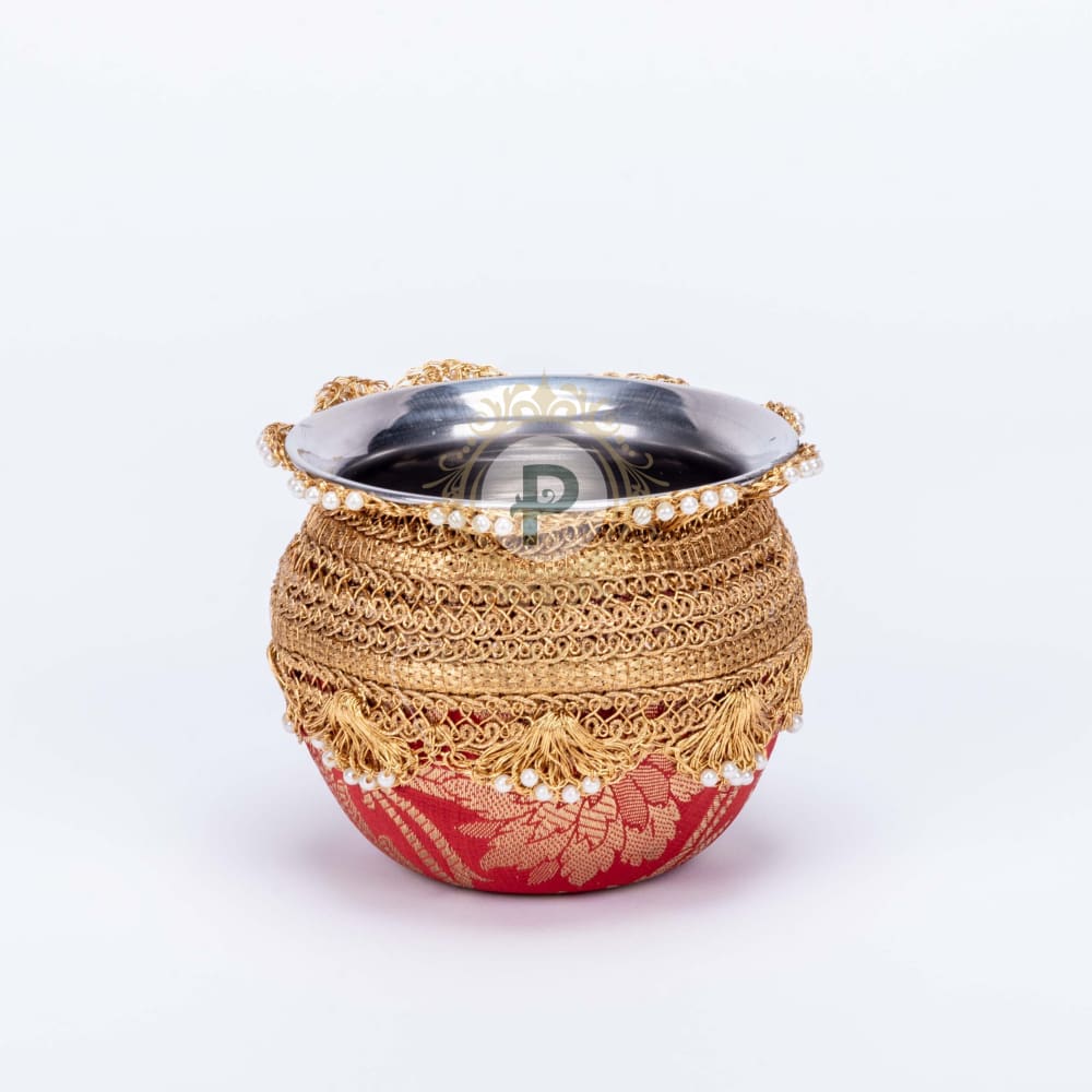 Complete the wedding ceremony collection with red brocade and gold trims steel gadvi.