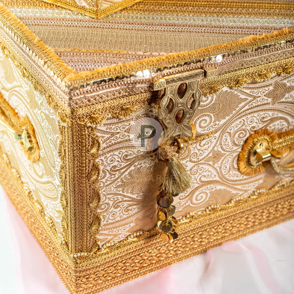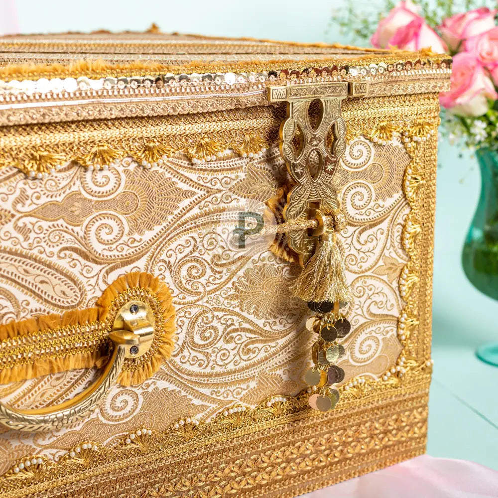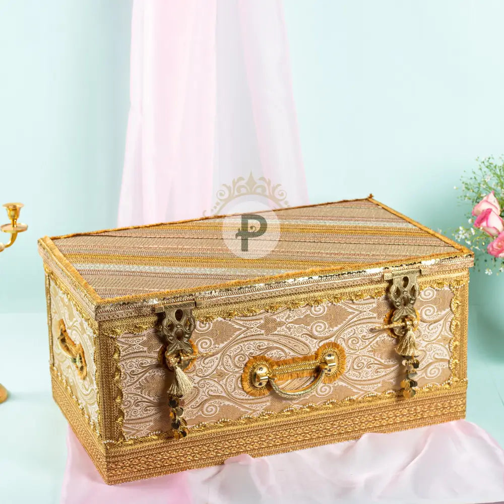 The royal tones of ivory and gold brocade, the intricate inlay gota work on top, the fine finish of the gold trims, traditional brass handles and tasseled locks, and a plush yellow velvet interior - our spacious Gold Brocade Satrangi Trousseau Trunk is nothing short of a handcrafted heirloom. A must have for your trousseau, own one now.