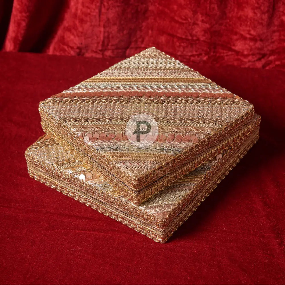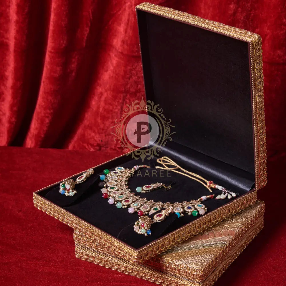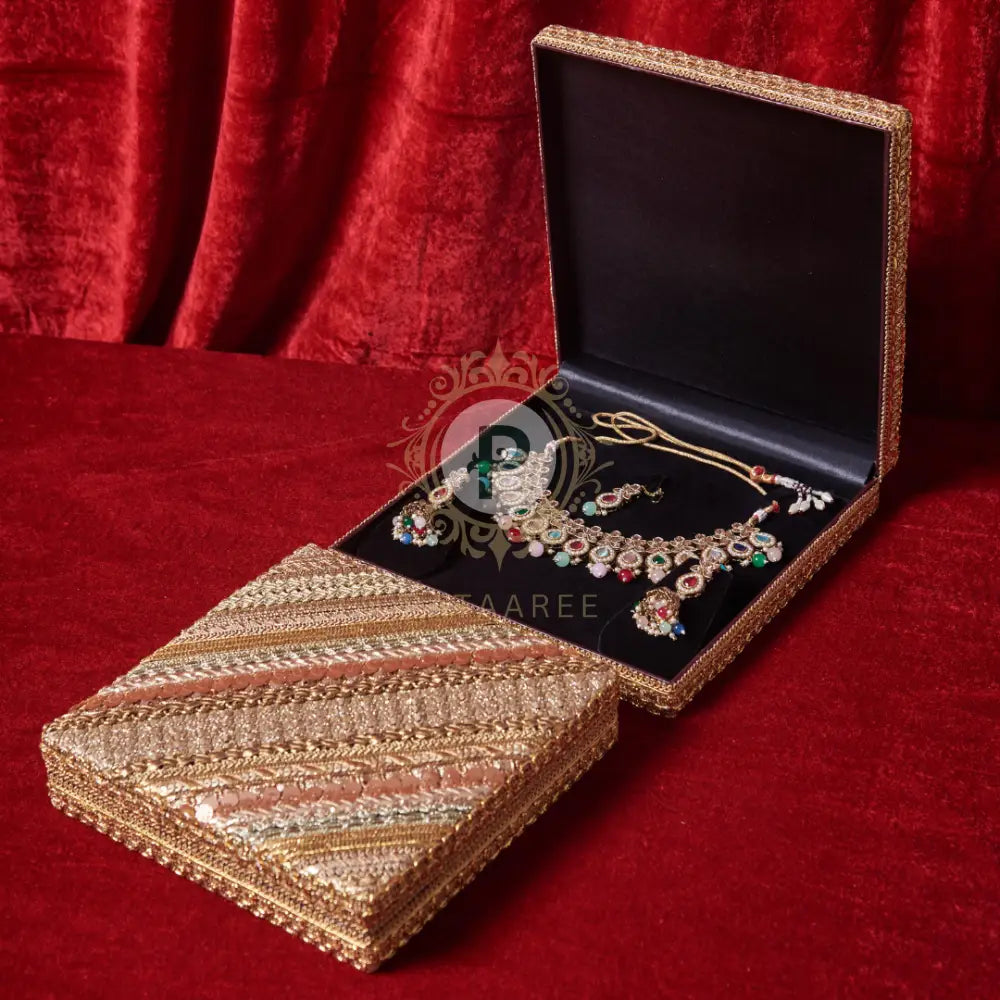 With an intricate inlay of pastel coloured gota, gold trims and sequins, our golden satrangi jewellery handcrafted with premium material is a jewel in itself. The perfect case to present precious pieces of jewellery/heirloom sets/baubles to the bride to be, or groom’s mother and sisters. Add it to your trousseau now.