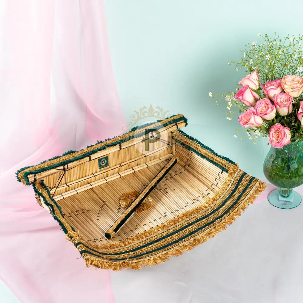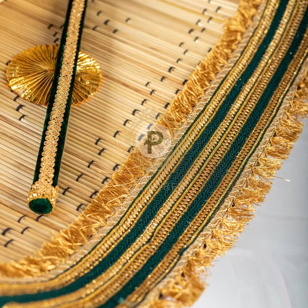 Turn heads with the spirited elegance of our Green & Gold Chajj, crafted in traditional satrangi patterns and vibrant trims. Designed to keep up with your every step, the accompanying stick makes every tap louder and more joyful. A symbol of cultural pride and festive spirit, this set brings rich green hues to life with golden charm. Perfect for your Jaago night festivities!
