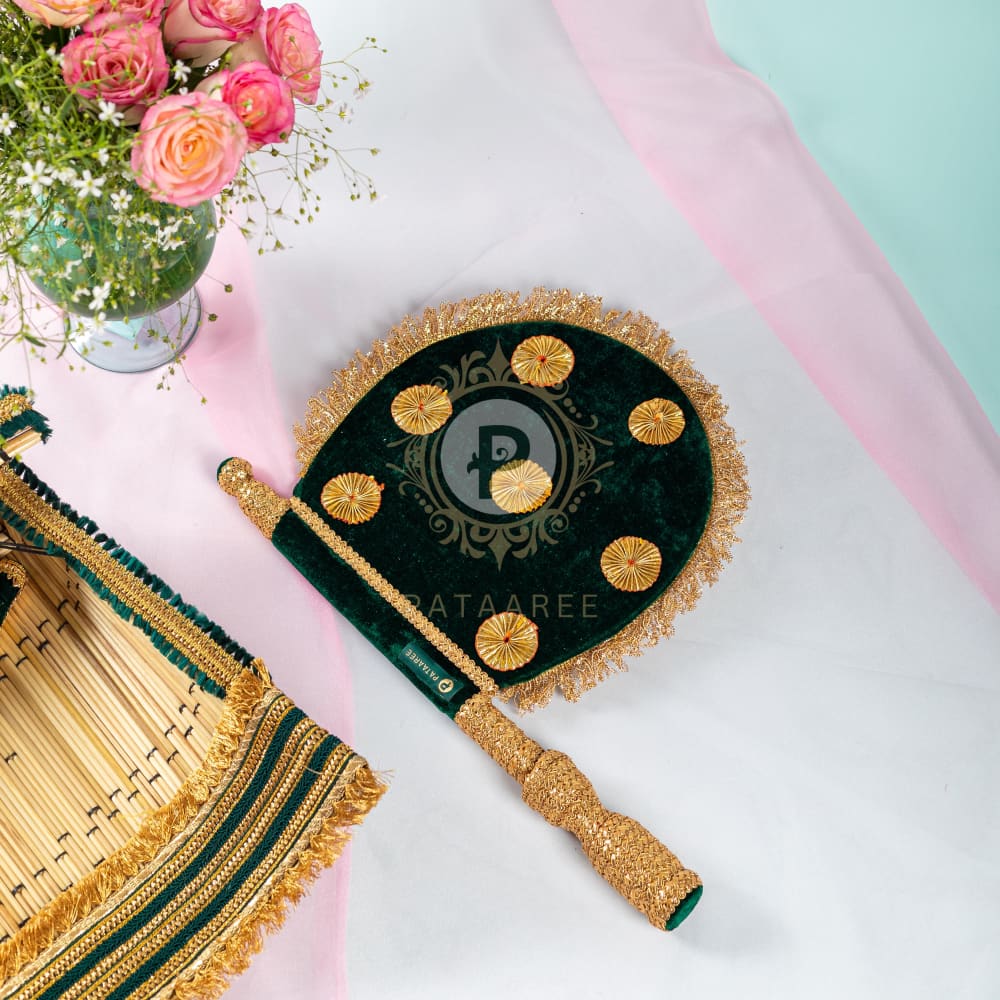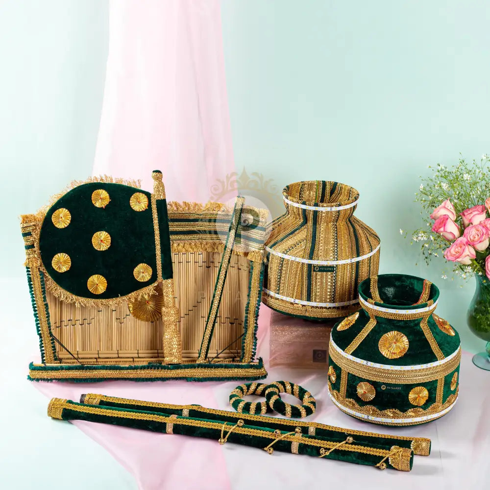 Elevate your Jaago ceremony with our elegant Bottle Green & Gold Jaago Set, a stunning blend of tradition and festivity. This vibrant ensemble includes intricately decorated Jaago Matkas, a colorful Danda and Chajj, a festive small stick, and a beautifully adorned Pakhi. Designed to add sparkle and cultural charm to your celebration, this set brings joy, unity, and radiant energy to your special night. Light up your occasion with timeless Punjabi tradition and modern flair!