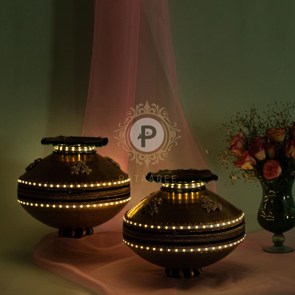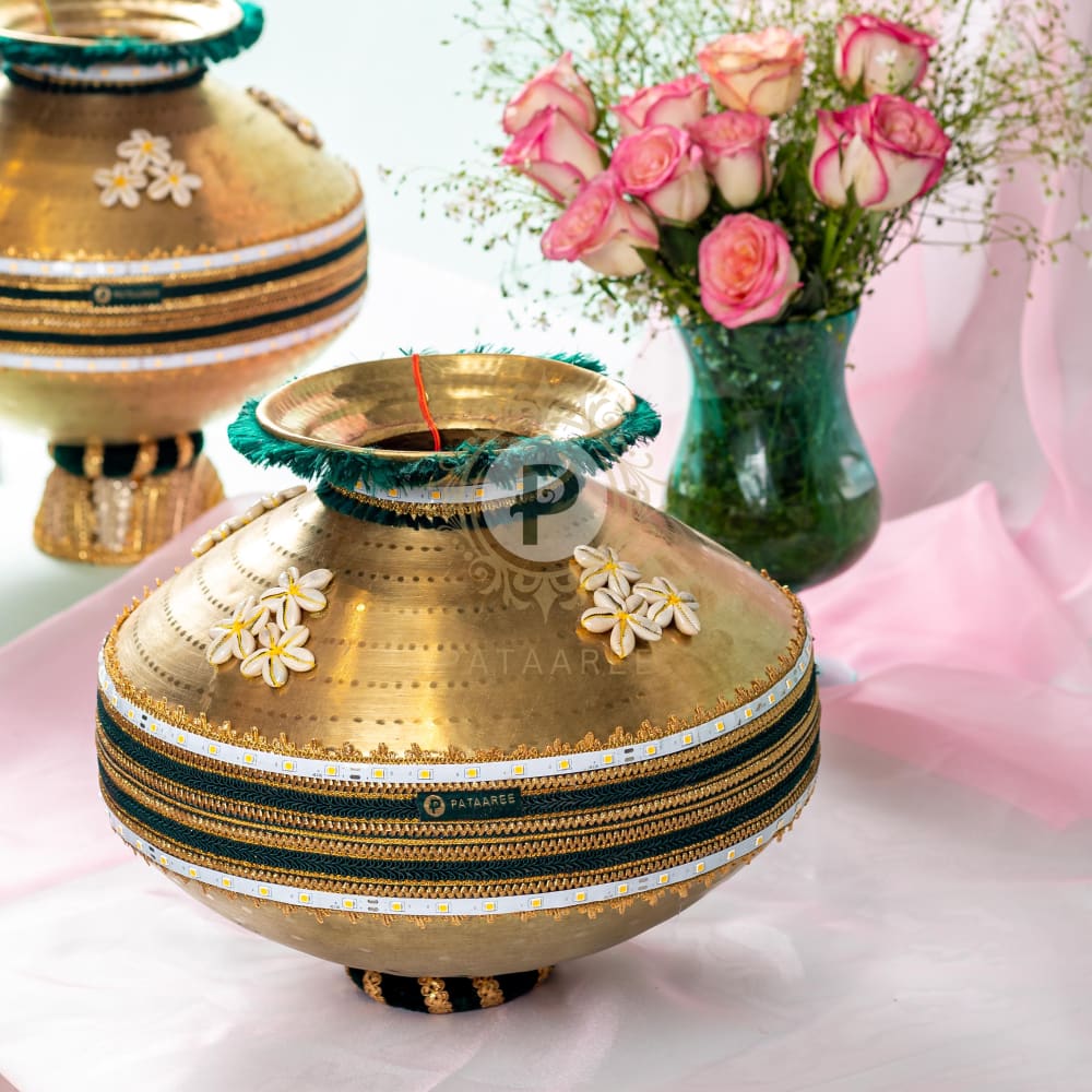 Add a royal Punjabi twist to your wedding festivities with our Green & Gold Brass Jaago Matka, complete with built-in LED lights for a radiant effect. This vibrant piece is perfect for Jaago ceremonies, where tradition meets celebration. The green and gold combination exudes elegance and positivity, setting the tone for unforgettable wedding memories filled with joy, dance, and culture.