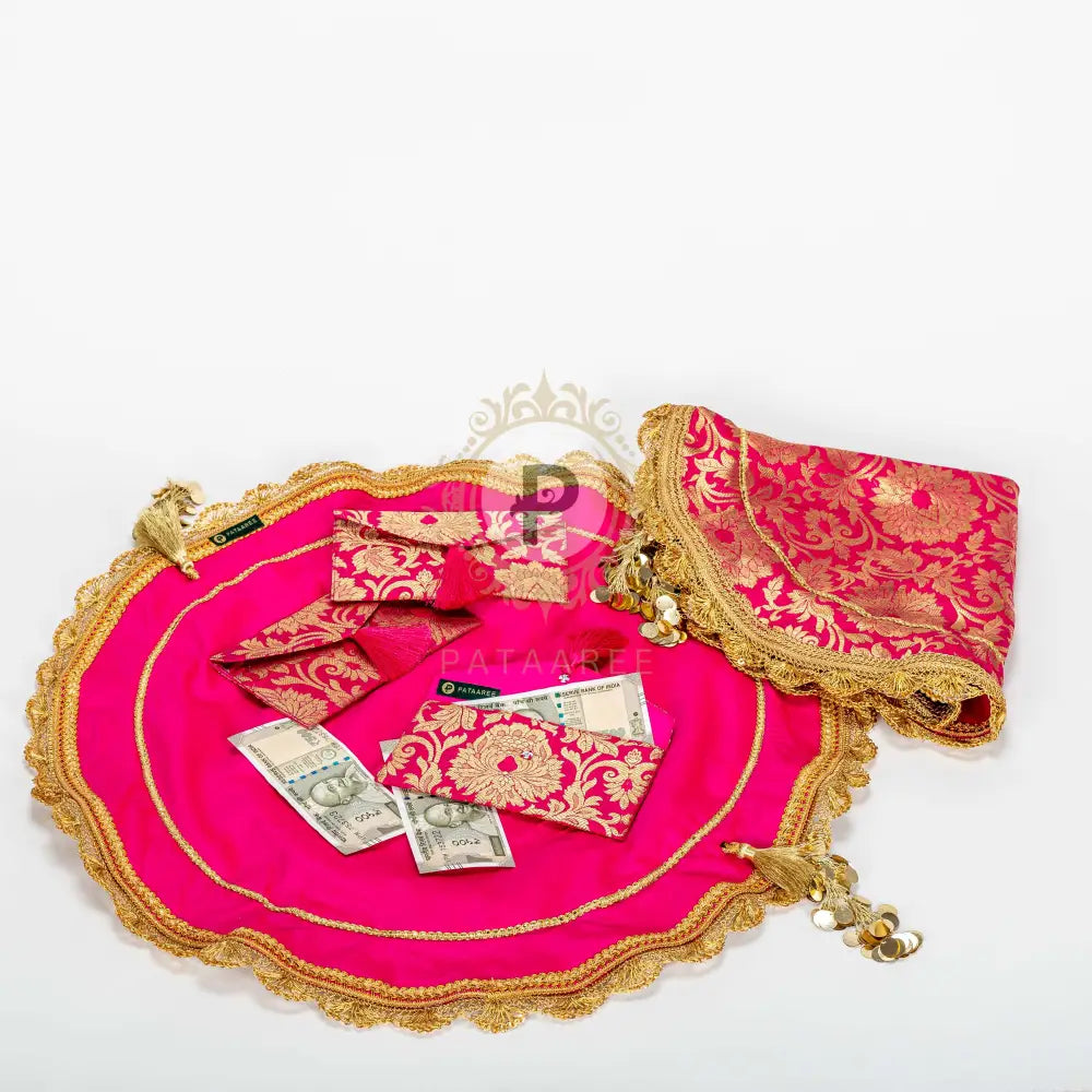 Infuse your wedding rituals with vibrant charm using our handcrafted Hot Pink Brocade Lap Cover Pair. Drenched in rich hot pink and adorned with intricate gold floral embroidery, each piece is strung with a luxurious golden dori. This lap cover pair brings contemporary elegance to your shagan ceremony while honoring timeless traditions. A lively expression of joy, grace, and celebration.
