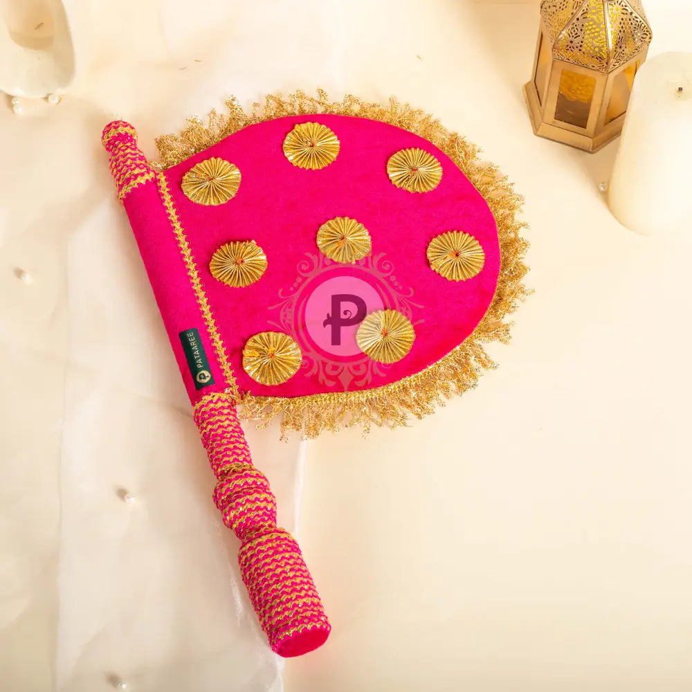 Bold, bright, and rooted in tradition, our Hot Pink and Gold Satrangi Pakhi brings festive flair to any occasion. Crafted by skilled artisans, this handcrafted fan with multicolored borders channels the vibrancy of Punjabi culture. Ideal for wedding décor, bridal gifting, or as a decorative wall hanging, it stands out as a symbol of joyful heritage. Add a splash of tradition to your celebrations with this colorful masterpiece.