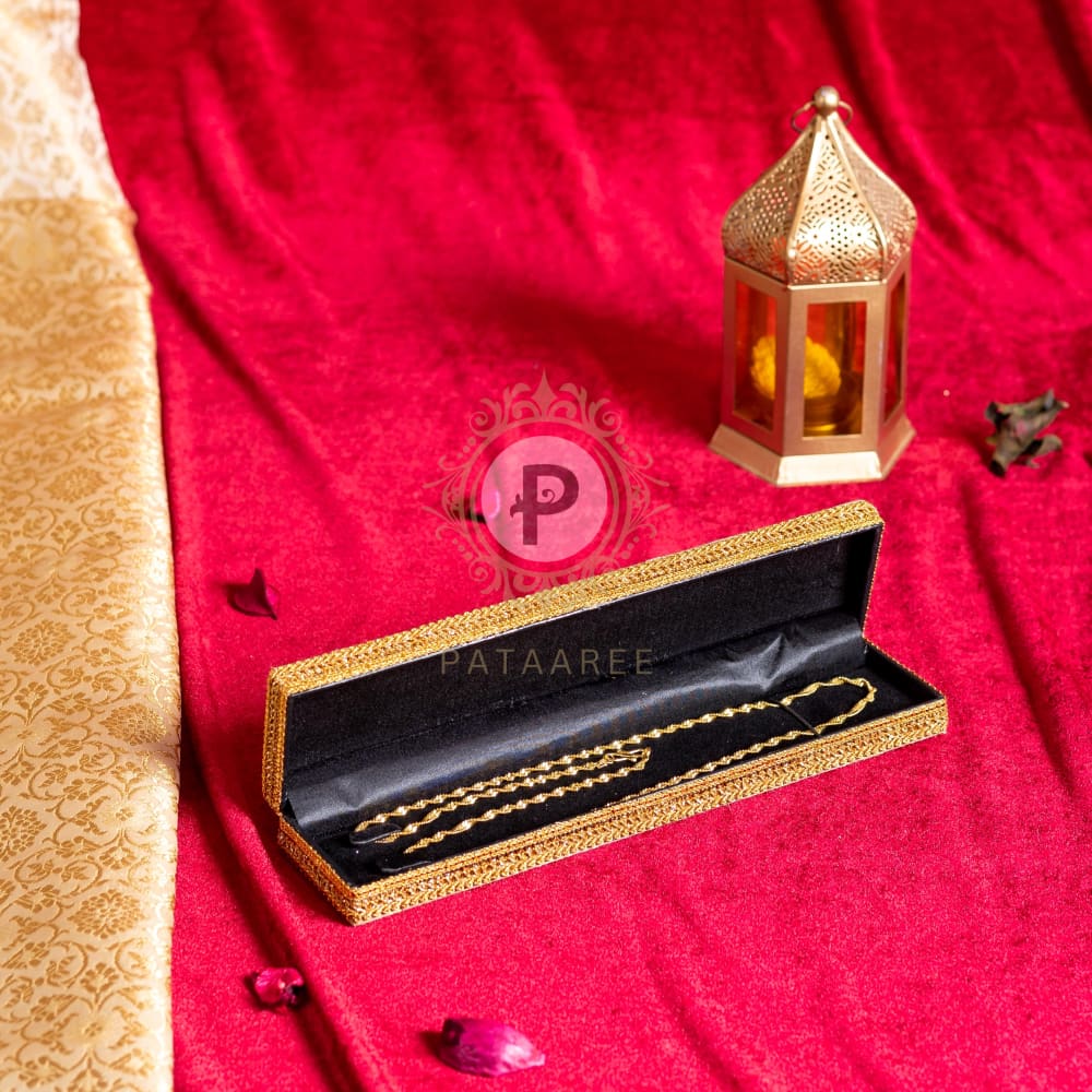 Introducing our elegant Chain/Bracelet Box, wrapped in luxurious brocade with matching gold trims. Perfect for presenting cherished jewelry, this beautifully crafted box adds sophistication to any gift.