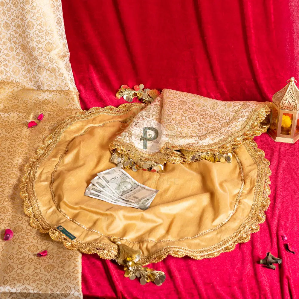 Elevate your wedding or Shagun ceremony with our elegant Lap Cover Set. Crafted in ivory and gold brocade with floral patterns, gold trims, and tassels, this set includes covers for both the bride and groom.