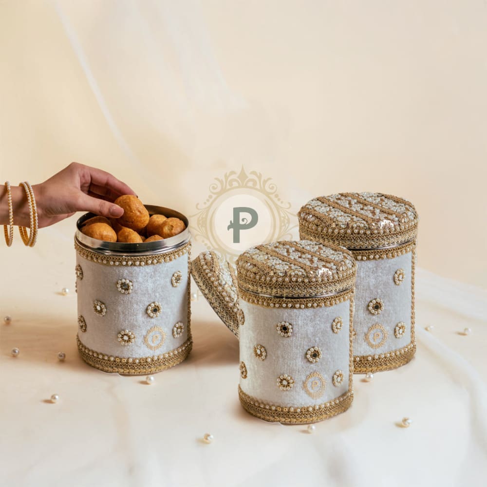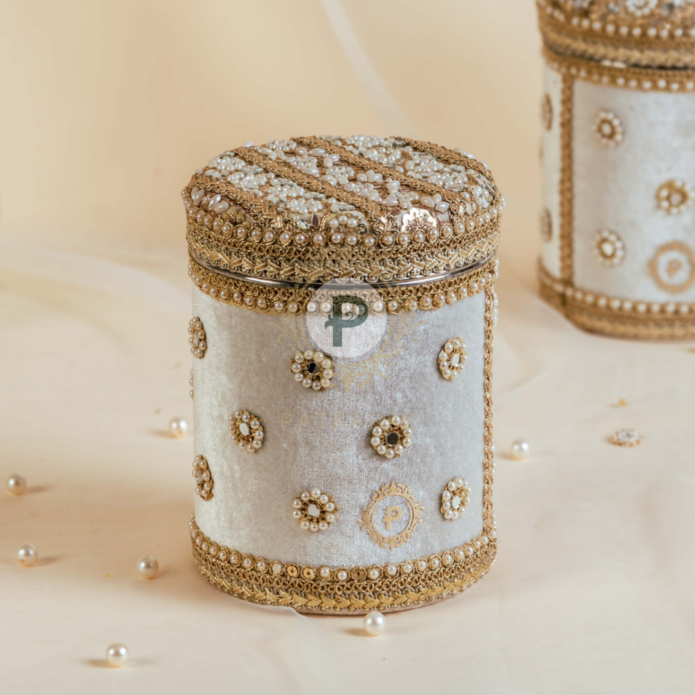 Those cylindrical steel canisters are a staple at weddings, shagun, and festive events. Our Zehra Collection reimagines the red ladoo box for 1kg long shaped mithai, wrapping tradition in ivory velvet, with a pearl-mirror embroidered lid and delicate Zehra pearl blooms.