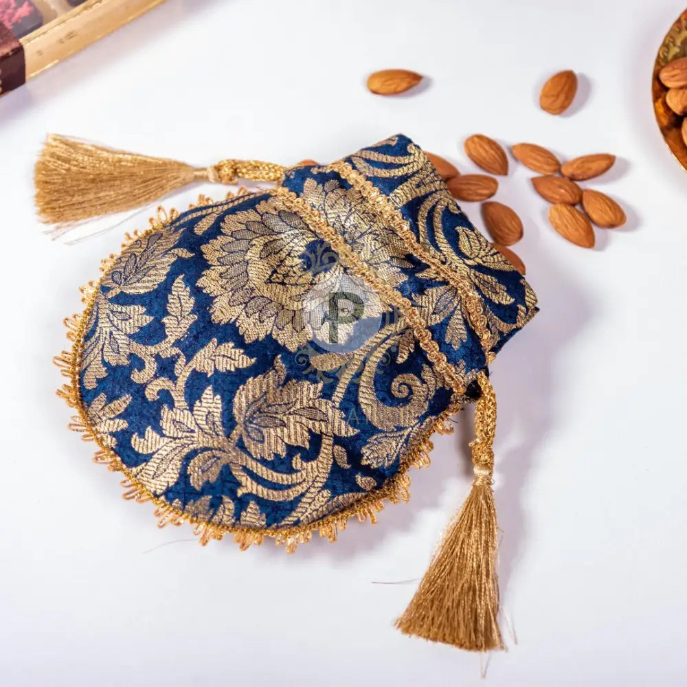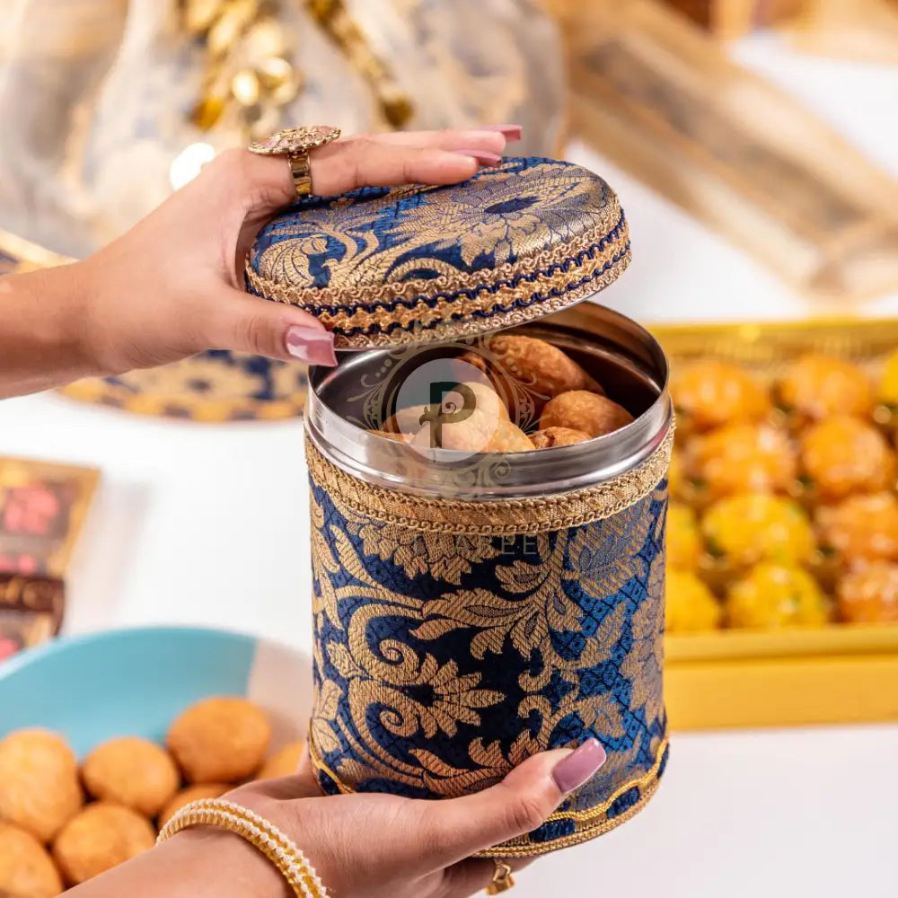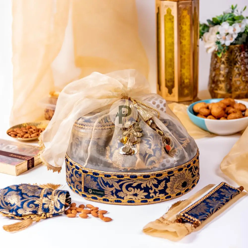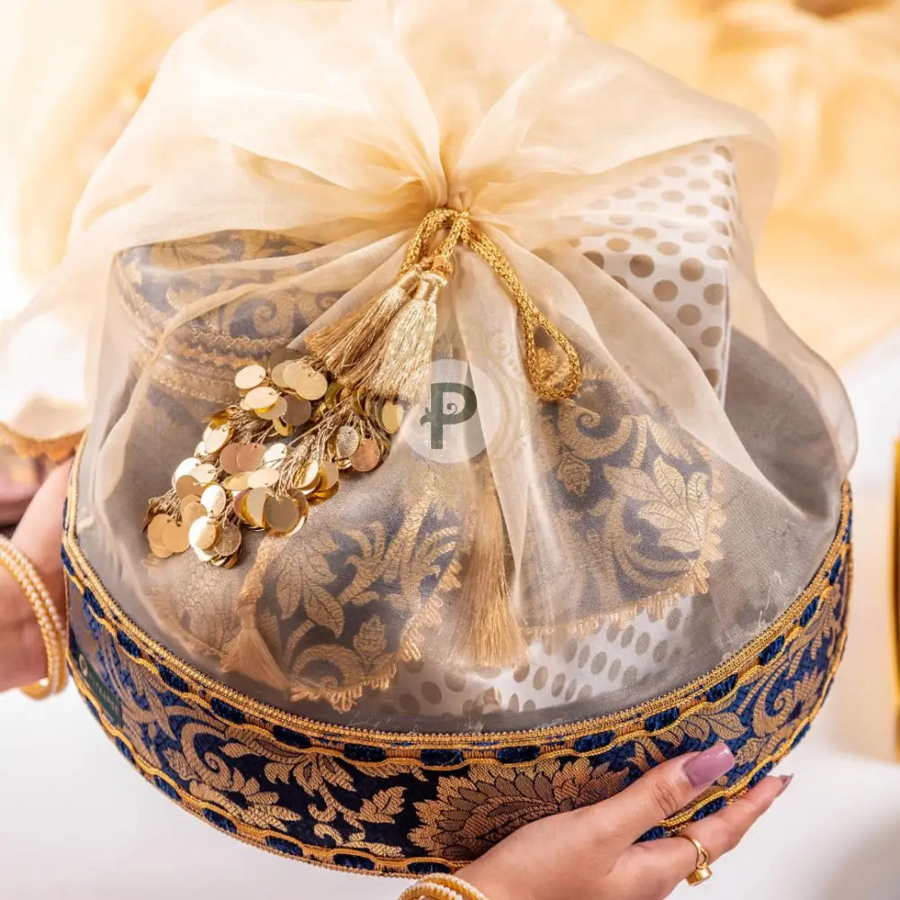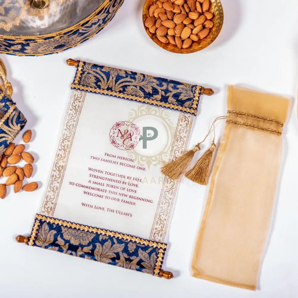Blue is the colour of royalty & loyalty, and so for her Prince Charming and his loving family, our lovely bride @anika.u_ , handpicked navy blue brocade to lend that magnificent touch to our first of its kind bespoke hamper baskets for gifting packed with a handwritten scroll, bhaji box, potlis and shagun envelope. A memorable nishani for #NishAni.