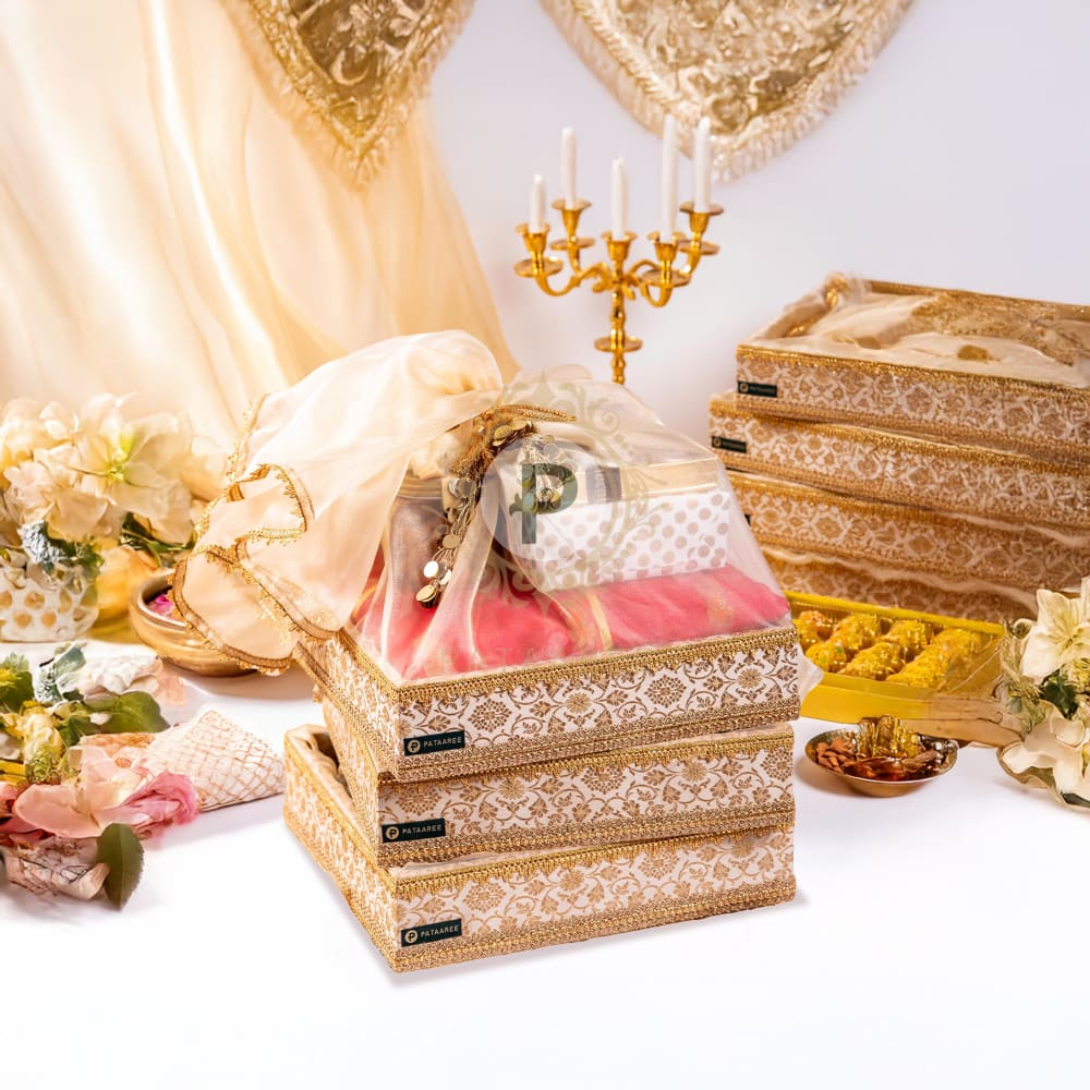 A tray to treasure is exactly what @sonia_ullah had in mind when she chose our trays in ivory brocade with tissue covers complete with gold trimmings, phool and tassels.