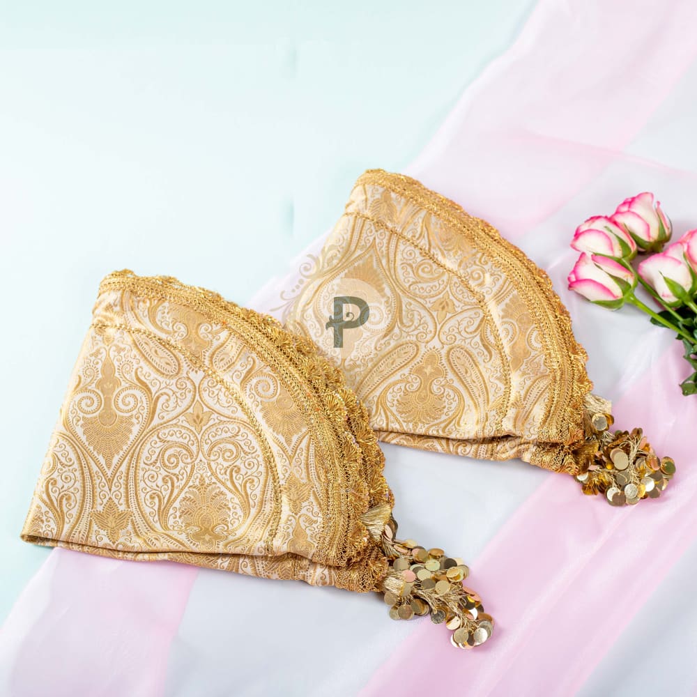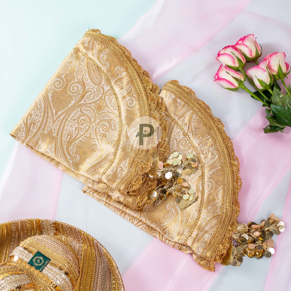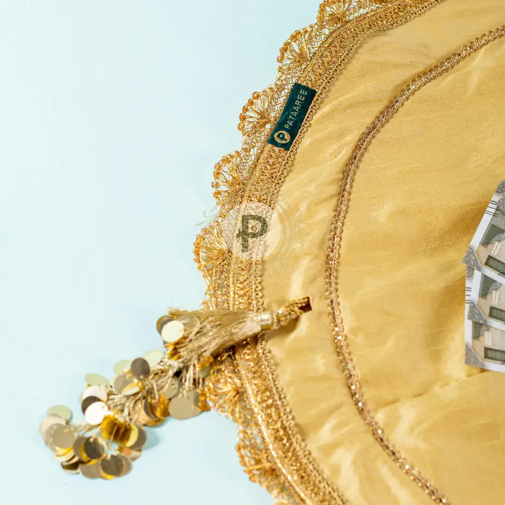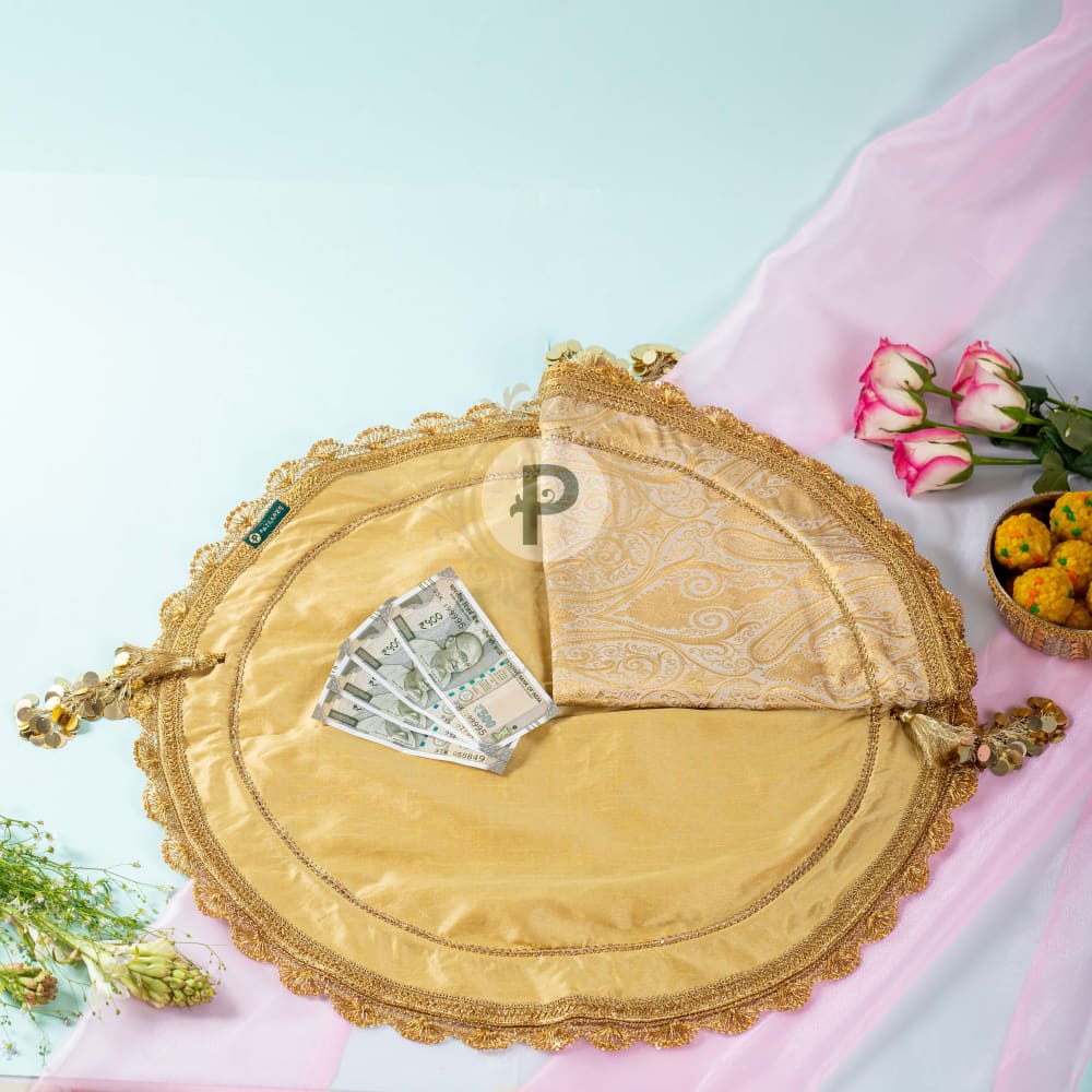 Practical, convenient and sophisticated - our lap cover set for the bride and groom makes life much easier for handling and collecting all that shagun and blessings in one go. Handcrafted beautiful in ivory gold brocade with dull gold lining and tasseled doris to tie it up, the lap cover set is a must have on your wedding ceremony checklist. Invest in your set today.
