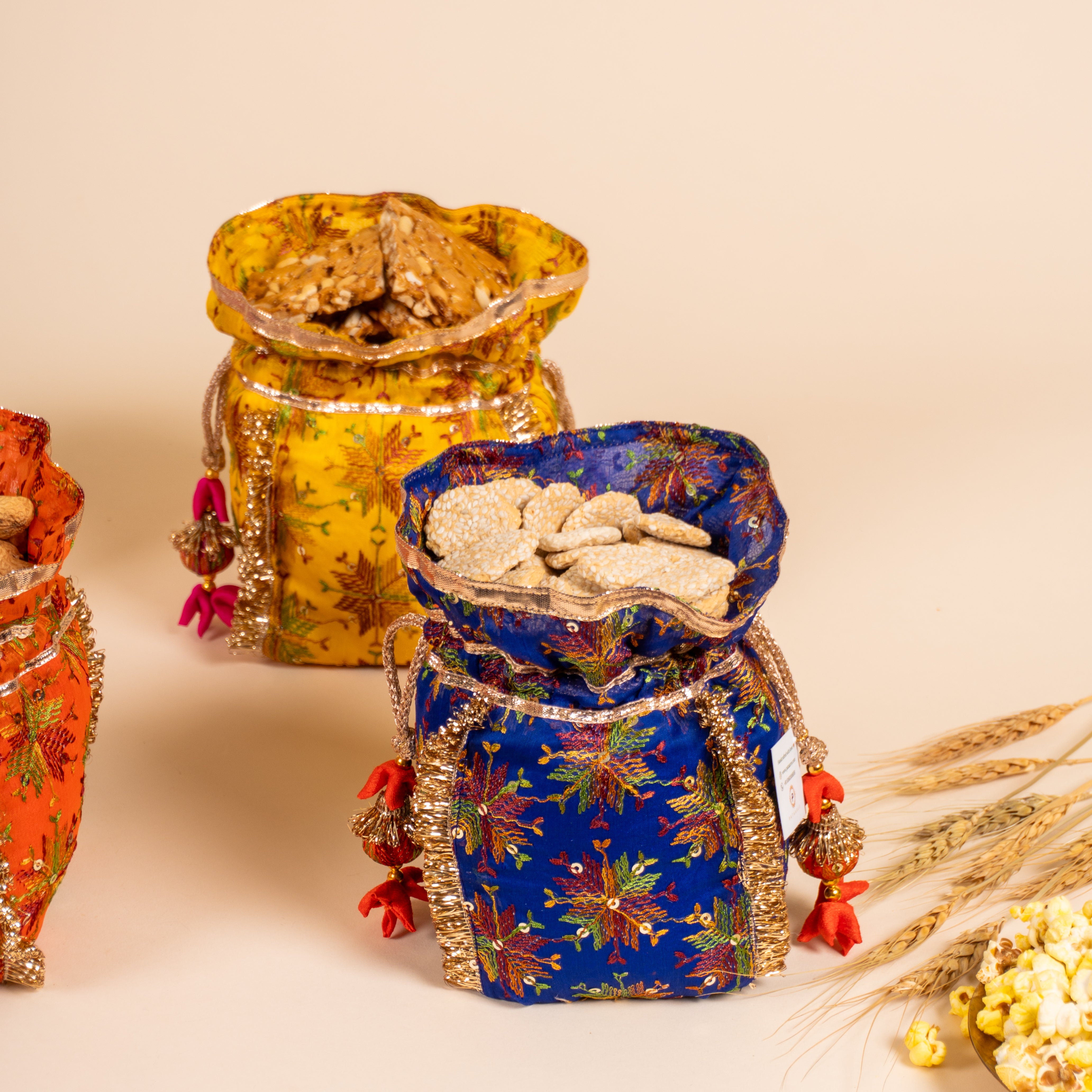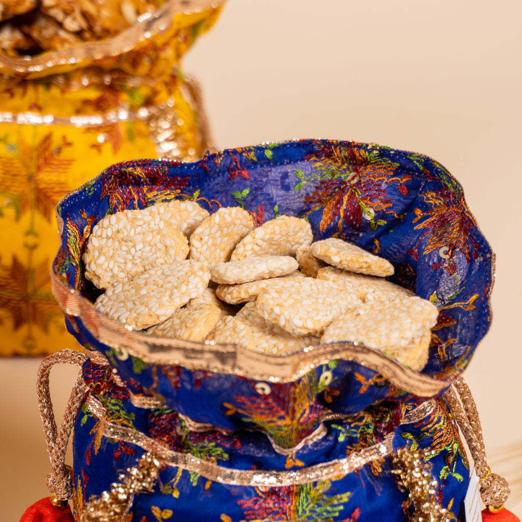 Celebrate the spirit of lohri with this festive set of 4 phulkari favour potlis. Designed in rich phulkari prints, this set is ideal for packing rewri, gajak, popcorn, or any traditional Lohri treats. A perfect gifting option for your loved ones, these potlis carry the warmth and charm of the festival.