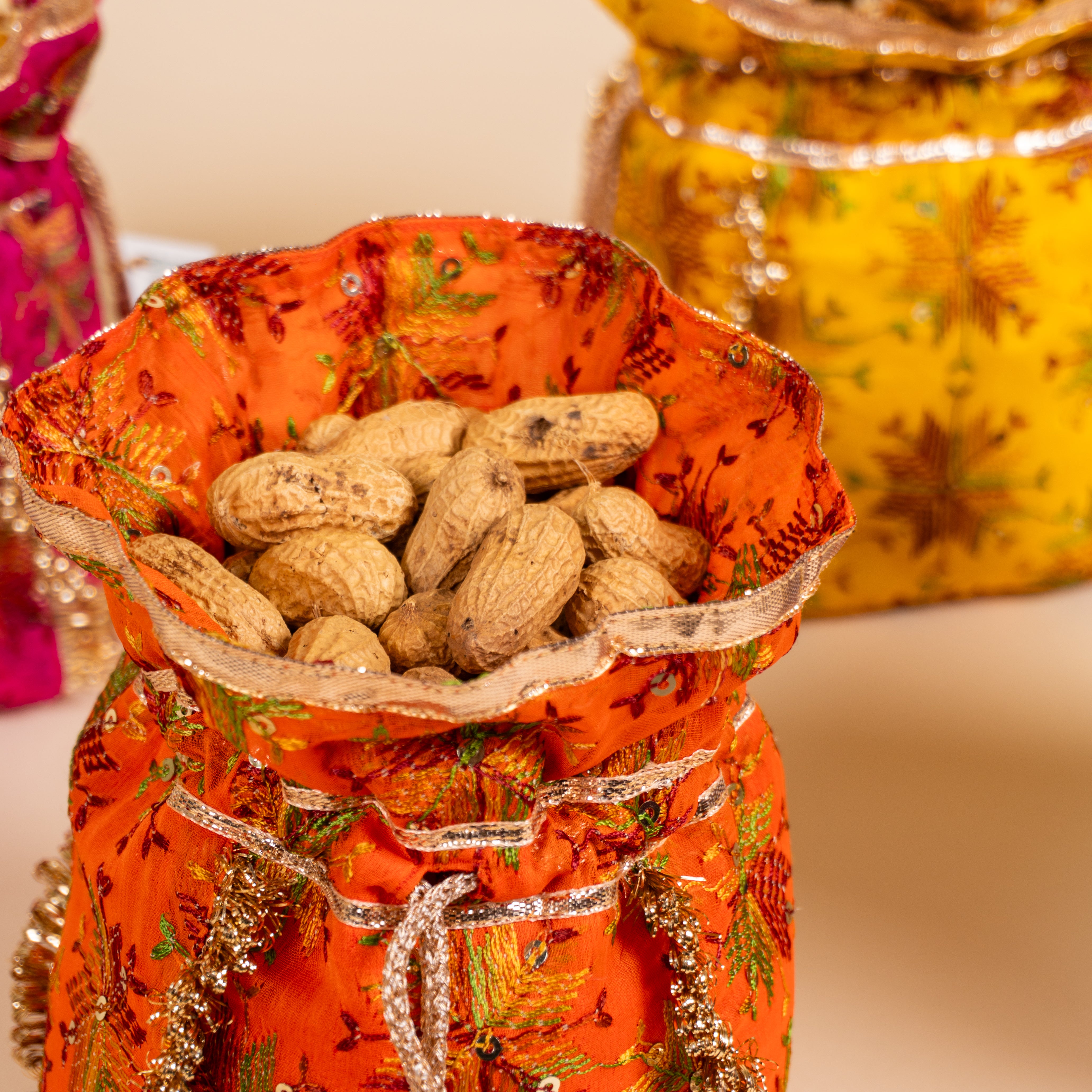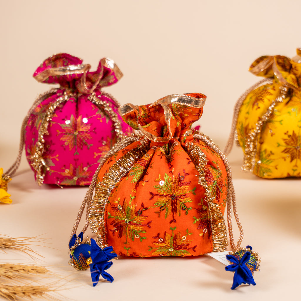 4 Favour Potlis in Orange, Electric Blue, Hot Pink and Yellow Color
