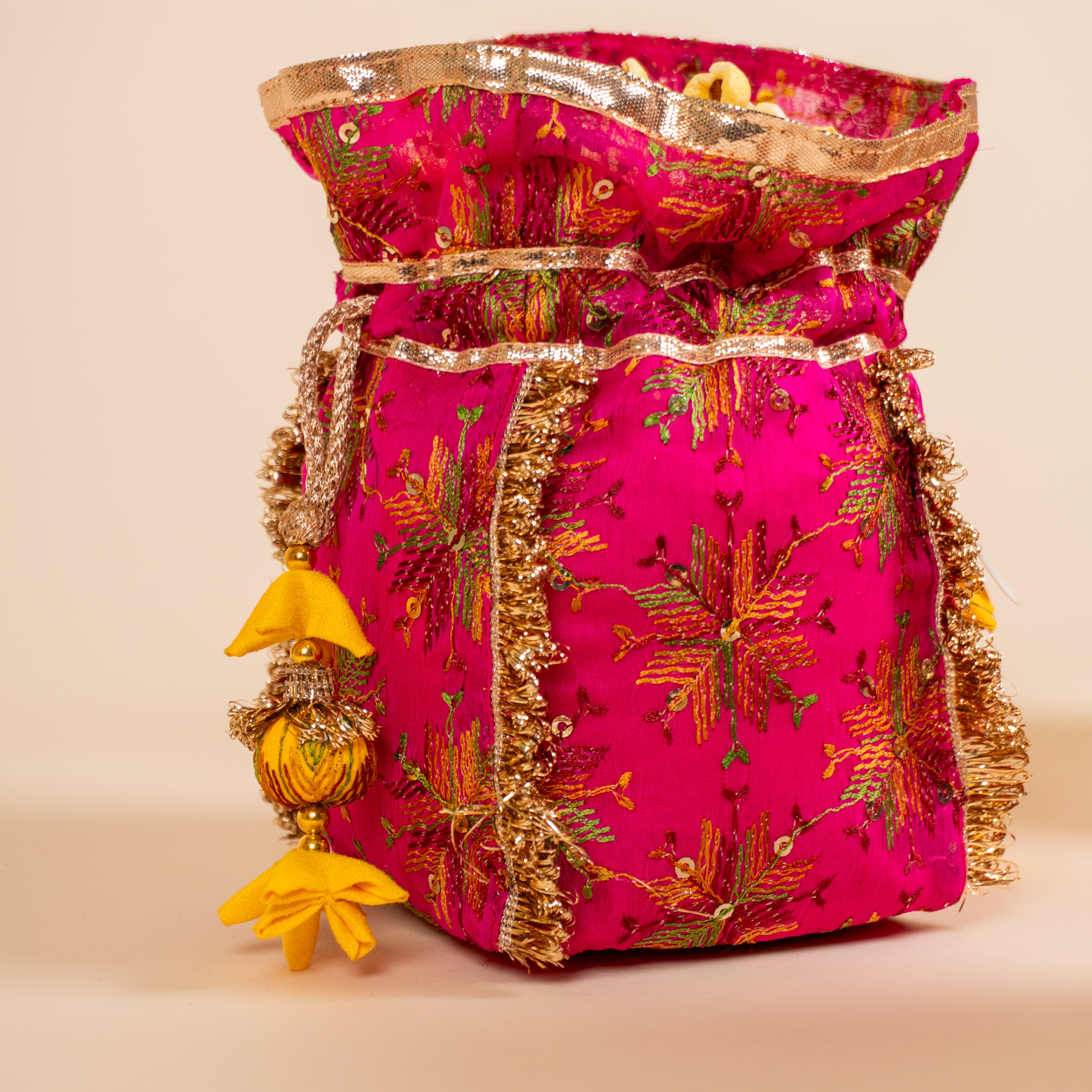 Material: Multicolour Phulkari fabric with silk rose gold trims and contrasting tassel.