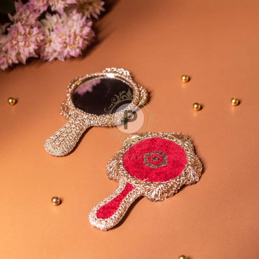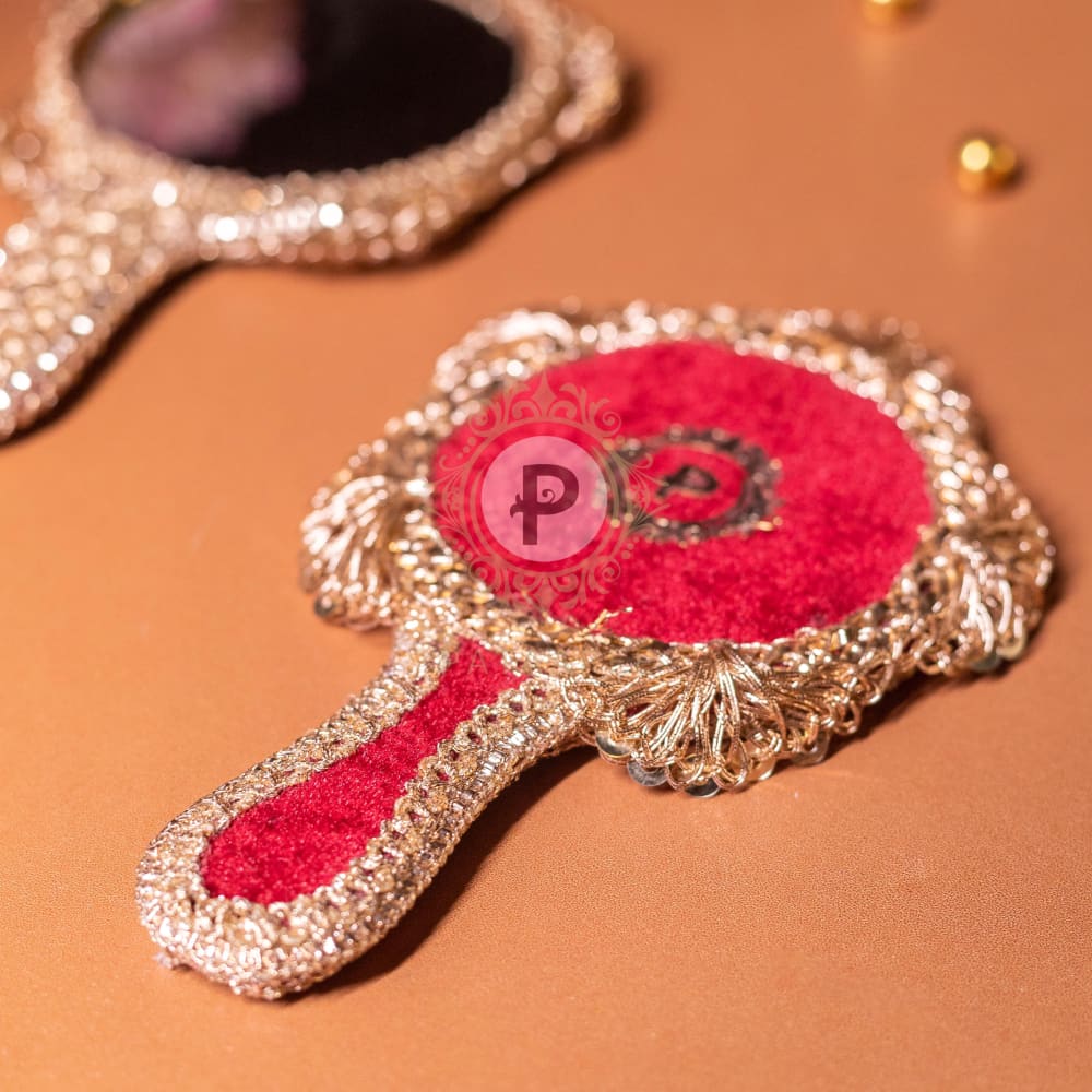 Wrapped in plush maroon velvet and adorned with elegant trims, this Surkh Hand Mirror captures timeless charm. A blend of vintage aesthetics and cultural grace, it's the perfect keepsake or bridal favor. Whether gifted during Shagun ceremonies, Mehendi events, or weddings, it adds a regal touch to your trousseau or vanity. Combining beauty with function, this mirror is not just an accessoryâit's a cherished memento.