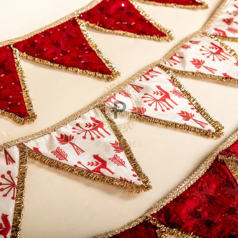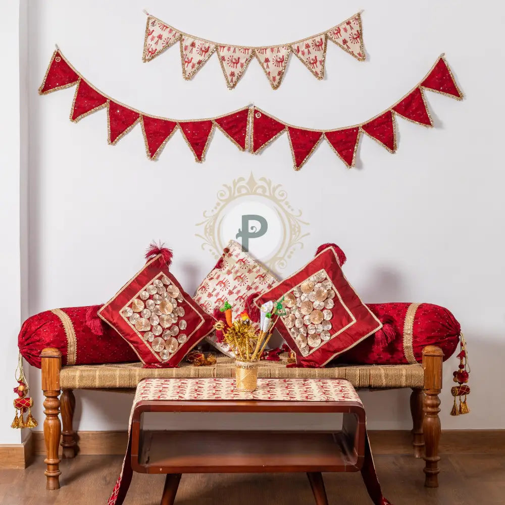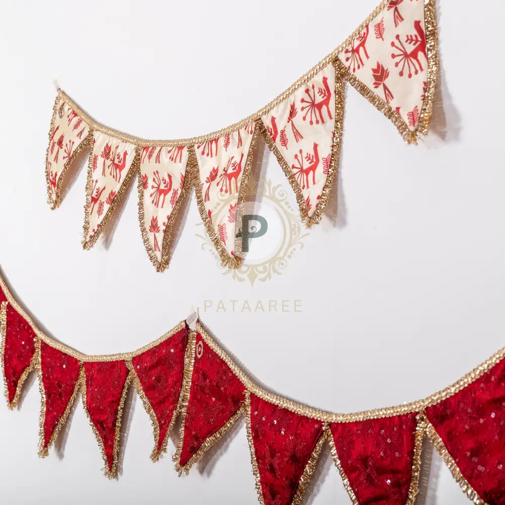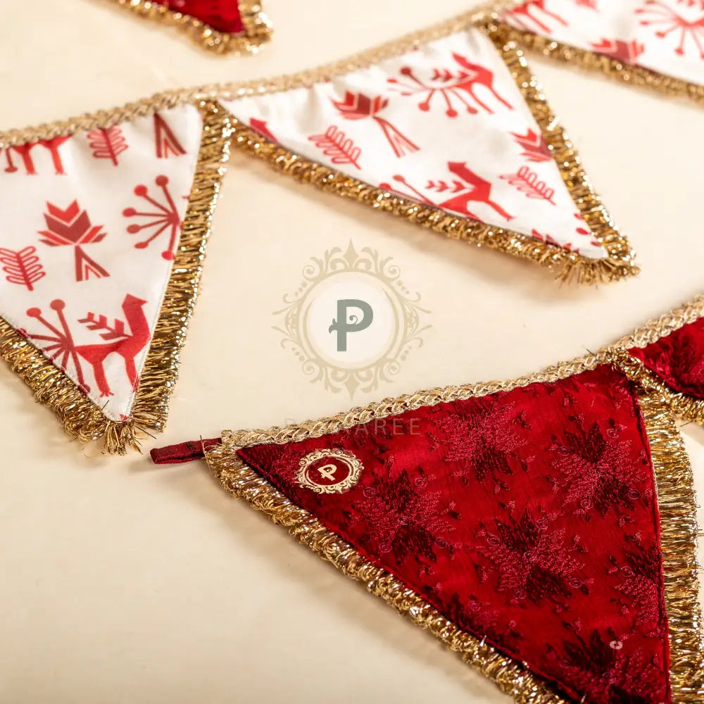 Welcome new beginnings and auspicious tidings in your home this lohri with our exclusive bespoke triangle shaped buntings made with love with phulkari as the theme, and finished with gold trims and badla. Available in sets of three, in phulkari self fabric and phulkari motif printed fabric.