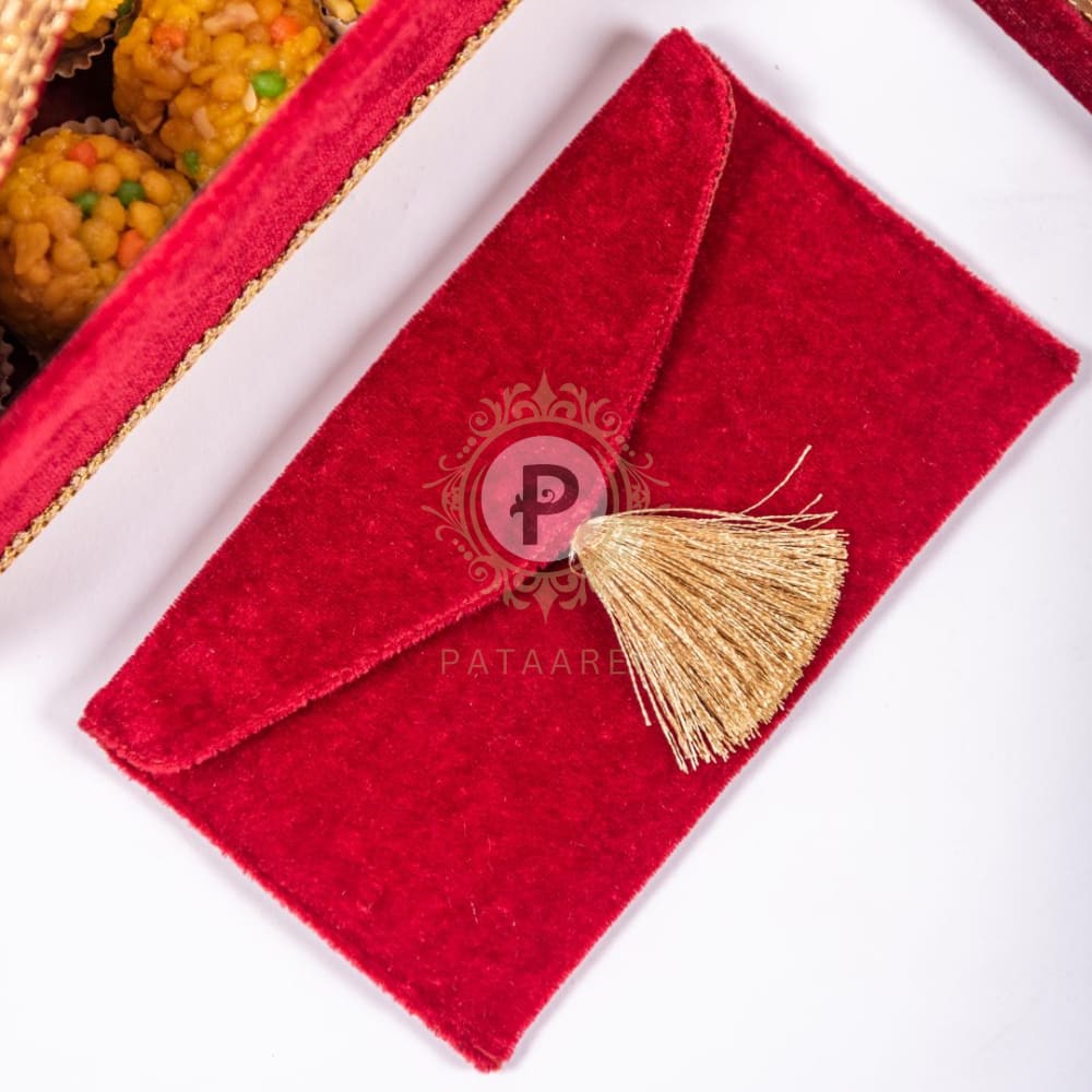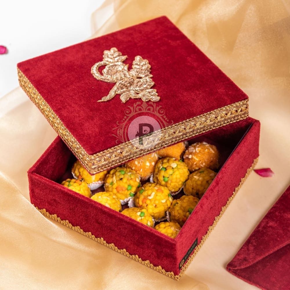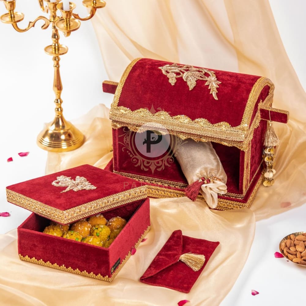 When the bride’s family sends the Sahe Chithi, it’s more than an invite, it's the beginning of a blessed connection. This Maroon Zehra Palki, crafted in rich maroon velvet with golden detailing, reflects the richness of tradition. The set includes a mithai box to sweeten the moment and a fabric scroll to carry your heartfelt message. Shagun envelope hold blessings passed from one home to another, tying both families in a thread of love and respect.