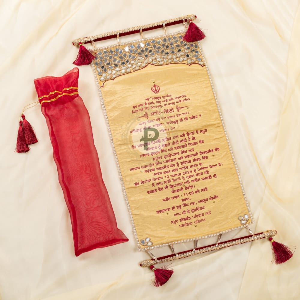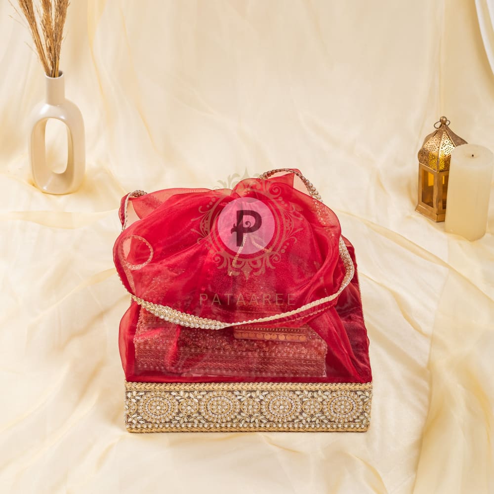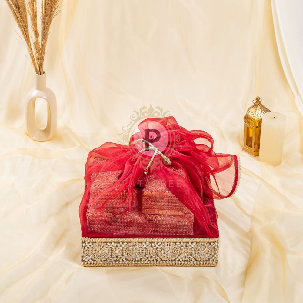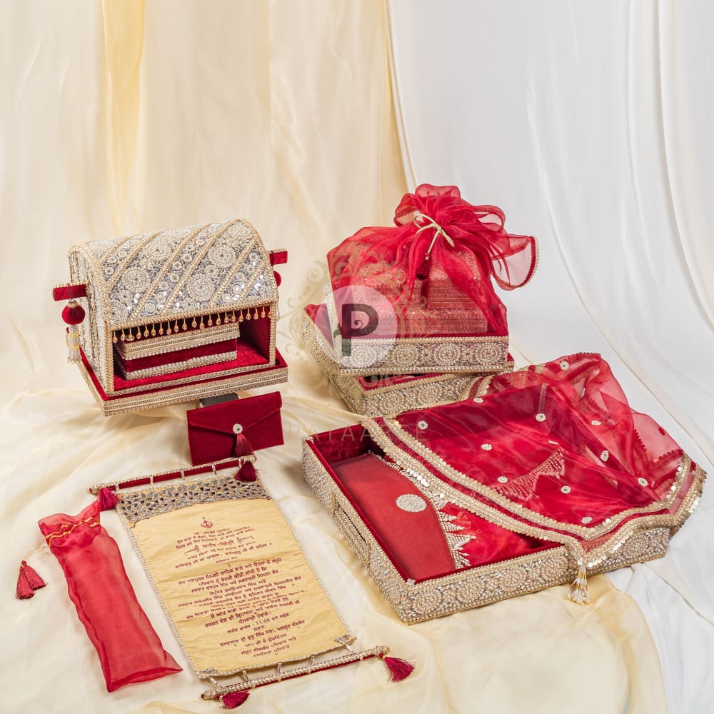 This Maroon Zehra Palki brings your Sahe Chithi to life in a way that’s as meaningful as it is beautiful. The deep, rich maroon velvet is complemented with golden details, making this palki a stunning representation of tradition and grace. The mithai box adds the sweetness that marks this special moment, while the fabric scroll holds your heartfelt message. Shagun envelopes are included to carry your blessings, ensuring love and good wishes are shared between families. The tray with cover keeps everything protected and perfectly organized, while the tissue baskets offer space for small gifts or dry fruits. The suit cover ensures that your ceremonial attire stays fresh, safe, and ready for the big day.