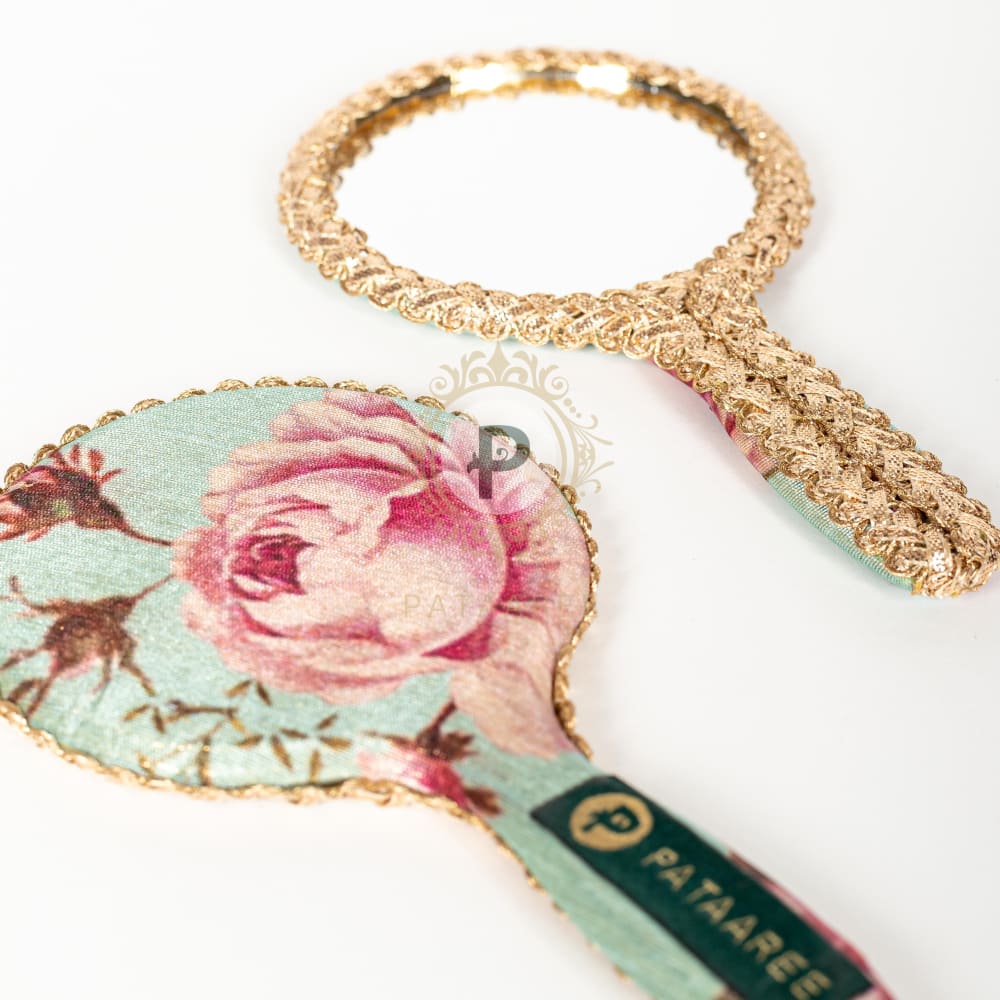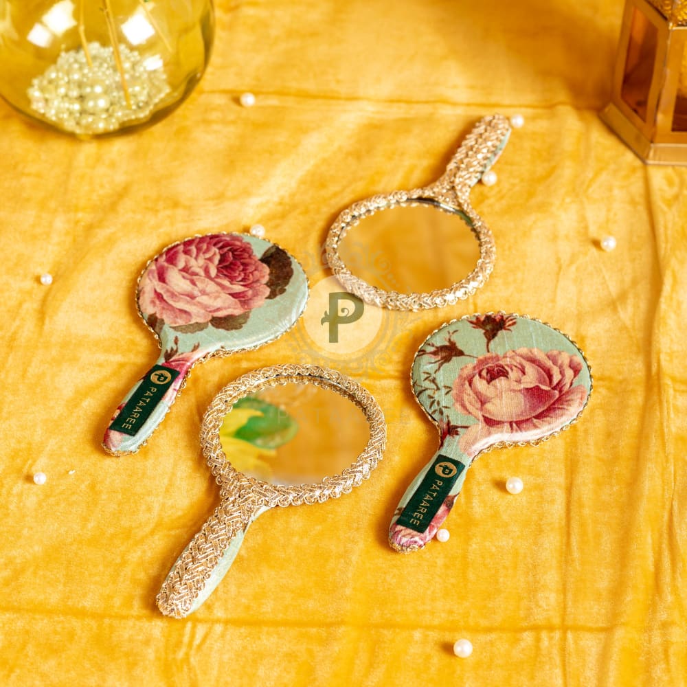 Embrace elegance with our Small Hand Mirror, featuring floral silk and intricate gota detailing. Perfect for mehndi and wedding favors, it blends traditional craftsmanship with modern style.