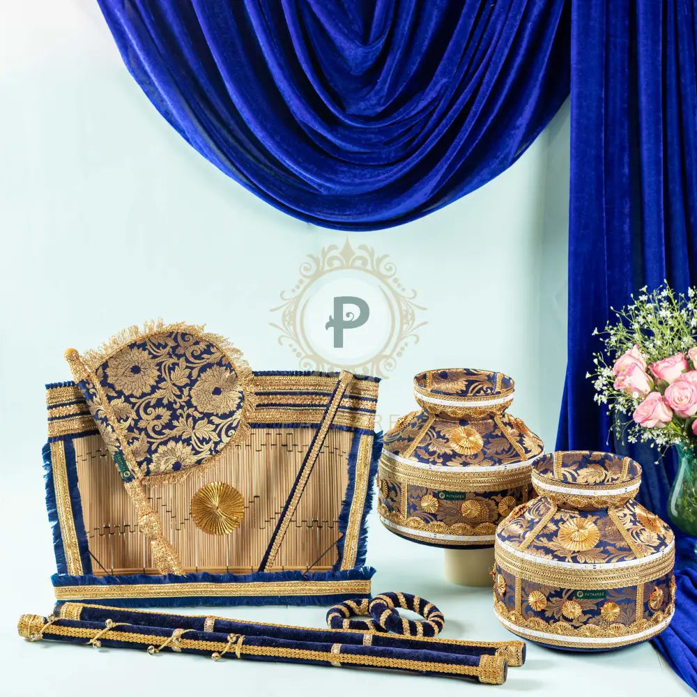 Wrapped in the royal colours of blue and gold, our navy blue brocade brass jaago is a regal melange of style and sophistication. From the gold trims wrapped around the two matkas with traditional golden phulls acting as marvelous highlighters, the quintessential chaj with gold gota work and blue trims and a stick, the jaago danda with ghungroos in blue velvet to lend a rhythm and beat, to the decorative uno for the matkas and the handcrafted satrangi brocade pakhi, an heirloom of love, the blue brocade set is a must-have for a memorable jaago ceremony.