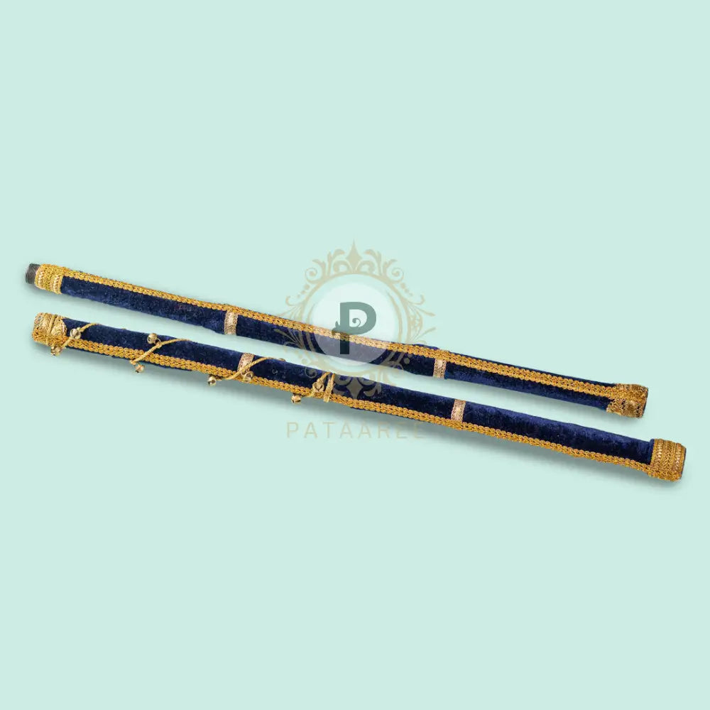 Make a bold statement at your Jaago ceremony with our Navy Blue Velvet Jaago Danda, exquisitely wrapped in plush velvet and adorned with shimmering gold gota and traditional ghungroo. This elegant piece doesn’t just complement the celebration—it becomes the highlight! Watch it come to life with every beat of the dhol, lighting up the dance floor all night long. A must-have for those who love to keep traditions alive with a touch of royal charm.