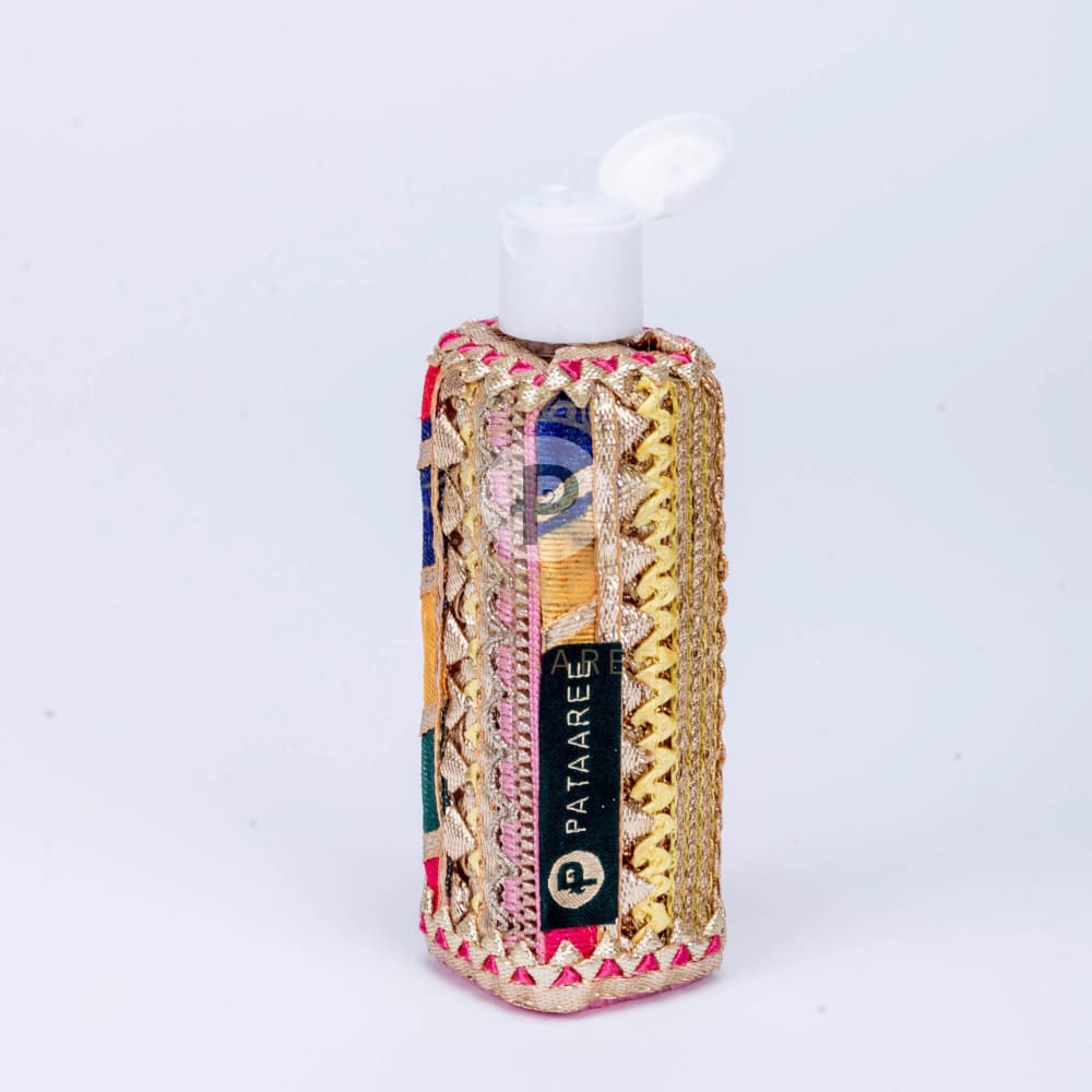 Forget slippery plastic/glass oil bottles lying around - compliment the ceremony with our oil bottle looking quite fancy in Satrangi trims in bubblegum tones with pink velvet.