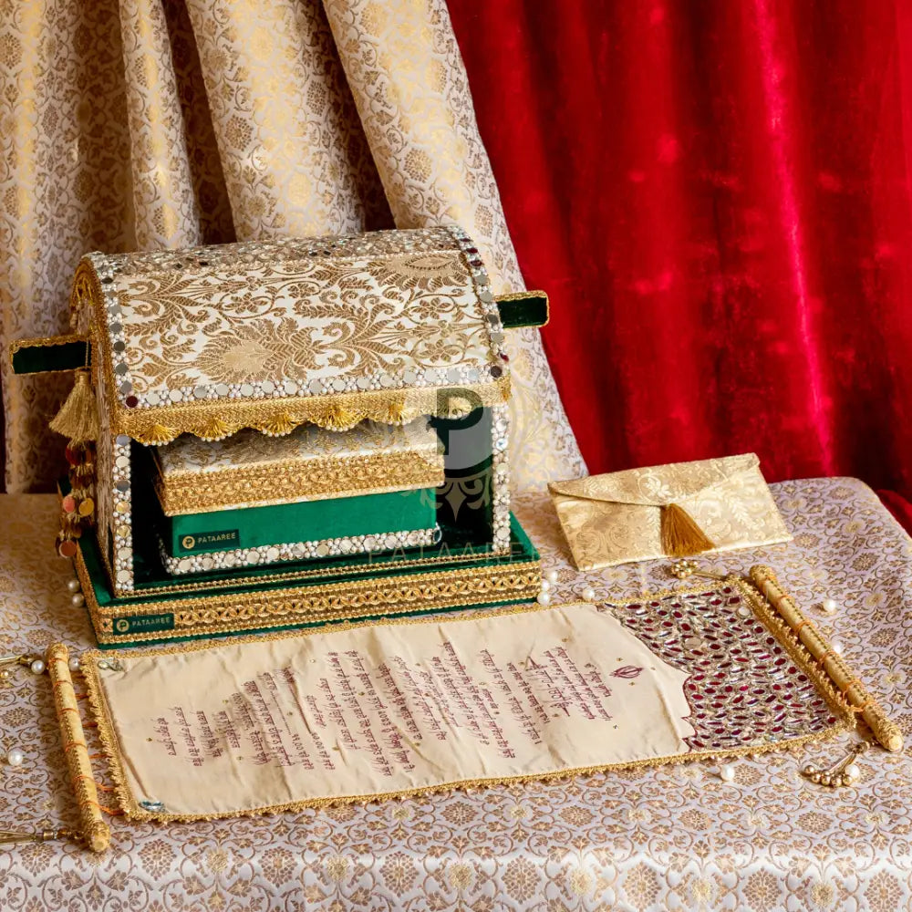 Timeless Ivory and Green Palki Sahe Chithi Set with Screen Printed Fabric Scroll