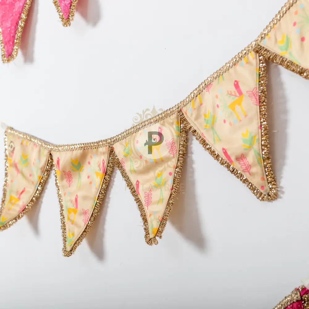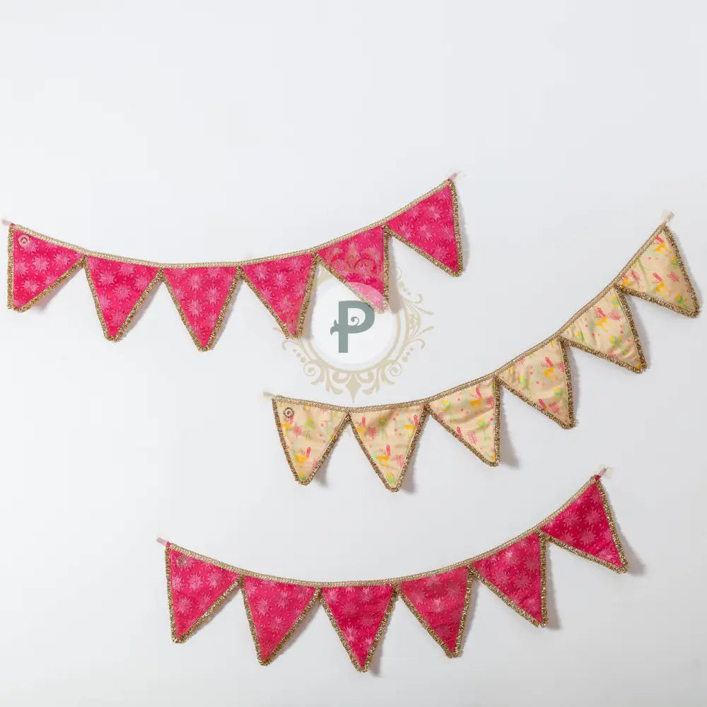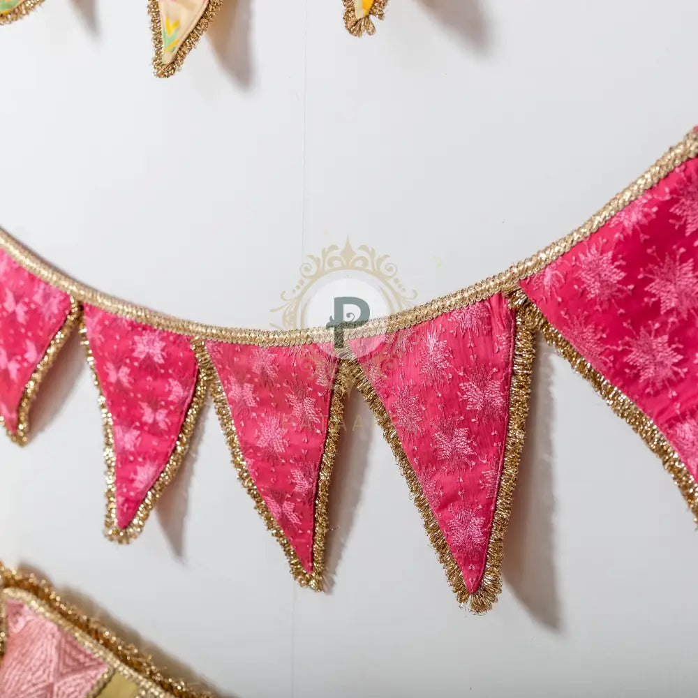 Welcome new beginnings and auspicious tidings in your home this lohri with our exclusive bespoke triangle shaped buntings made with love with pastel phulkari as the theme, and finished with gold trims and badla. Available in sets of three, in phulkari self fabric and phulkari motif printed fabric.