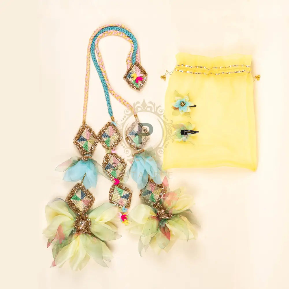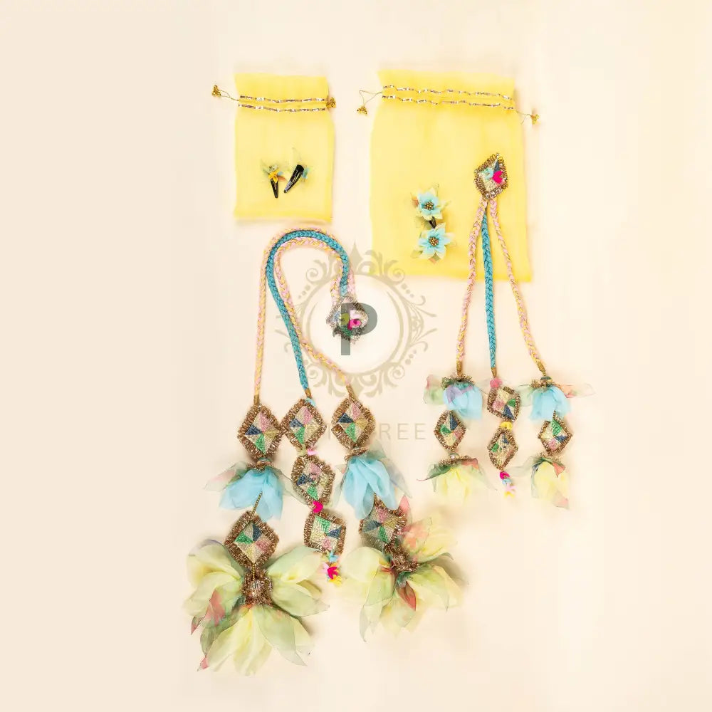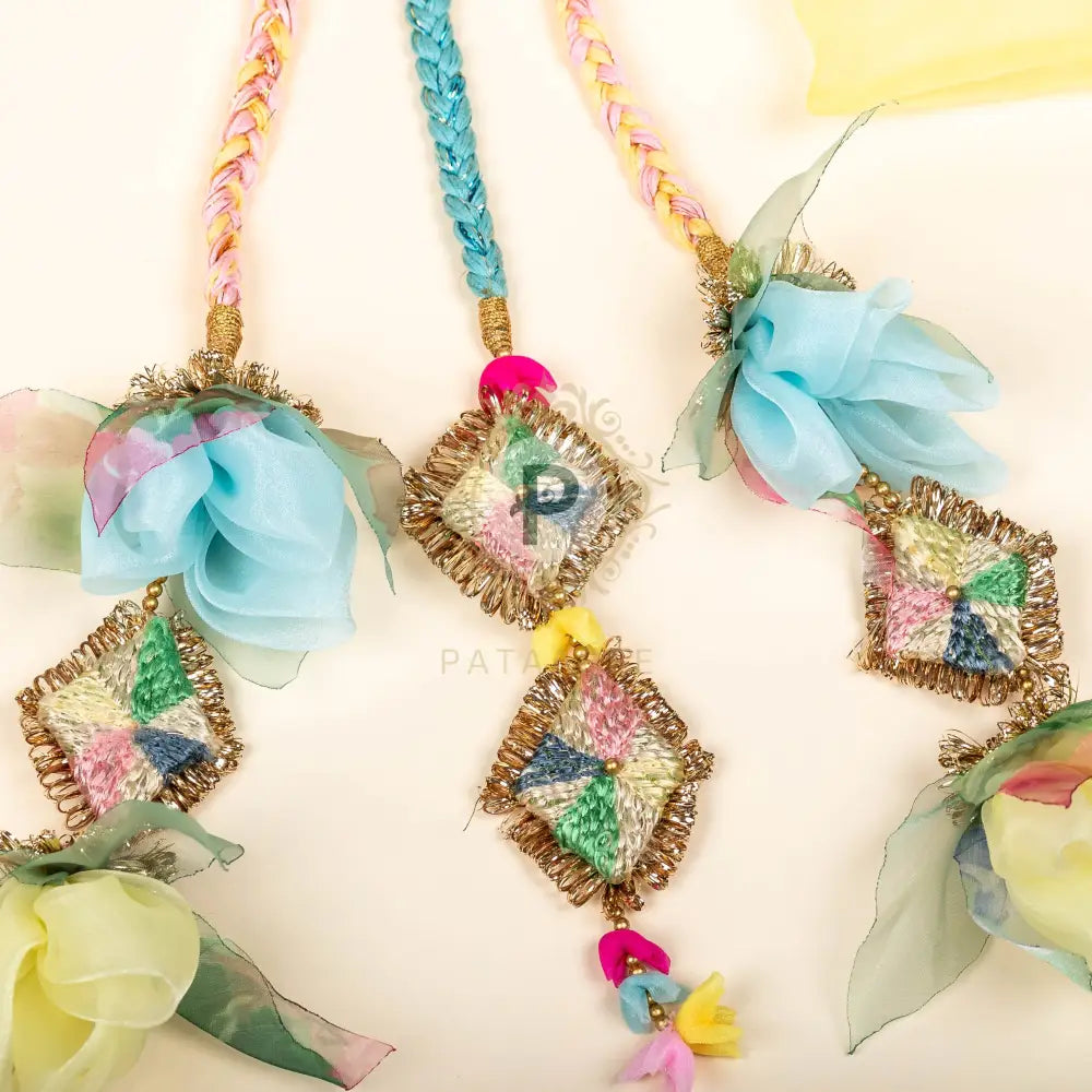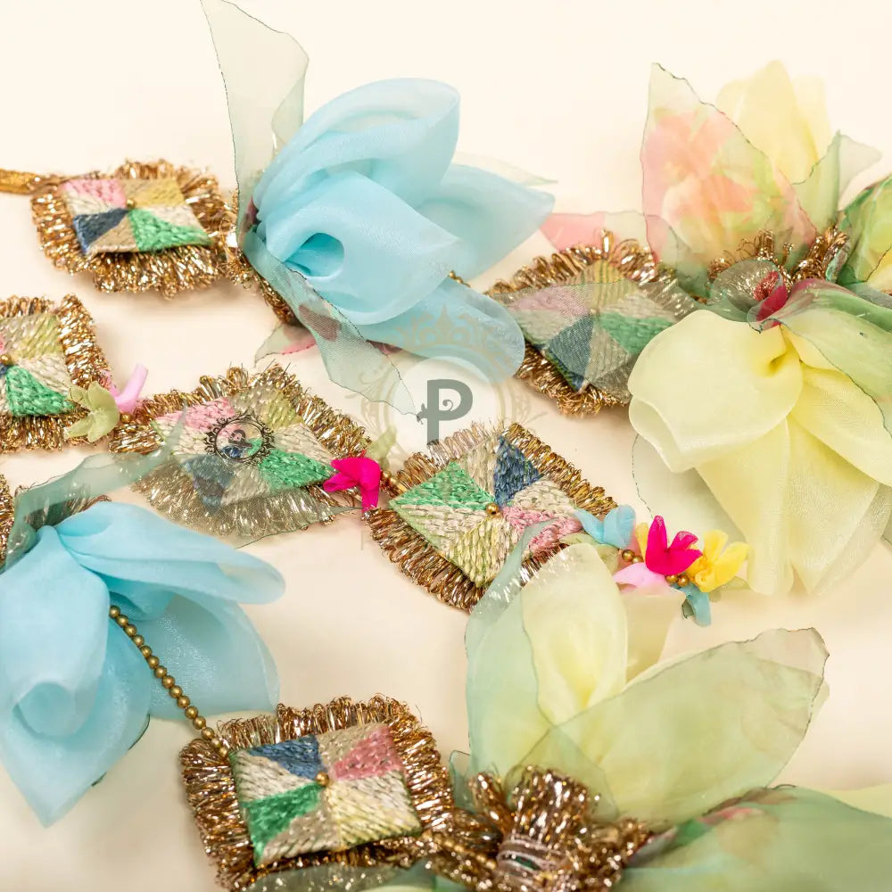Celebrate tradition with a modern twist with the Sada Bahaar Parandi, designed creating cherished memories. This mother-daughter twinning piece is adorned with delicate Phulkari-inspired flower motifs, handcrafted with finesse. The pastel-shaded anchor threads beautifully complement the intricate small tissue flowers and baadla trims, adding a touch of grace.