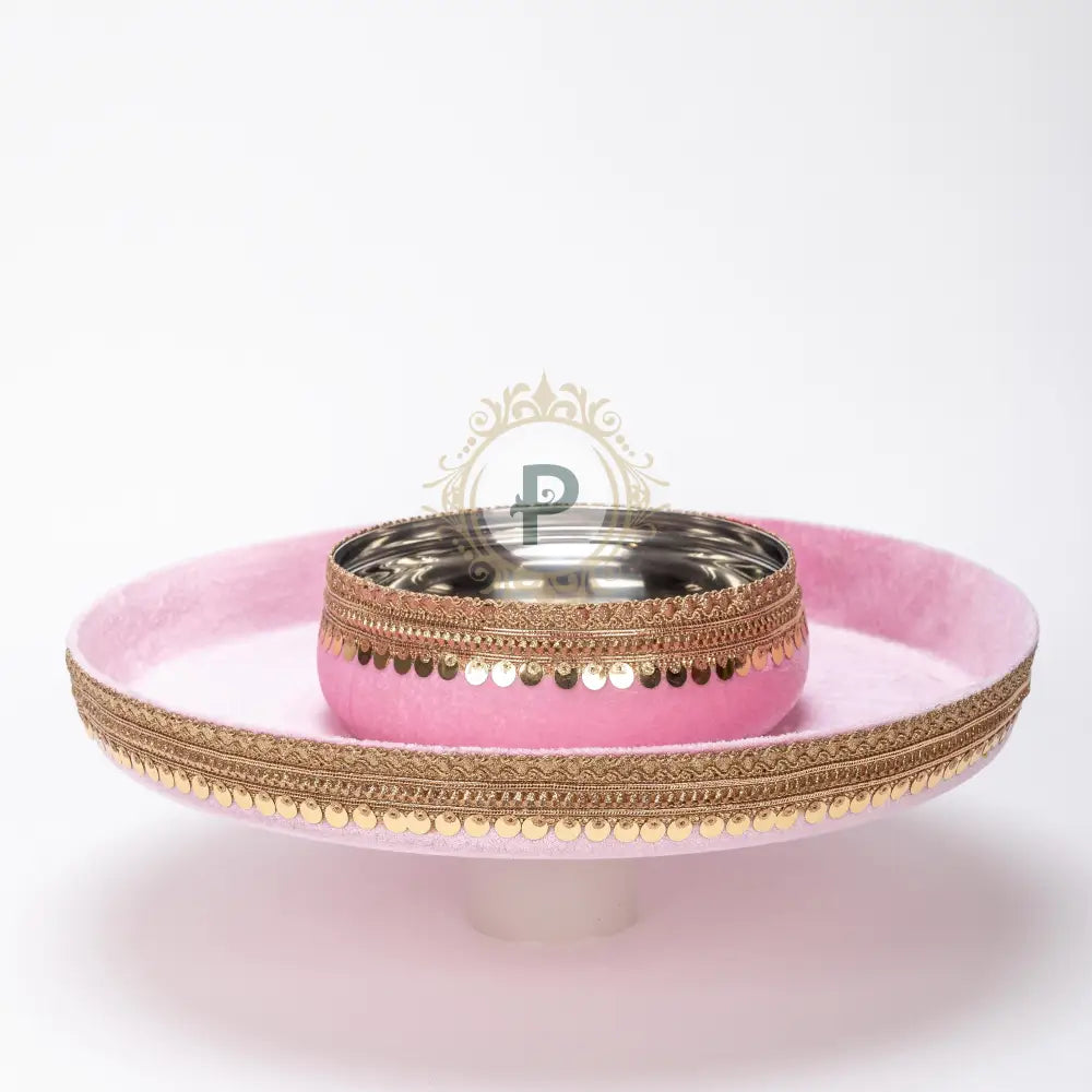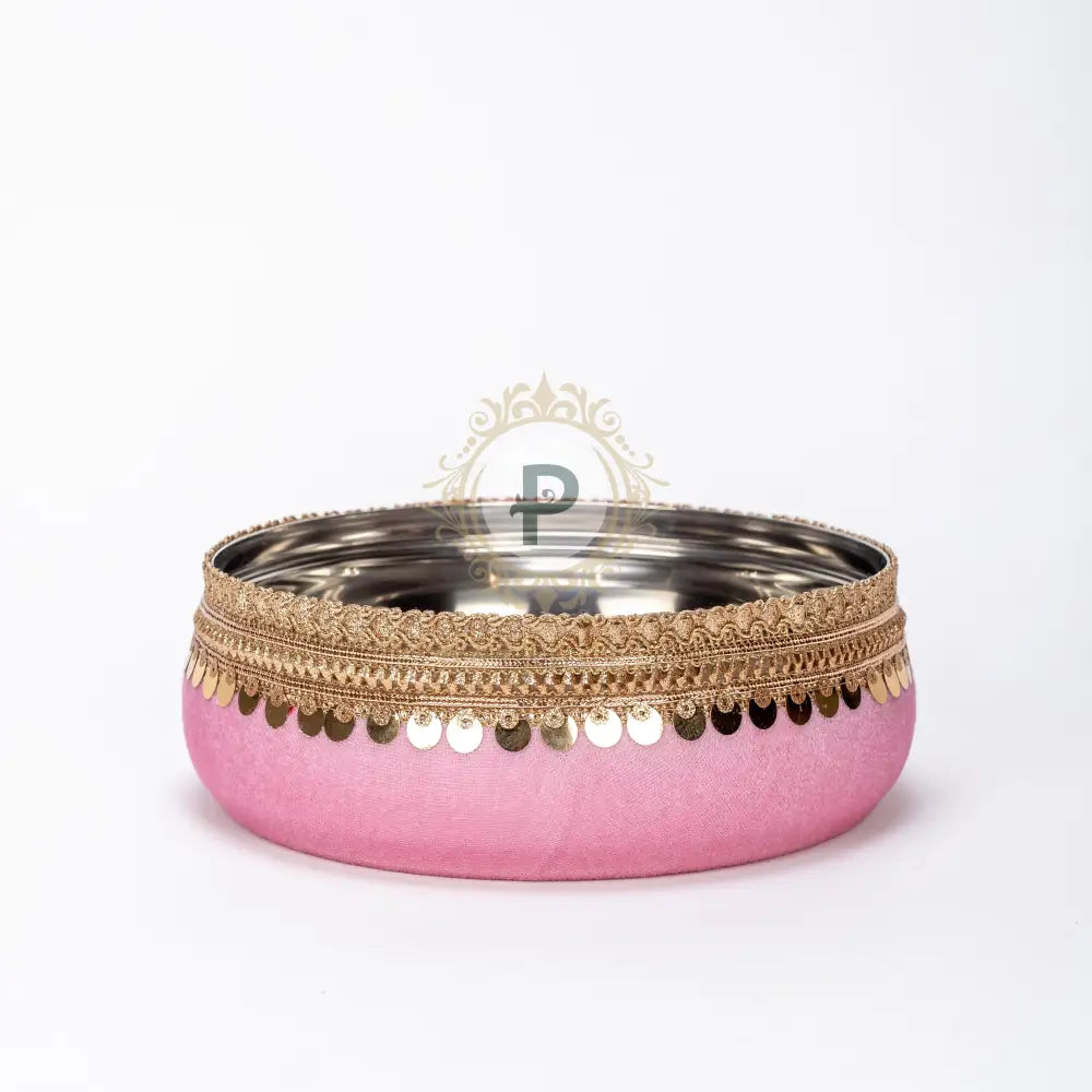 Enhance your Chura ceremony with our elegant Thaal, featuring soft pastel pink velvet and delicate trims. This stylish piece includes a durable stainless steel bowl for both practicality and charm, making your special day beautiful and unforgettable. Perfect for the Chura ceremony, it combines function with grace.