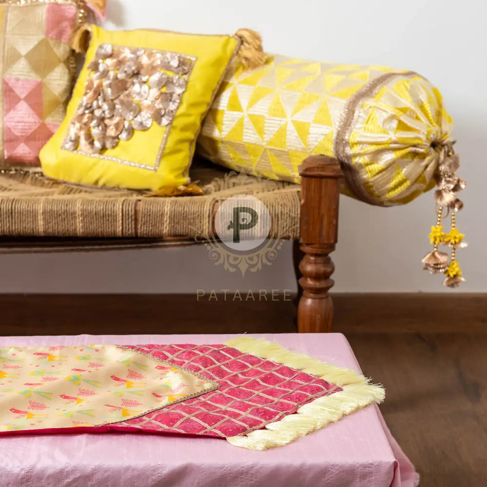 Celebrate Lohri with warmth, tradition, and joy. As the bonfire crackles and folk songs fill the air, savor treats like rewari, gachak, and peanuts. Enhance your festivities with our handmade pastel phulkari bolster covers, table runners with gold dori tassels, and pastel phulkari cushion covers. Welcome new beginnings with our bespoke pastel triangle-shaped buntings, crafted with love, gold trims, and badla.
