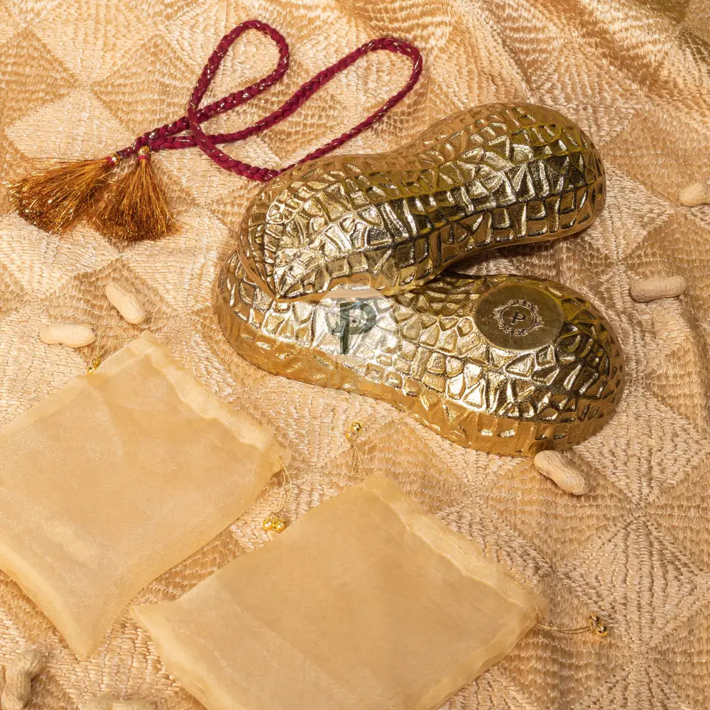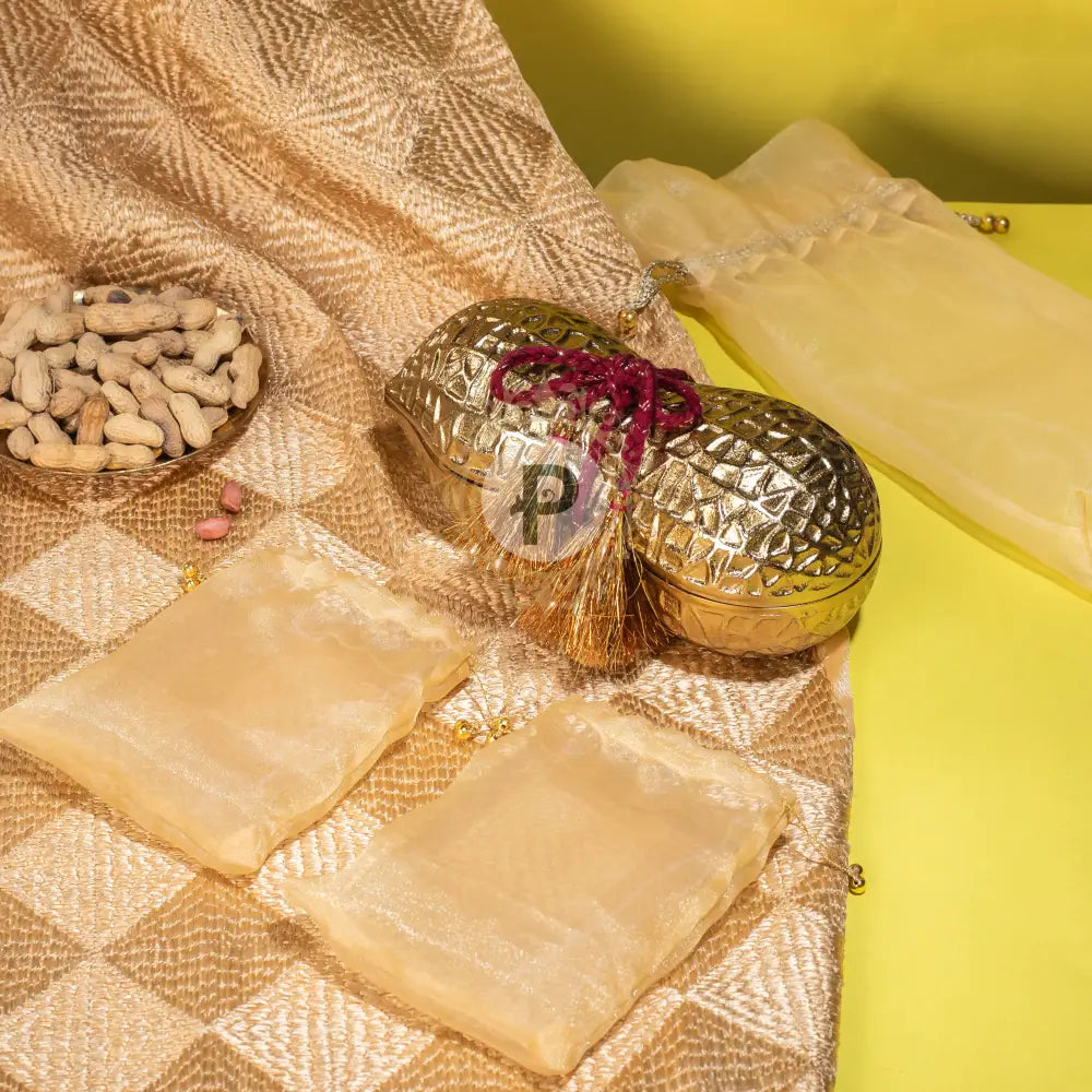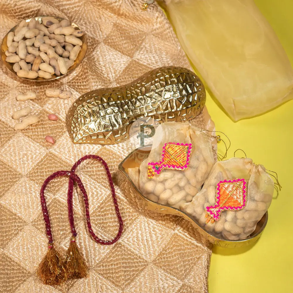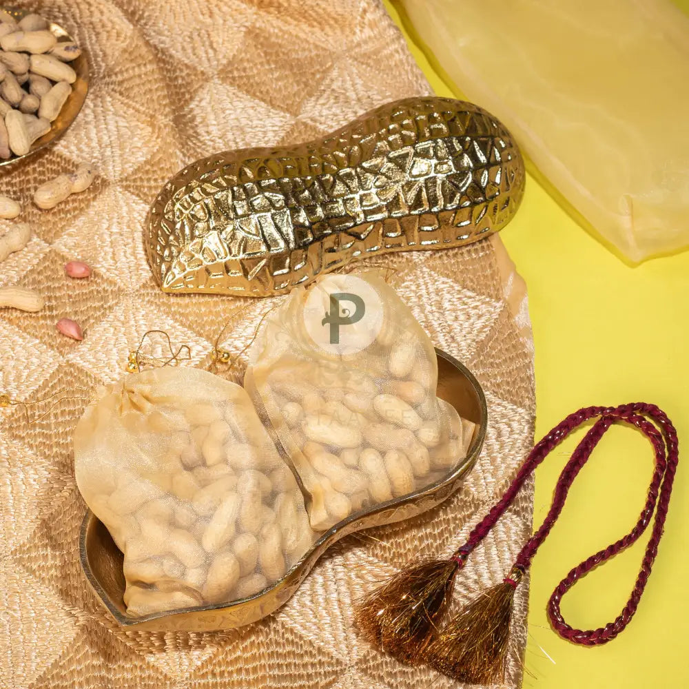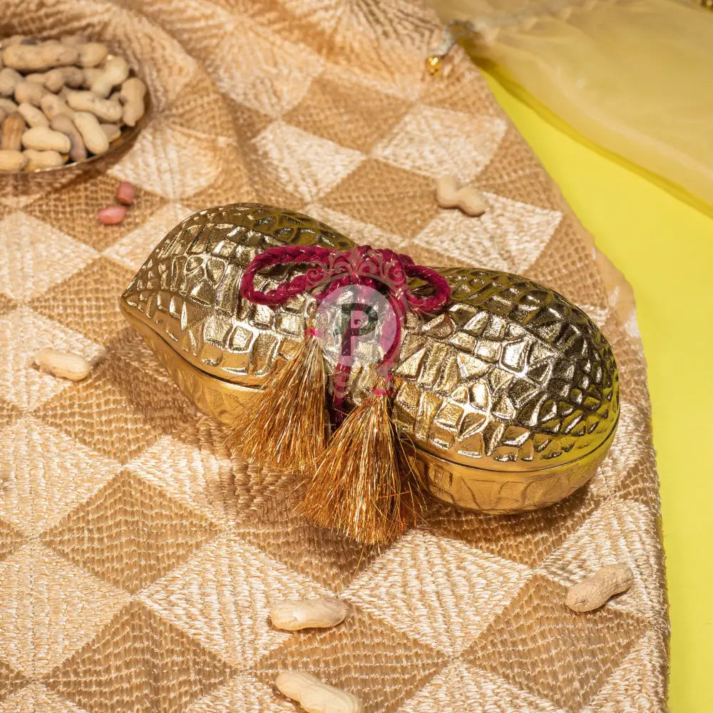 Gachak, moongphali, rewari, popcorn, nuts - the super snacks and what better than to gift them in a rich looking peanut box this Baisakhi. Make your first Baisakhi golden with our gold coloured peanut shaped peanut box that comes wrapped in hand-braided dori and two mini tissue potlis. Precious, ain’t it!