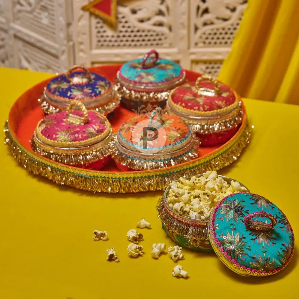 Phulkari Thaal with 5 Small Ladoo Boxes