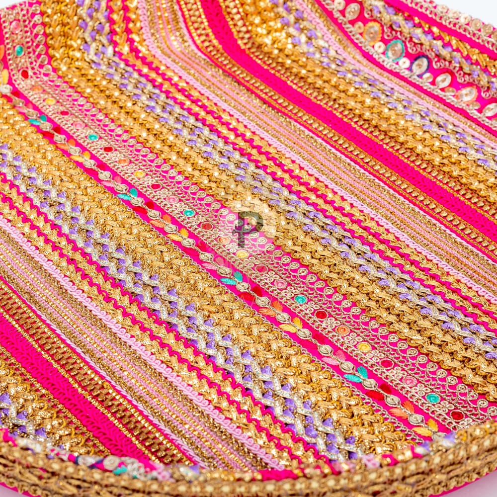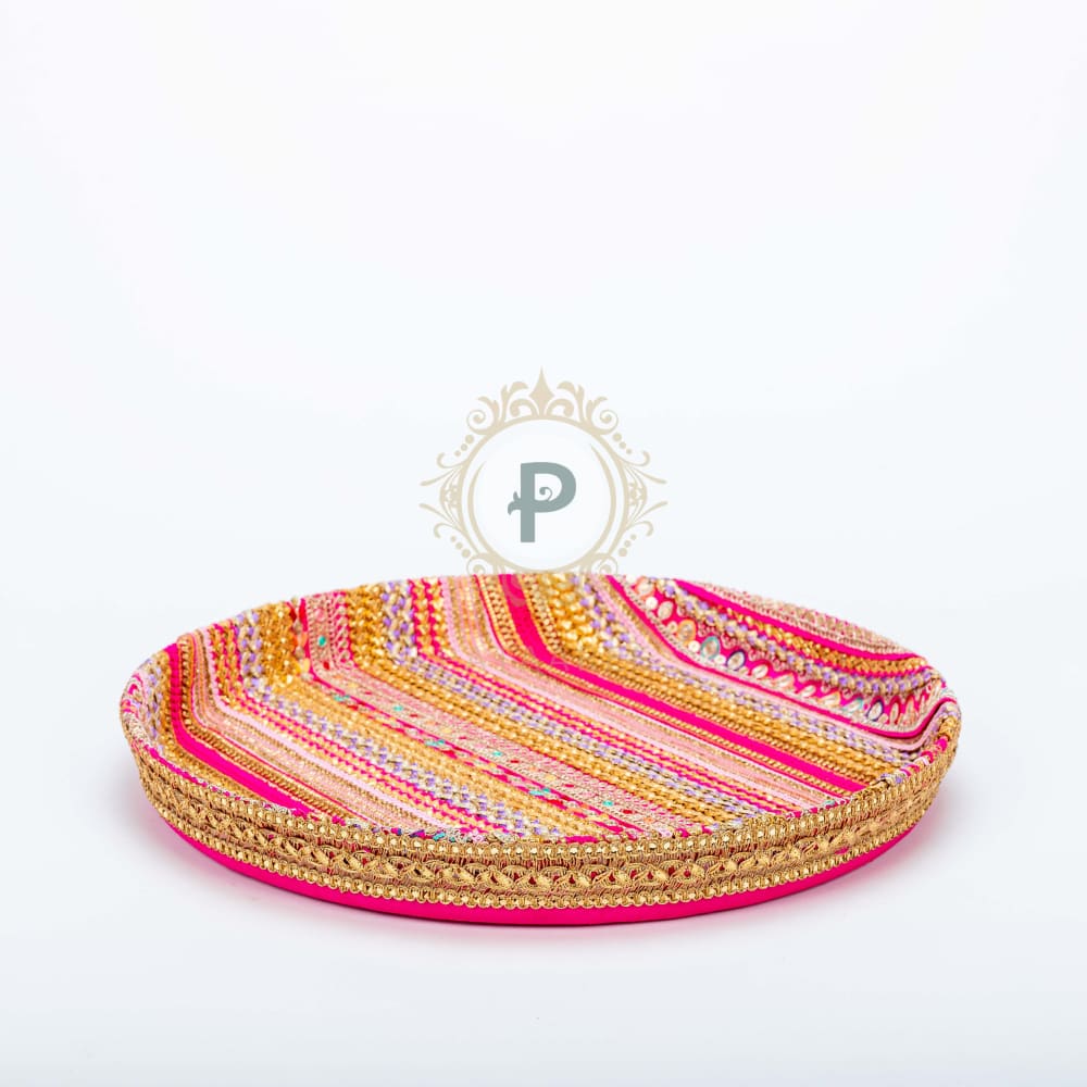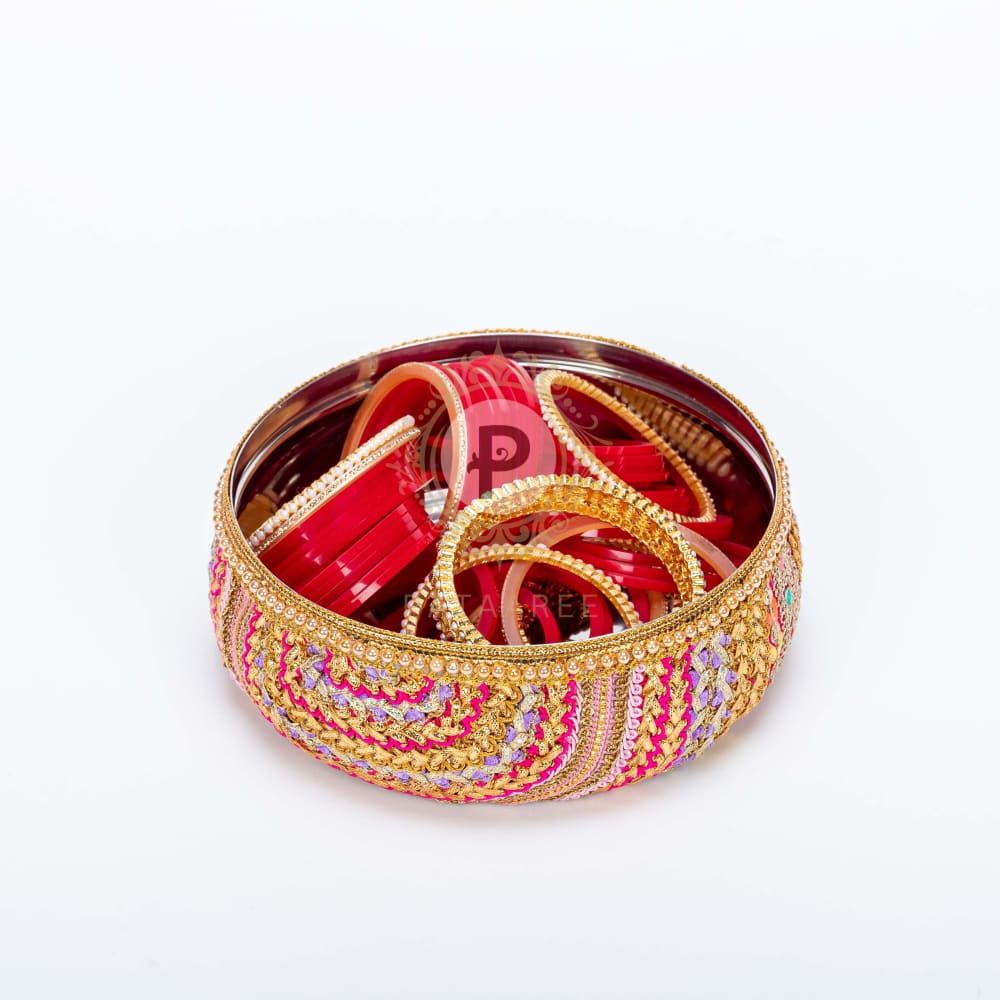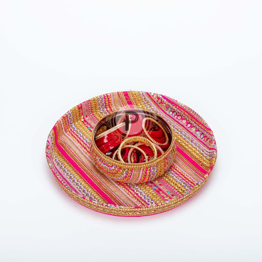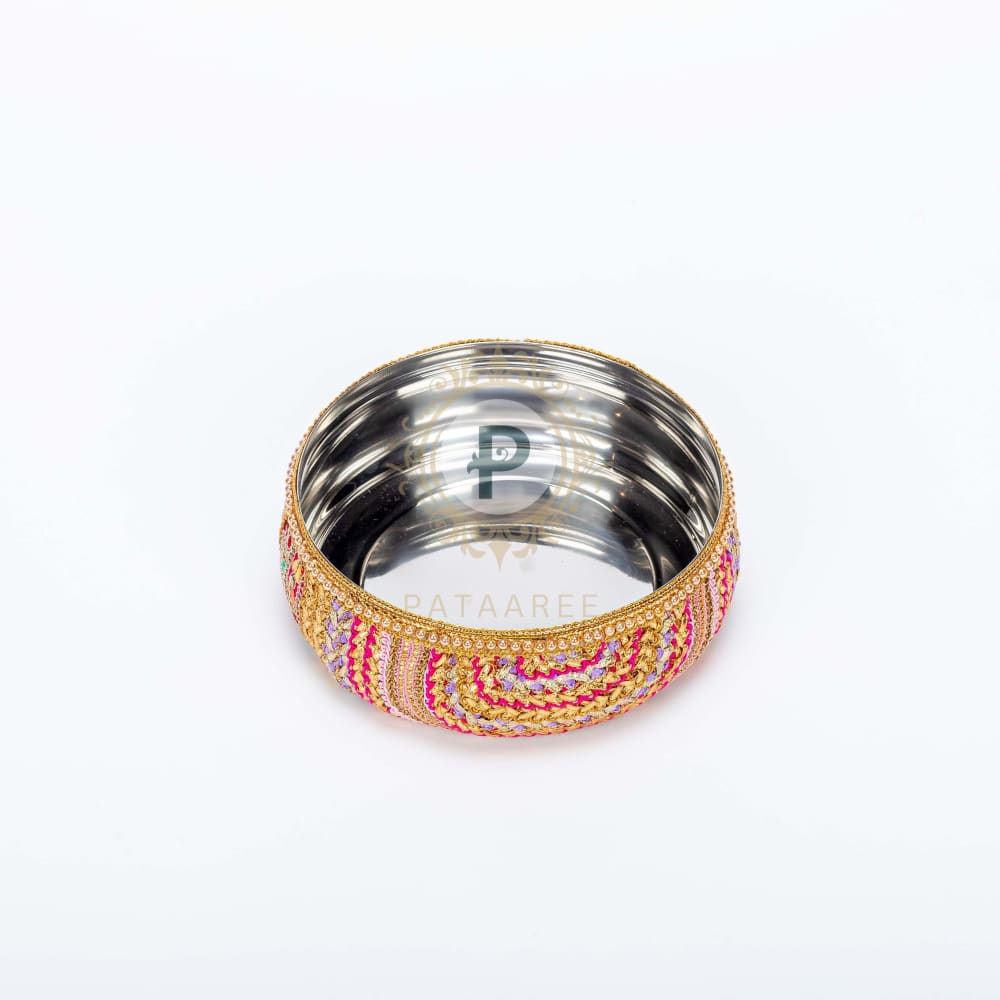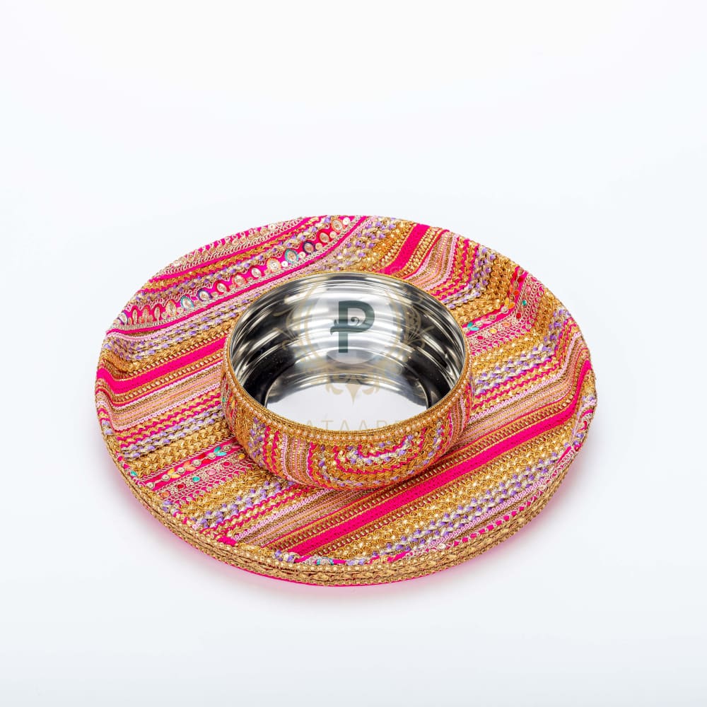 Complete your chura set with the meticulously handcrafted hot pink satrangi thaal and bowl to cleanse the chura for this momentous ceremony.