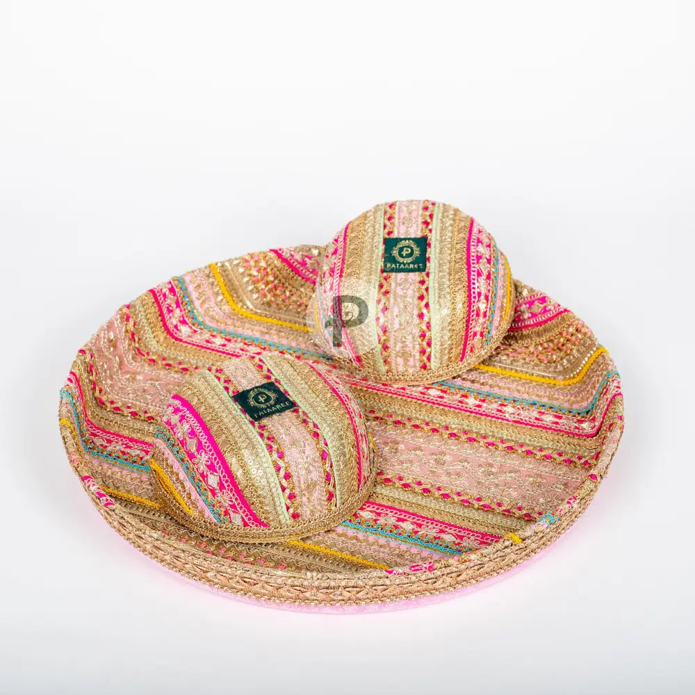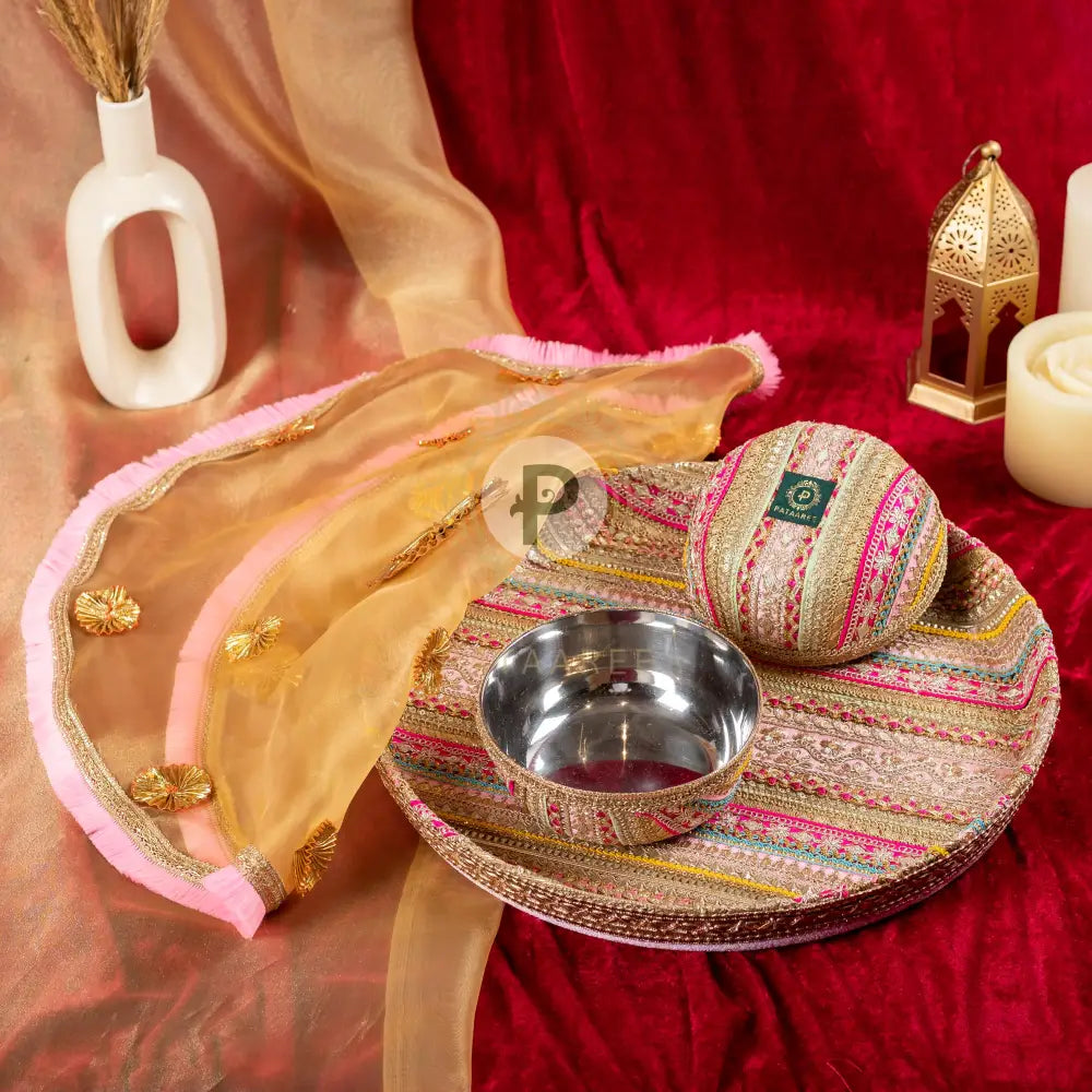 Be it Mehendi, Haldi, or Maiyan, no ceremony is complete without a traditional thaal. Present your henna and haldi in style with our Pink Satrangi Thaal — a festive essential adorned in soft bubblegum hues and finished with luxe pink velvet. Comes complete with two matching bowls and a coordinated cover, trimmed to perfection for a vibrant celebration look.