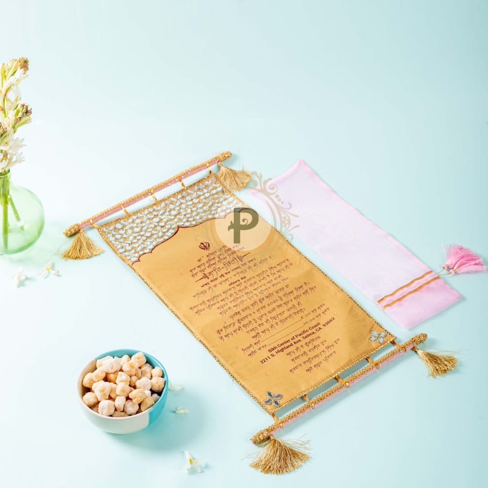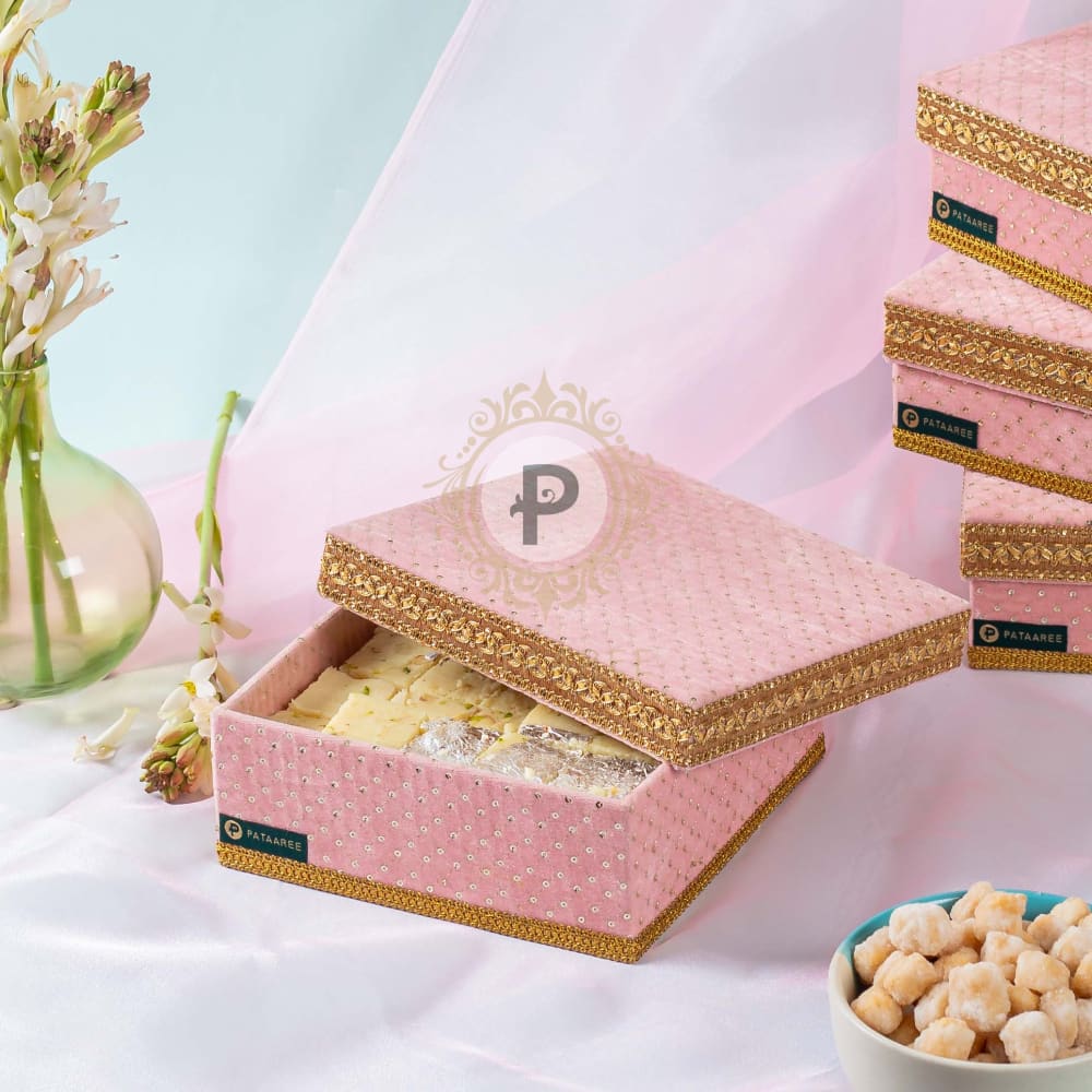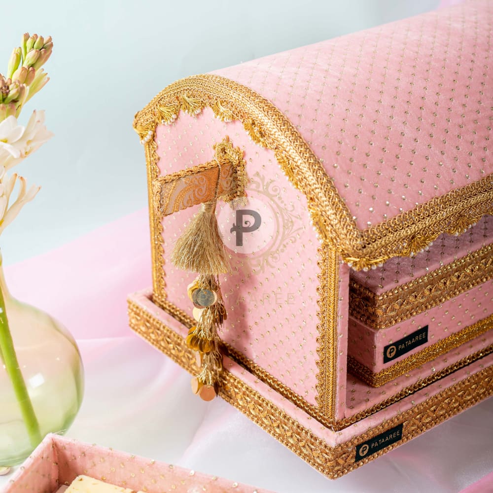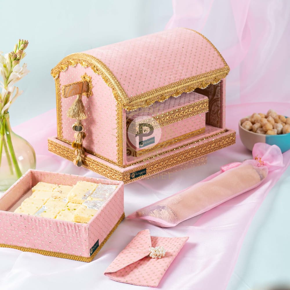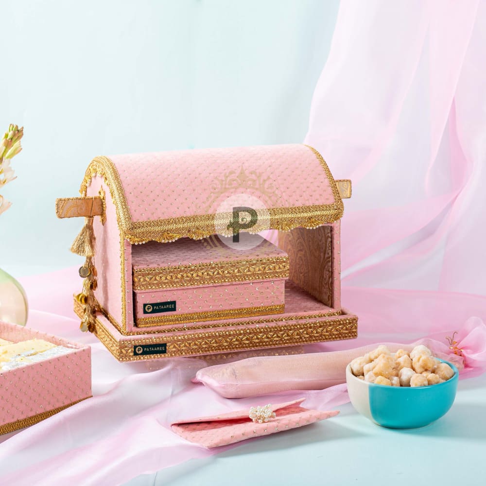 The Sahe Chithi isn’t just a message. It’s a heartfelt exchange between families. This Blush Pink Velvet Palki turns that gesture into something unforgettable. Made in soft pink velvet, it feels like a warm hug from one family to another. The mithai box adds mithas to the moment, and the printed scroll carries your loving words. Shagun envelope mark the start of a new journey with blessings.