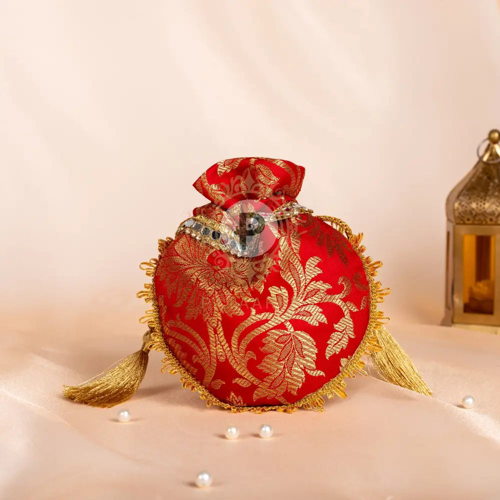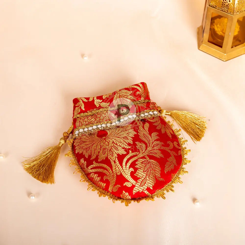 Potlis are the perfect blend of functionality and beauty for weddings. Ideal for wedding invitations or shagun ceremonies, these mini potlis can also be filled with sweets or accessories as charming favors. Our premium brocade mini potli with gold trims is perfect for your special occasion. Order now!