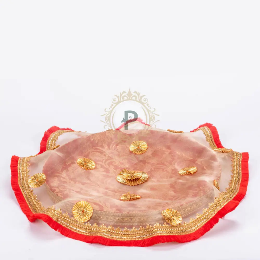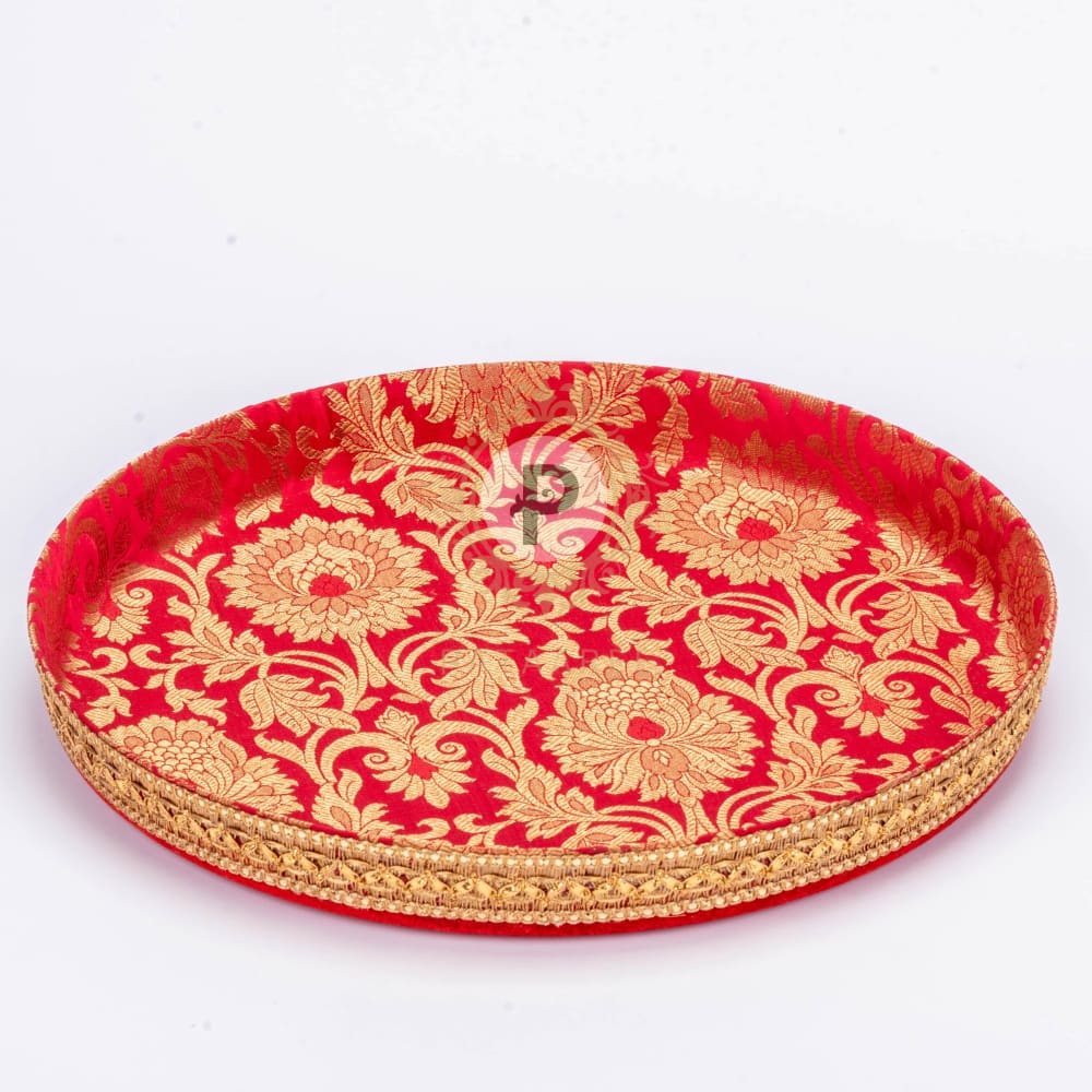 Elevate your ceremonial moments with our Red Brocade Thaal with Cover, a stunning symbol of love, tradition, and luxury. Wrapped in rich red brocade fabric and finished with intricate detailing, this thaal is perfect for gifting, wedding rituals, or displaying sweets and favors in style. The coordinated fabric cover keeps the contents dust-free while enhancing the presentation.