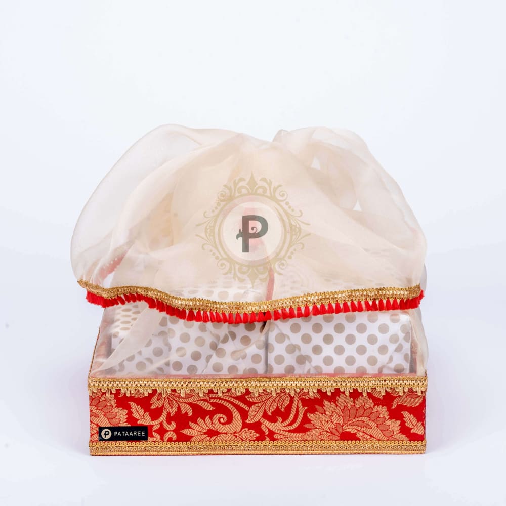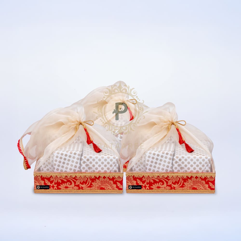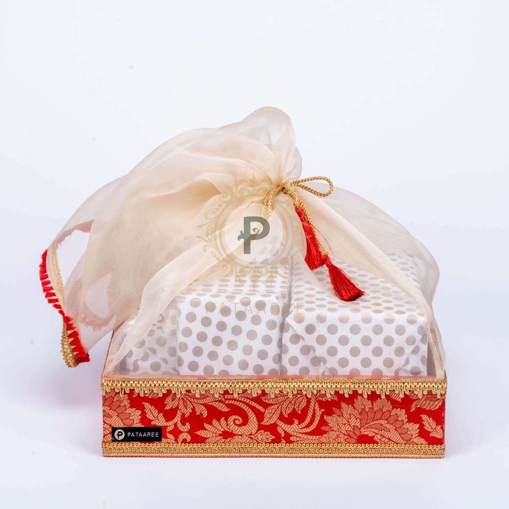 Leave behind bulky boxes—elevate your gift presentation with our handcrafted Red Brocade Tray Tissue Basket. Designed in rich red brocade, this elegant basket features shimmering gold tissue lining and luxe gold trim detailing. Perfect for weddings, festive celebrations, or special occasions, it adds a regal charm to your gift ensemble while keeping things light and graceful.
