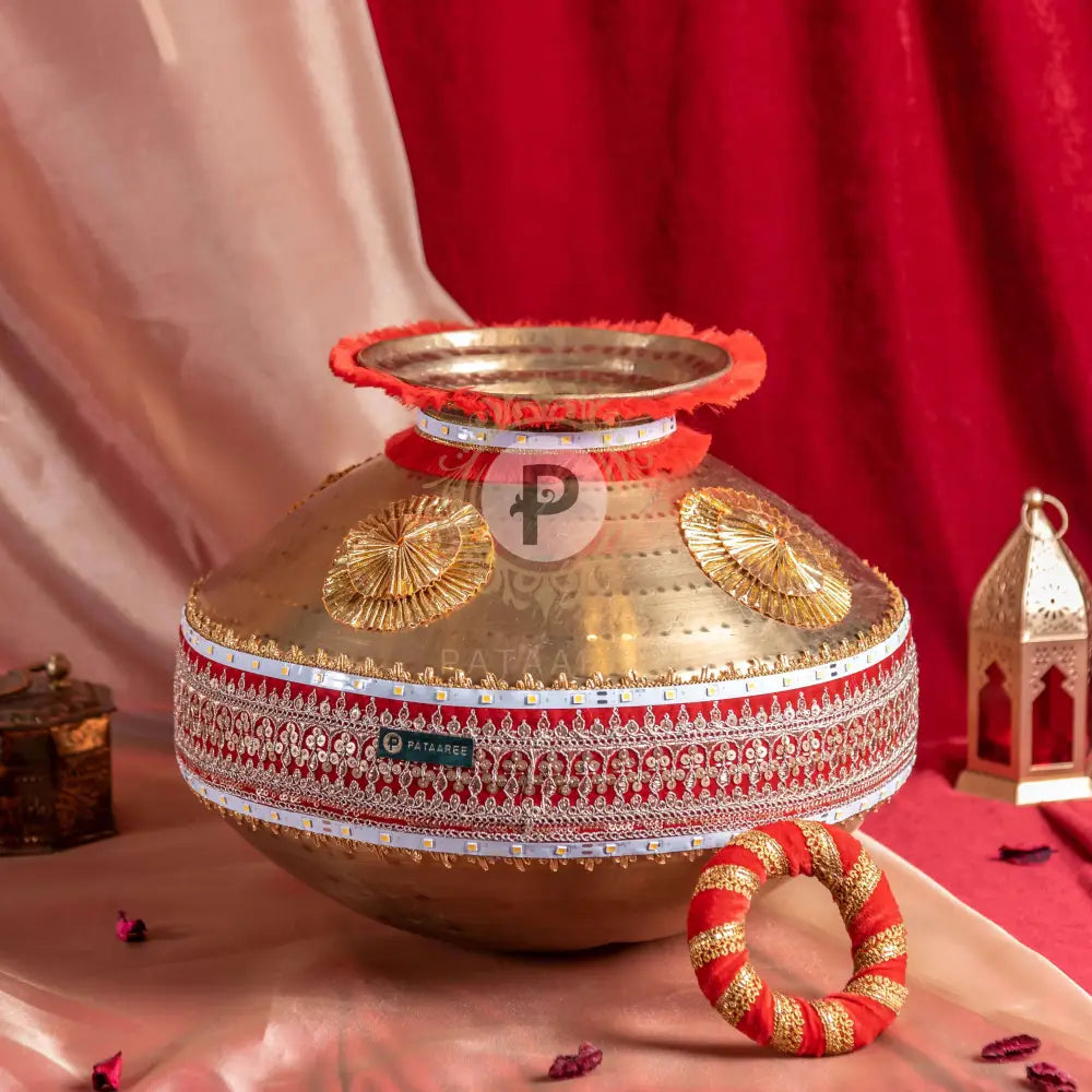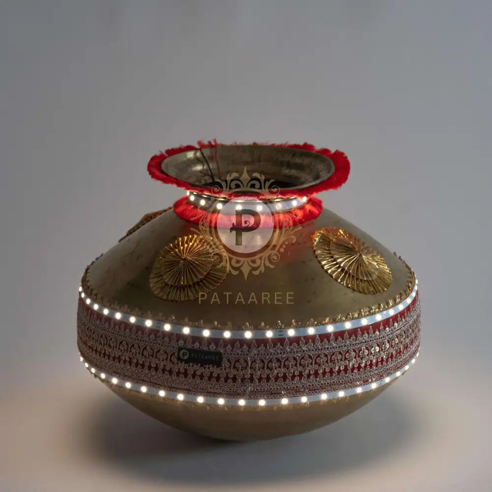 Bring a traditional sparkle to your Jaago night with our handcrafted Red & Gold Brass Jaago Matka, beautifully adorned and fitted with LED lights for a magical glow. Perfect for creating an energetic, festive vibe during wedding celebrations, this matka adds a bold touch of Punjabi vibrance and heritage. The red and gold color palette brings out royal charm, making it a showstopper during dance processions and rituals.