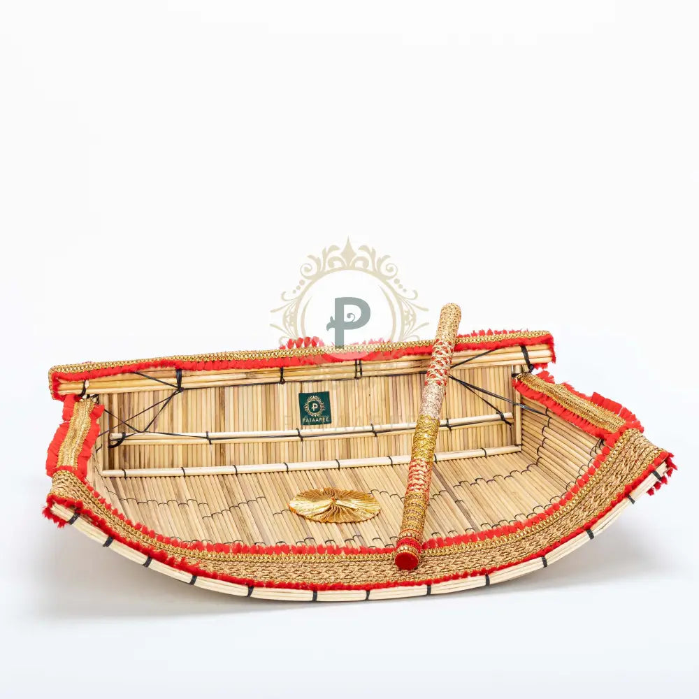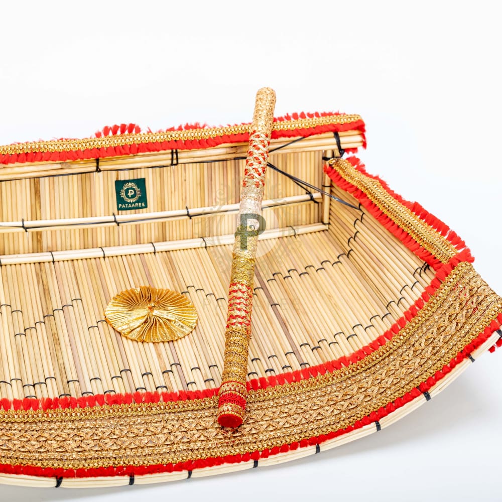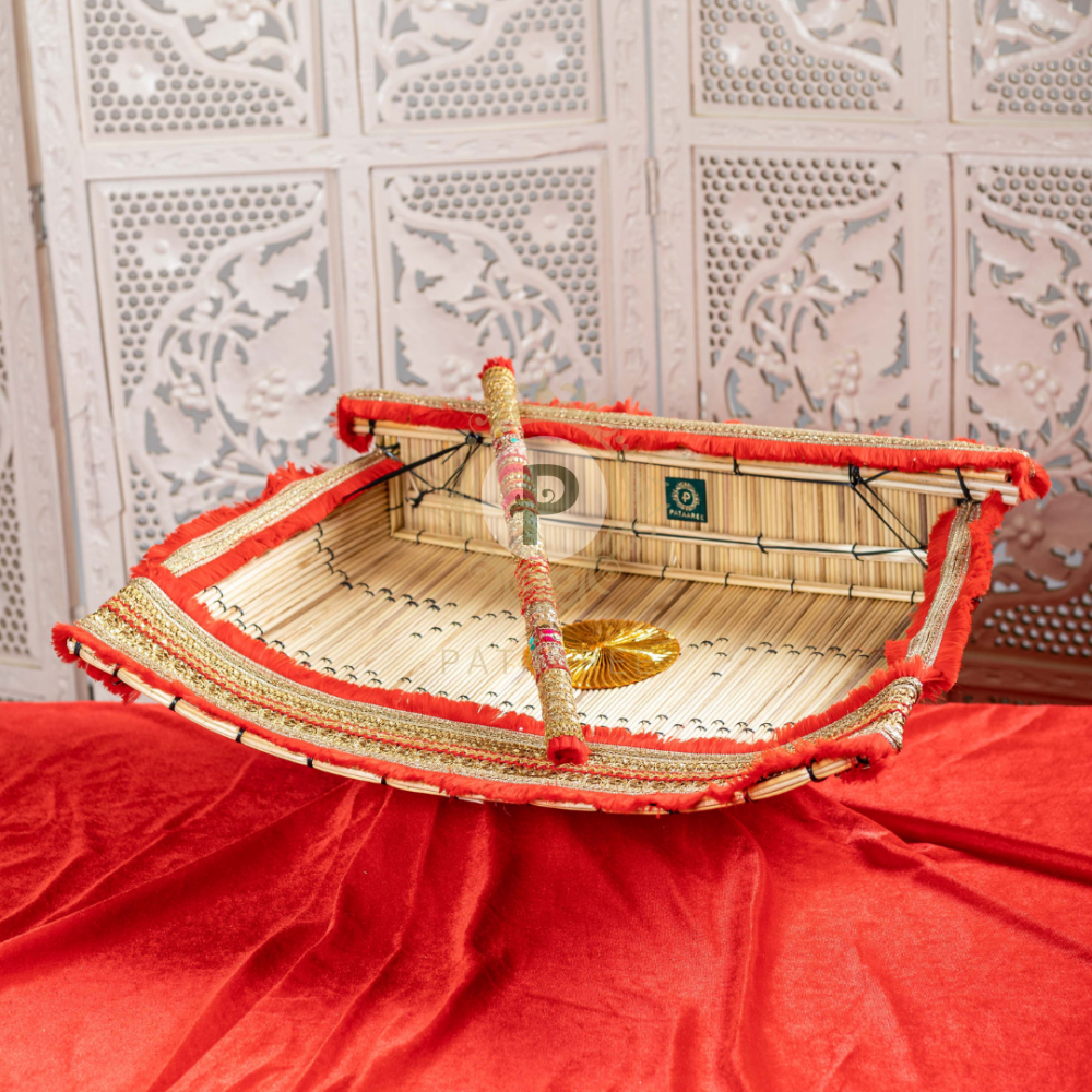 Set the stage on fire with the Red & Gold Chajj, beautifully adorned in satrangi style and finished with dazzling multicolor trims. This traditional accessory comes with a perfectly sized stick to tap in rhythm with your Jaago beats. Feel the joy rise as the bright red and gleaming gold hues bring unmatched energy to every wedding celebration. Let the dance begin!