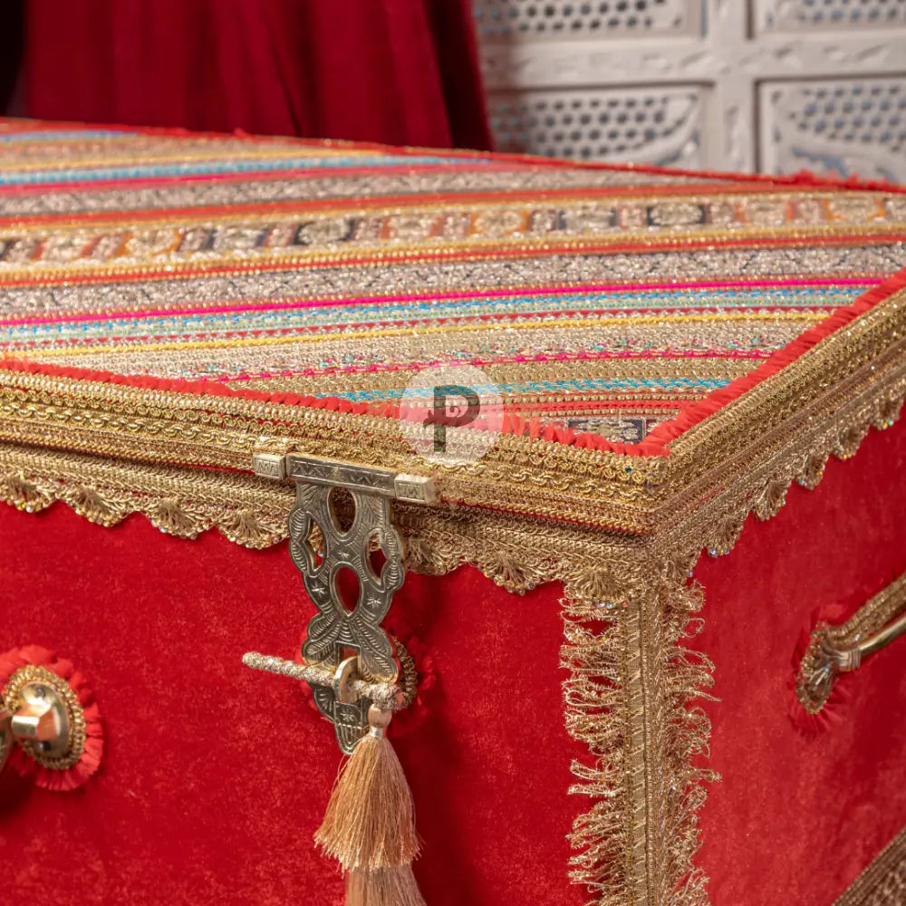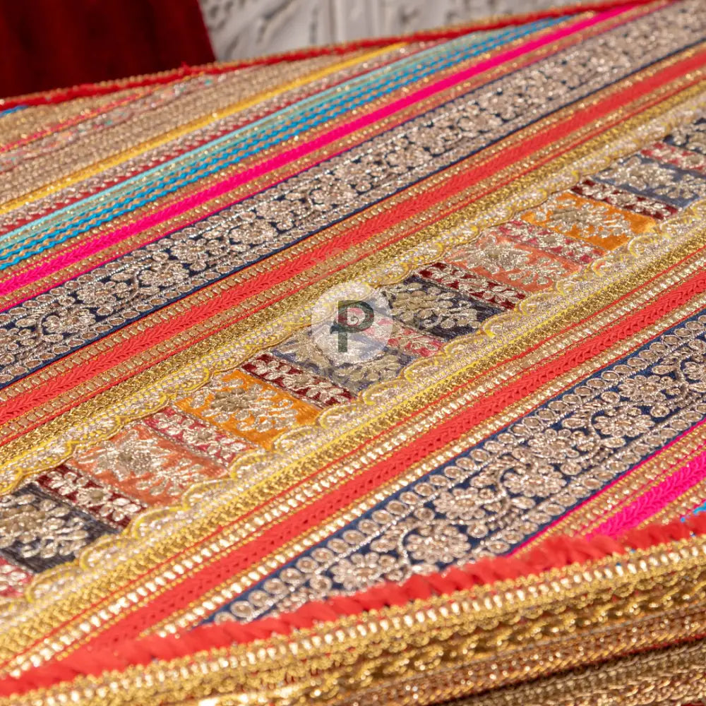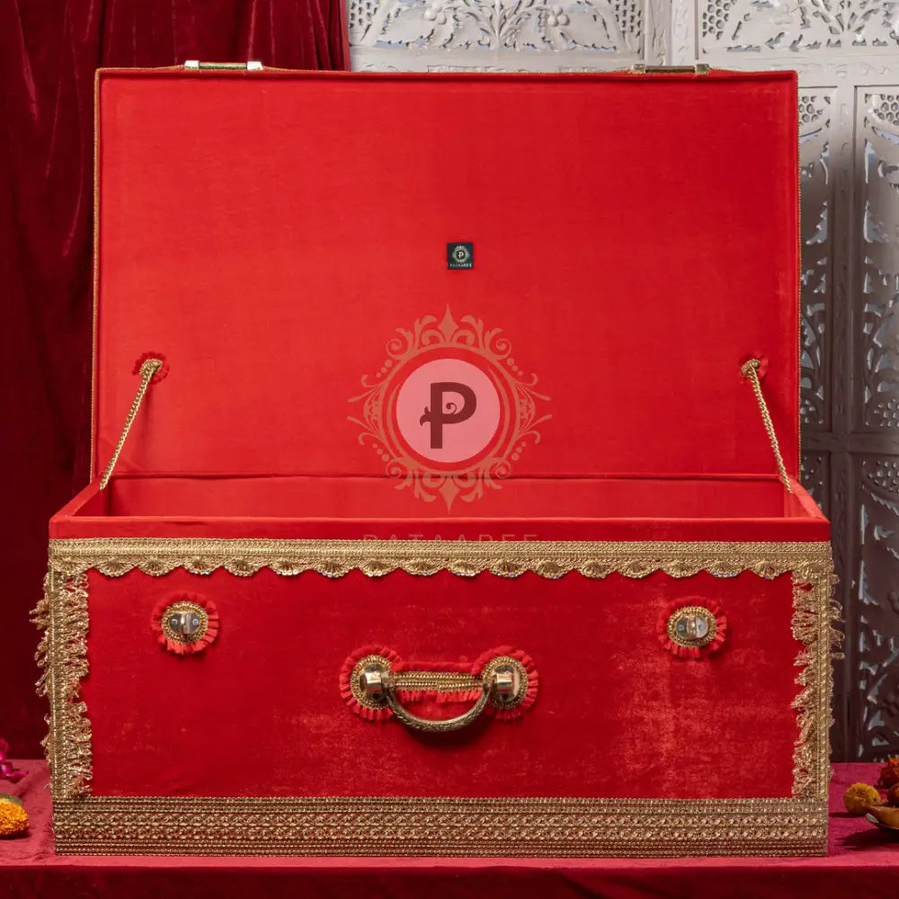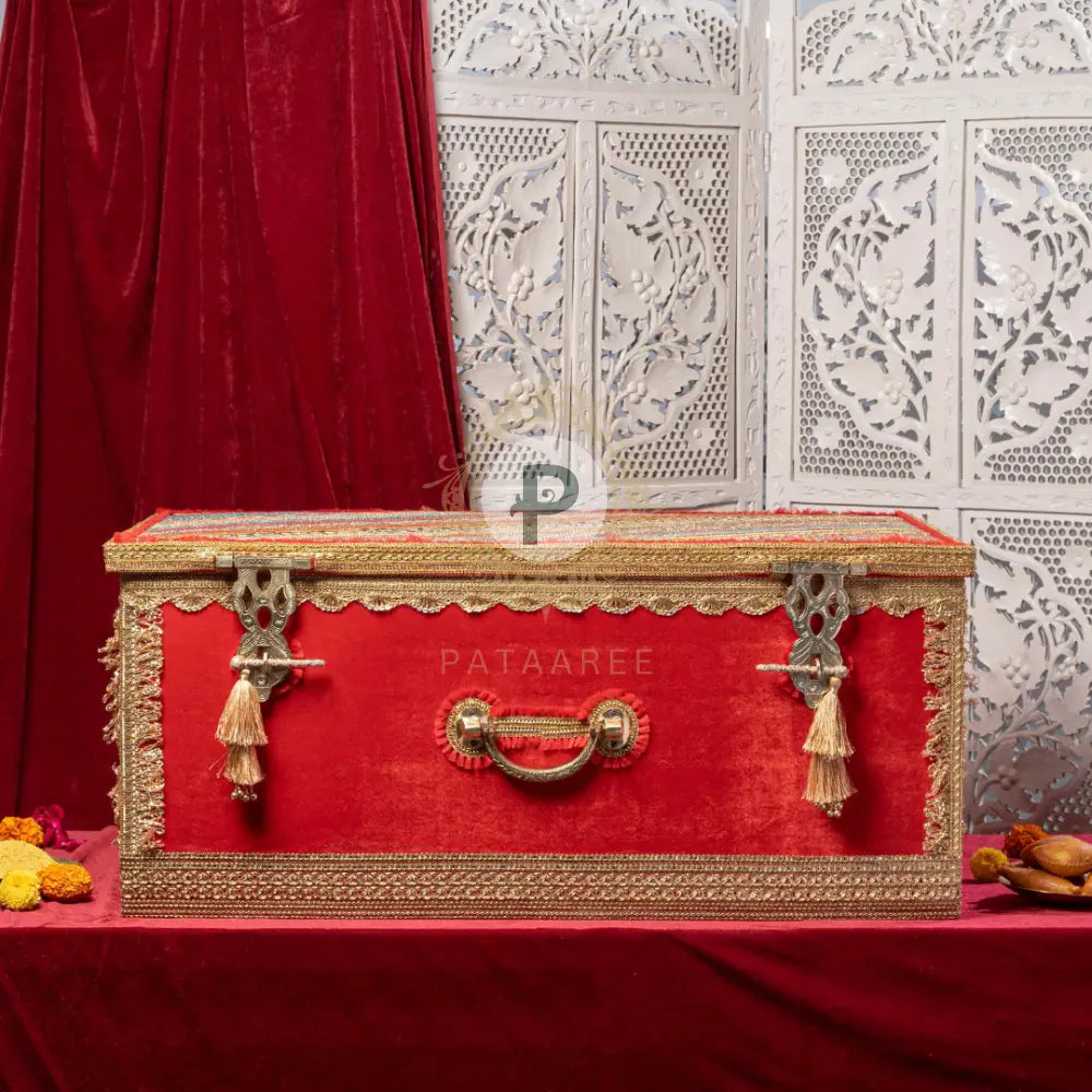 Distinctively luxurious, this handcrafted bridal trousseau trunk exudes elegance with satrangi and gold trims. Ready to start the journey with the perfect shagan di peti for your special day!